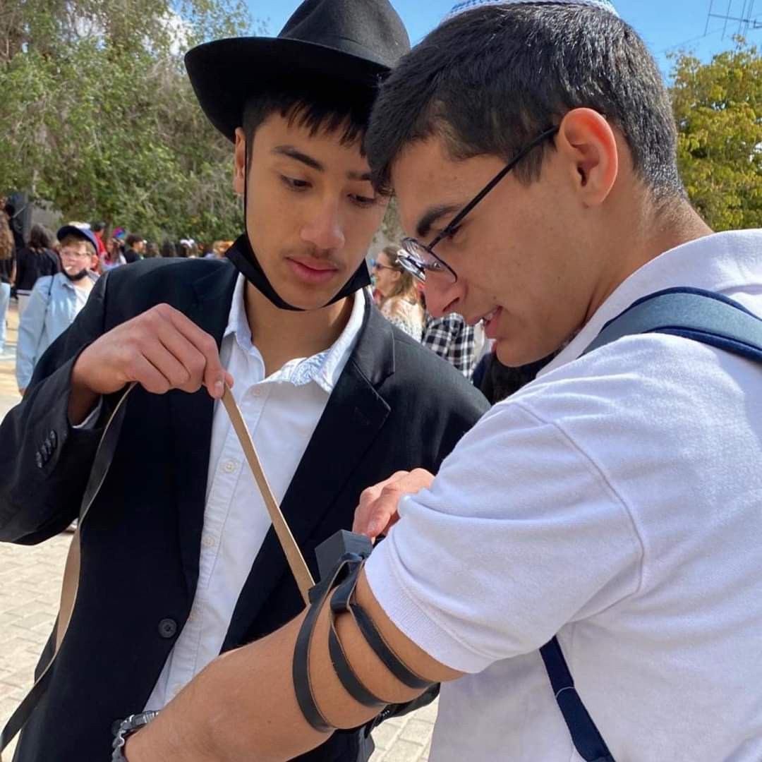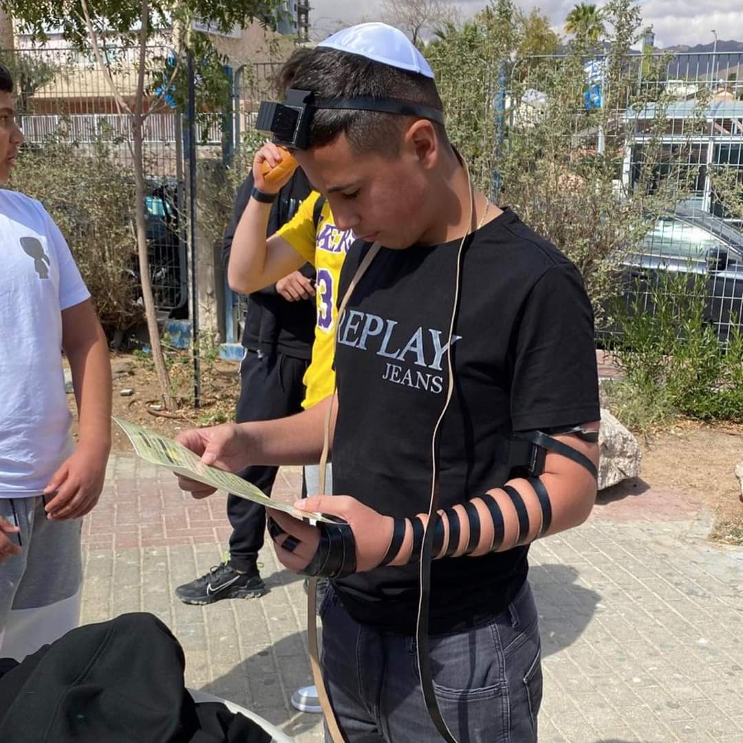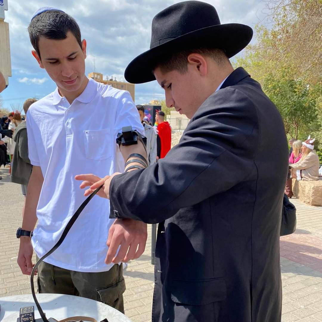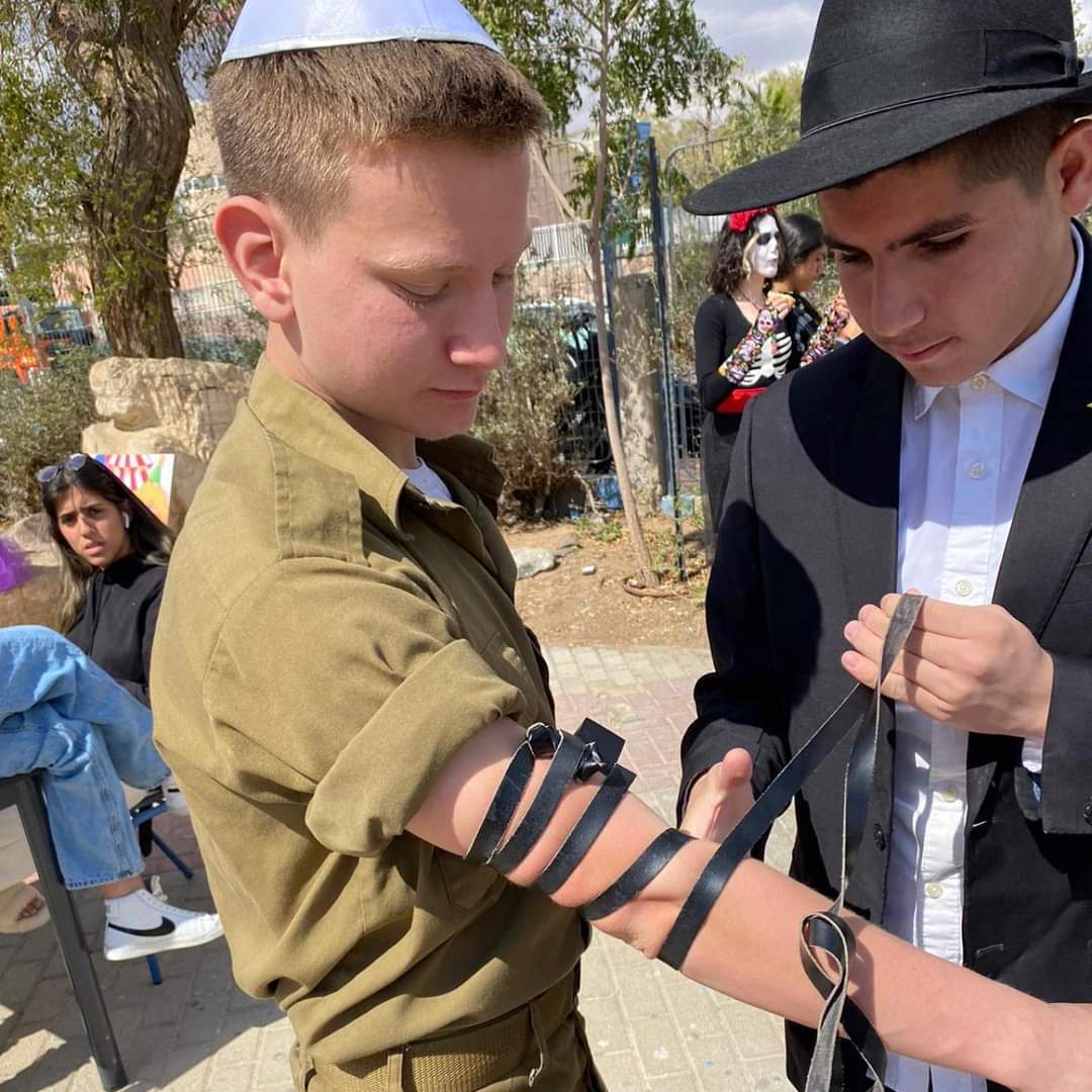 2 תלמידים מתיכון בעיר אילת בלבוש חרדי הקימו דוכן תפילין באמצע יריד פורים בתיכון. "התחפשנו לשלוחים" הם סיפרו לחבריהם שבין דוכן איפור לצילום ליד חפש את המטמון גילו את התוכן הפנימי של הצעירים בהפשלת השרוול לקיום המצווה.