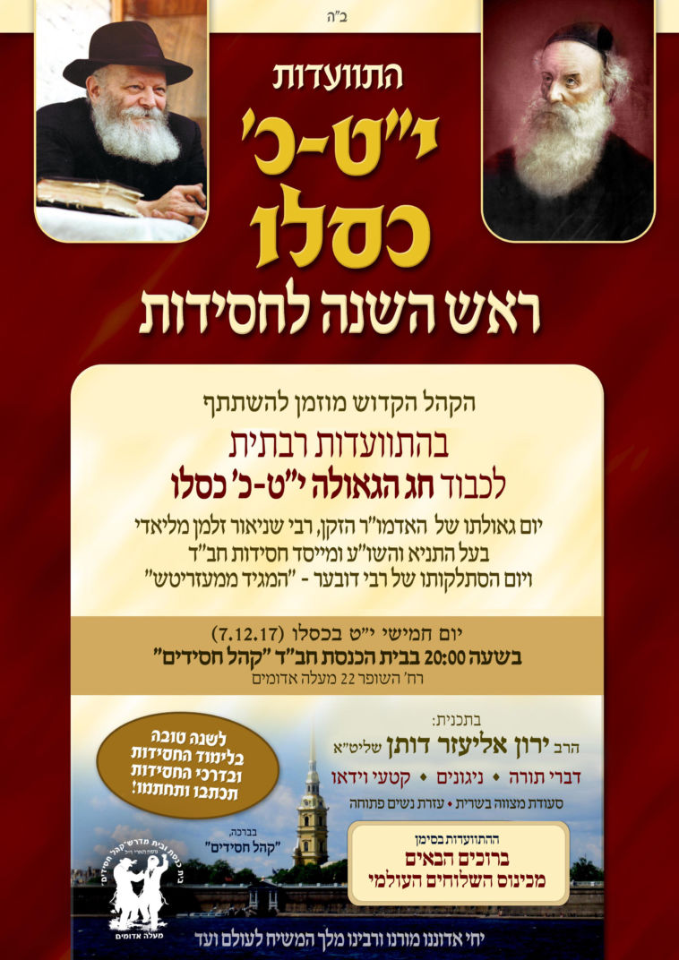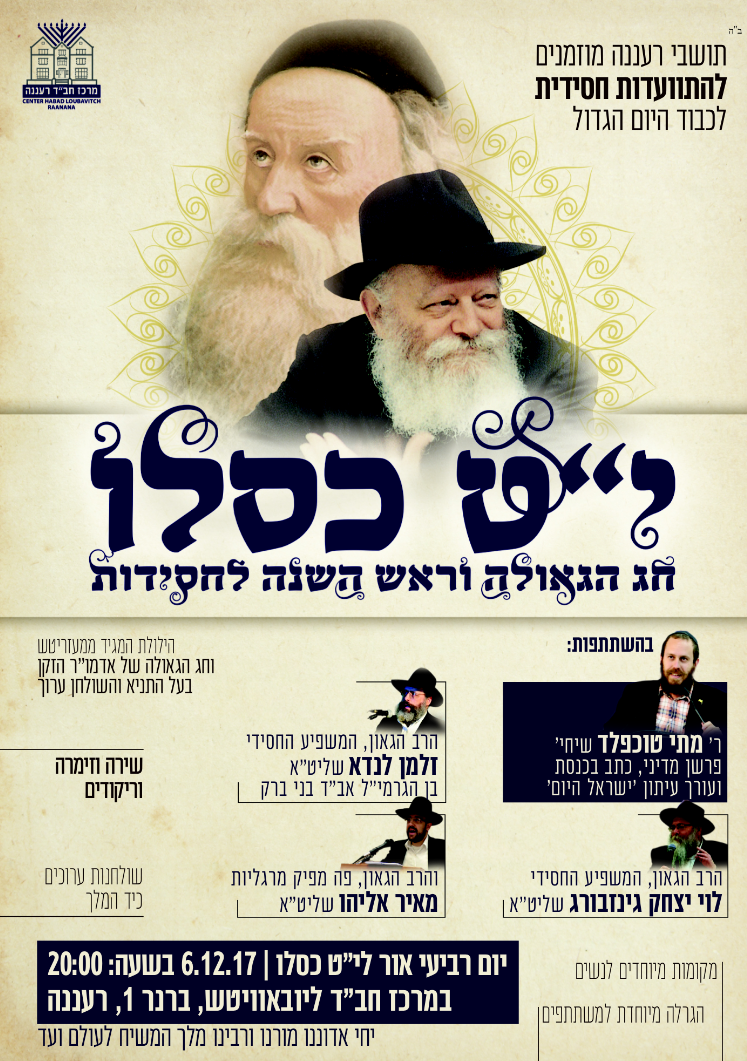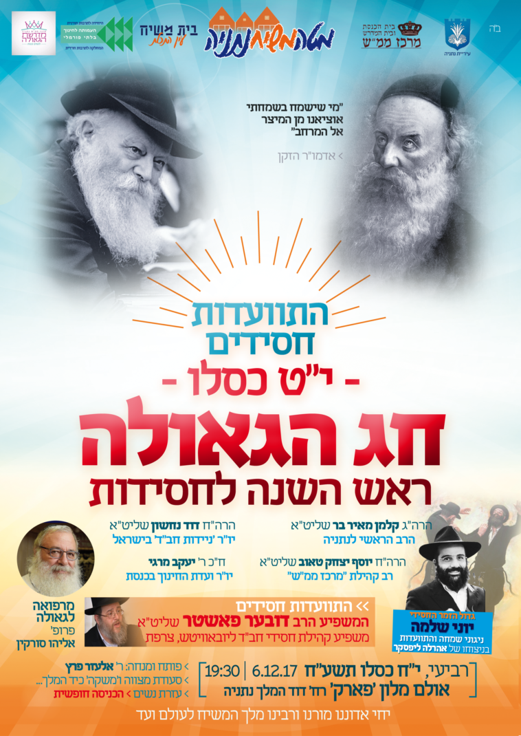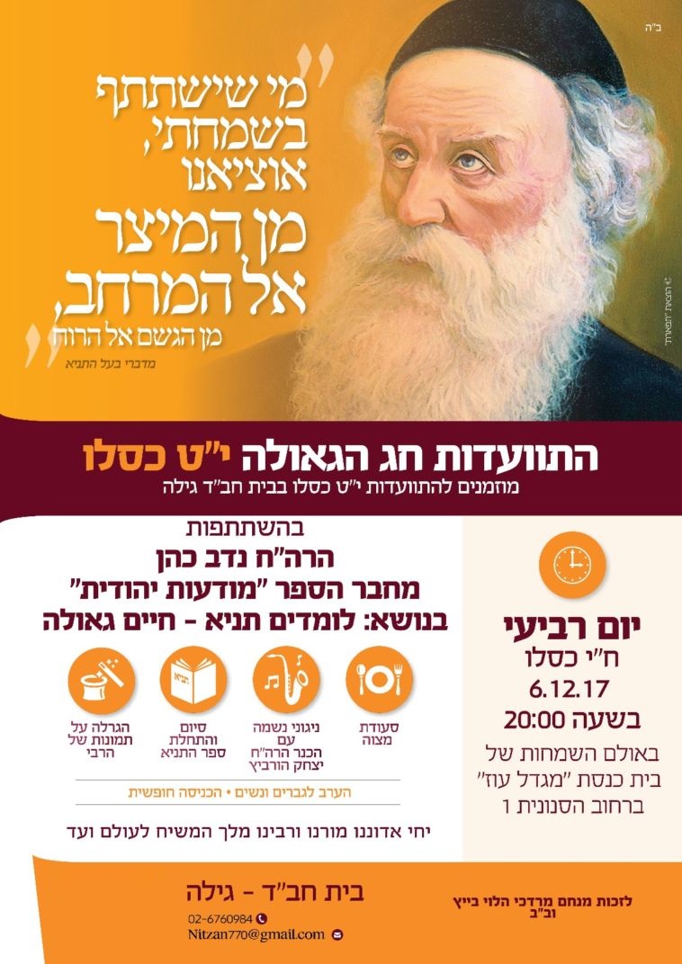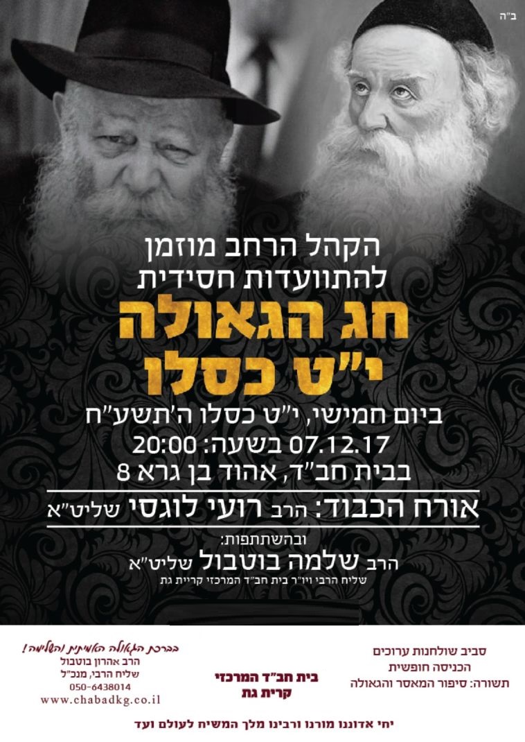 לקראת י"ט-כ' כסלו חג הגאולה של כ"ק אדמו"ר הזקן מליובאוויטש, ע"פ הוראת כ"ק אדמו"ר מלך המשיח שליט"א, חסידי חב"ד ליובאוויטש בפרט והעולם היהודי בכלל, נערכים לימים אלו ע"י עריכת התוועדויות וכד' • אתר הגאולה מגיש את המדריך המיוחד המפרסם במרוכז את כל האירועים • ניתן לשלוח לאימייל www.hageula.com@gmail.com • לצפייה