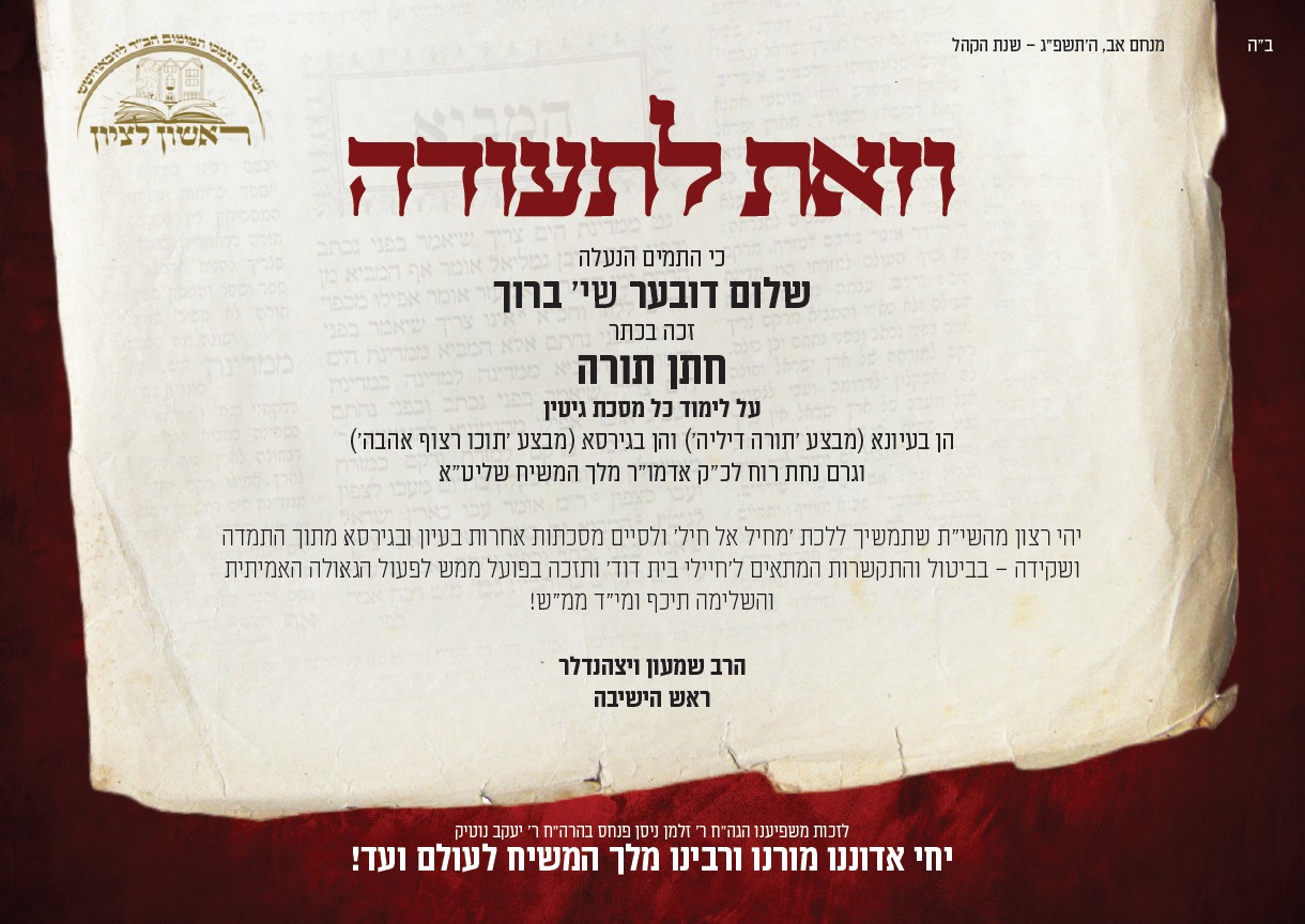 "'הדרנים' הוא מושג שכיח וקדוש בתורתו של כ"ק אדמו"ר מלך המשיח שליט"א. כל התוועדות מרכזית במרכזה נמצא ה'הדרן'. השנה זכתה ישיבת תות"ל ראשל"צ וכשלושים תמימים זכו לסיים את המסכת הנלמדת – מסכת גיטין!