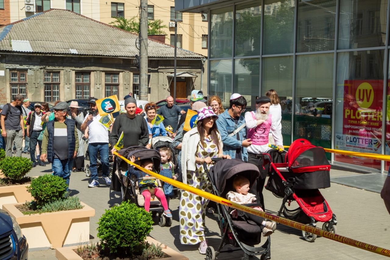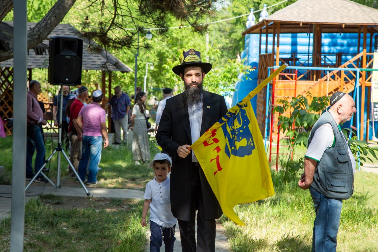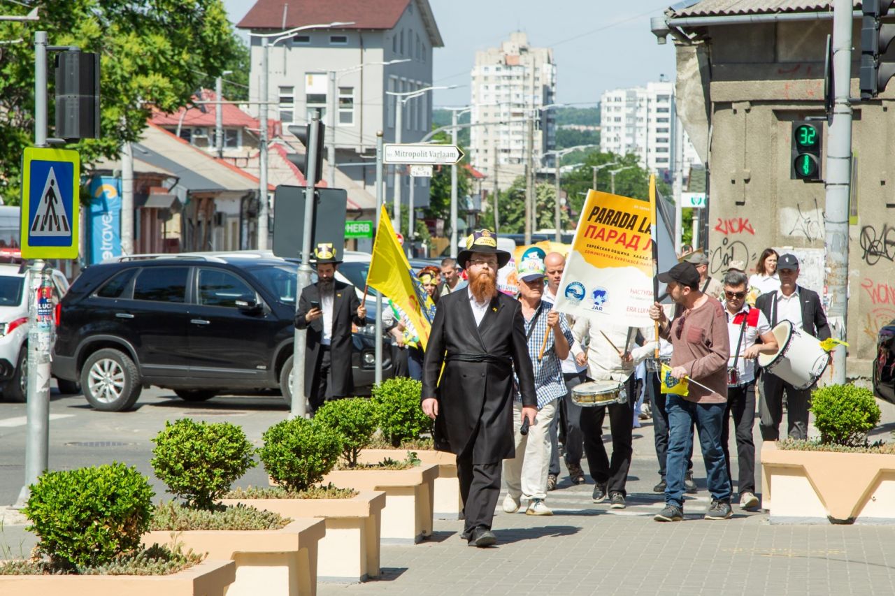 בראש התהלוכה שלט ברומנית, בנוסף לשלטים ברוסית ועברית, ודגלי משיח.