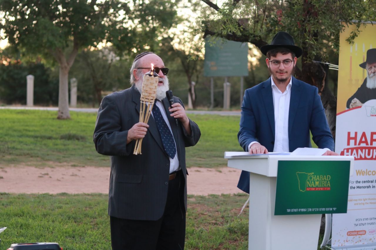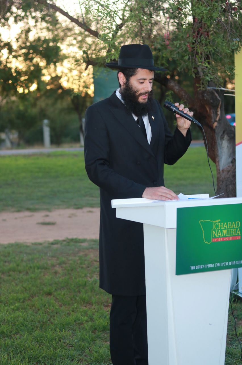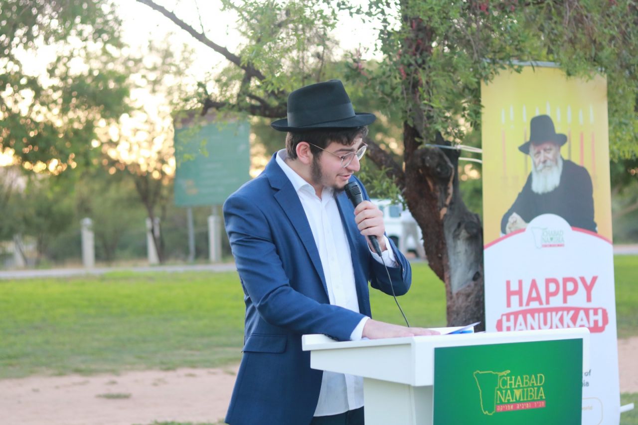 שליח הרבי מלך המשיח שליט"א לנמיביה, הרב יוסף רחימי, פתח את ההדלקה בדברי חיזוק, על הכוח של כל אחד לנצח את החושך על ידי מעשה טוב אחד קטן. ואמירת פרק תהילים לזכות עם ישראל וחיילי צה"ל.
