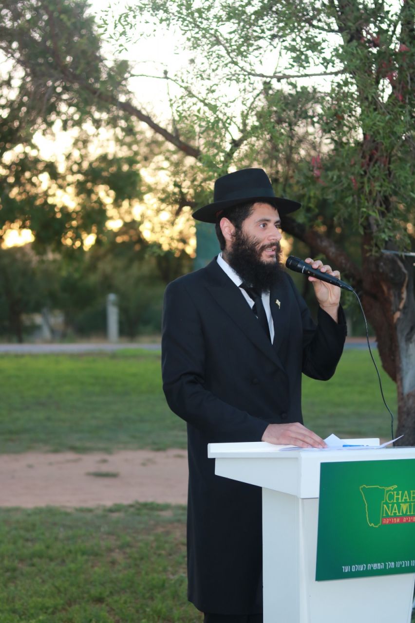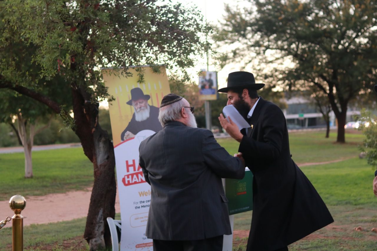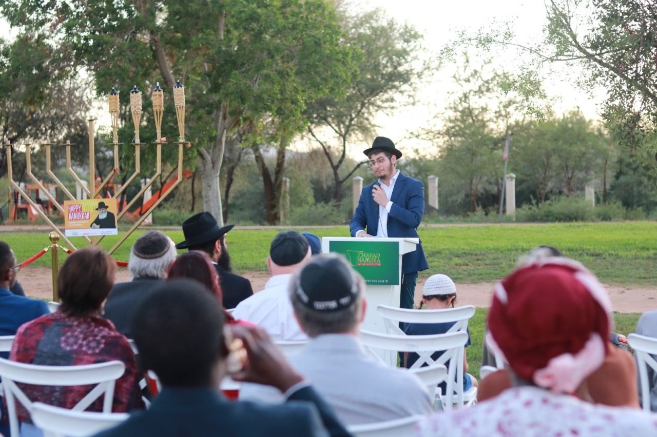 שליח הרבי מלך המשיח שליט"א לנמיביה, הרב יוסף רחימי, פתח את ההדלקה בדברי חיזוק, על הכוח של כל אחד לנצח את החושך על ידי מעשה טוב אחד קטן. ואמירת פרק תהילים לזכות עם ישראל וחיילי צה"ל.