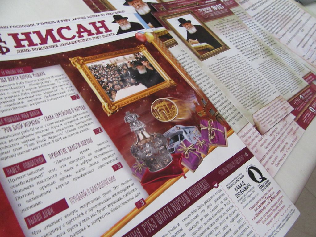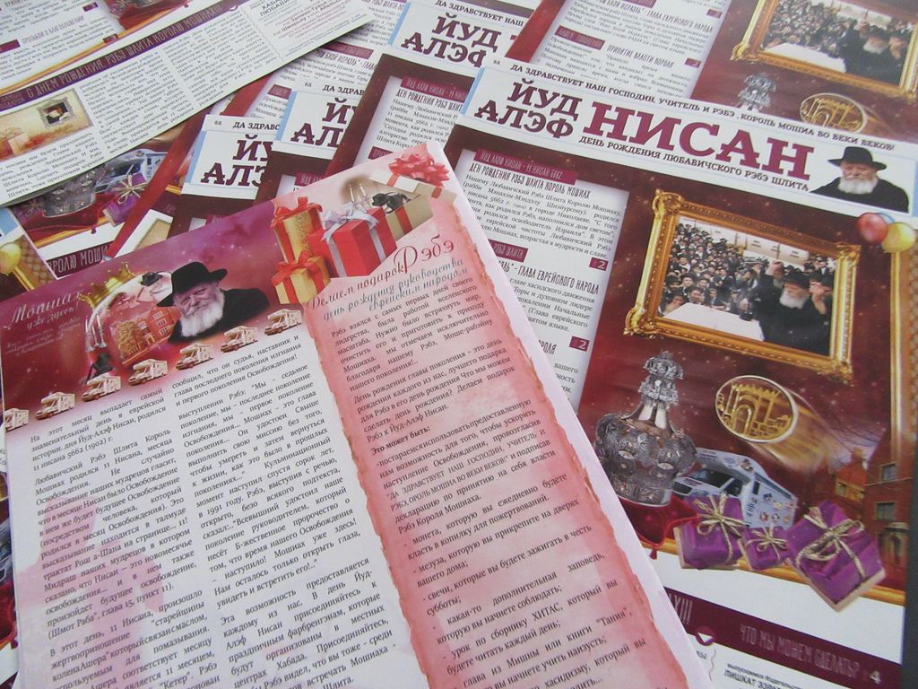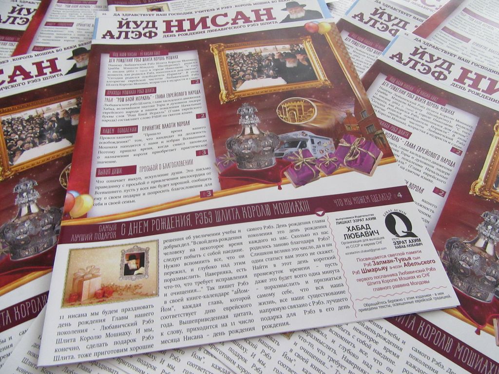 מגזין איכותי 'יו"ד אלף ניסן', המסביר על מהותו של יום, לידת ראש בני ישראל, קבלת המלכות, כתיבה לרבי, ונתינת מתנות רוחניות לנשיא הדור לקראת יום הולדתו, בהוספה במצוות לקבלת פני משיח, הופץ ביום הולדת מלכנו, ליהודים רבים בכל רחבי תבל ובארץ הקודש ע"י לשכת 'עזרת אחים - חב"ד ליובאוויטש' ליהודי חבר העמים ויוצאי ברית המועצות. הקוראים היקרים התרשמו במאוד מהעיצוב יוקרתי ומכובד. ושמחו לקבל מגזין איכותי בשפה הרוסית, הפעילים מספרים כי רבים הודו נרגשות על חומר ברוסית וקראו בהתעינות רבה במאוד.