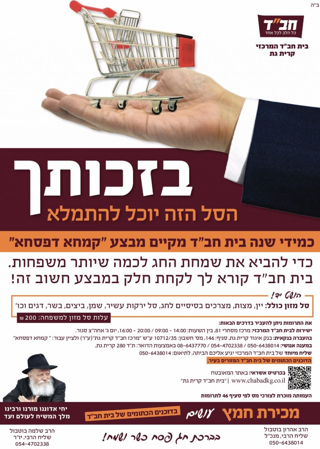 בית חב"ד המרכזי קרית גת בראשות השליח הרב שלמה בוטבול ובניהולו של השליח הרב אהרון בוטבול מסכם בהצלחה את מבצע פסח הכולל: 3000 ילדים במאפיית המצות הניידת, חלוקת 3000 מצות לחיילי צה"ל וכוחות הביטחון, דוכני מכירת חמץ ברחבי העיר אשר מכרו חמץ ל10,000 איש, הגעלת כלים, התוועדויות וכינוסים לכבוד י"א ניסן, חלוקת קמחא דפסחא לנזקקים, ליל הסדר ציבורי, וקמפיין ענק על שירות הבית חב"ד במשך כל השנה.