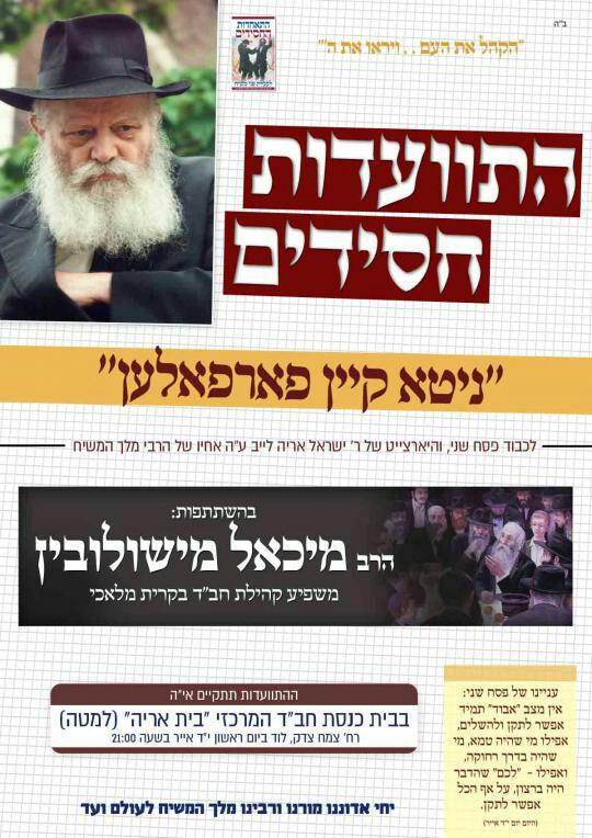 במסגרת התוועדויות "הקהל" של "התאחדות החסידים", לרגל י"ג אייר ופסח שני, התוועד אתמול (ראשון) הרב מיכאל מישולובין, משפיע אנ"ש בנחלת הר חב"ד, בבית כנסת "בית אריה" לוד.