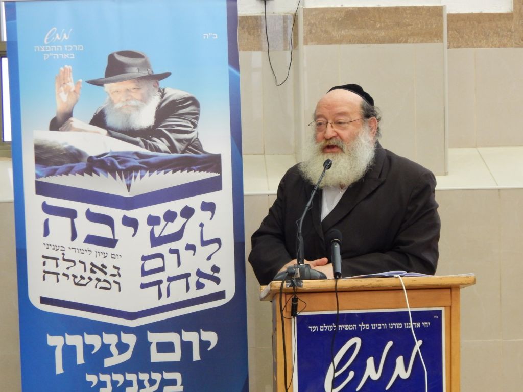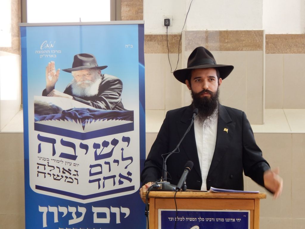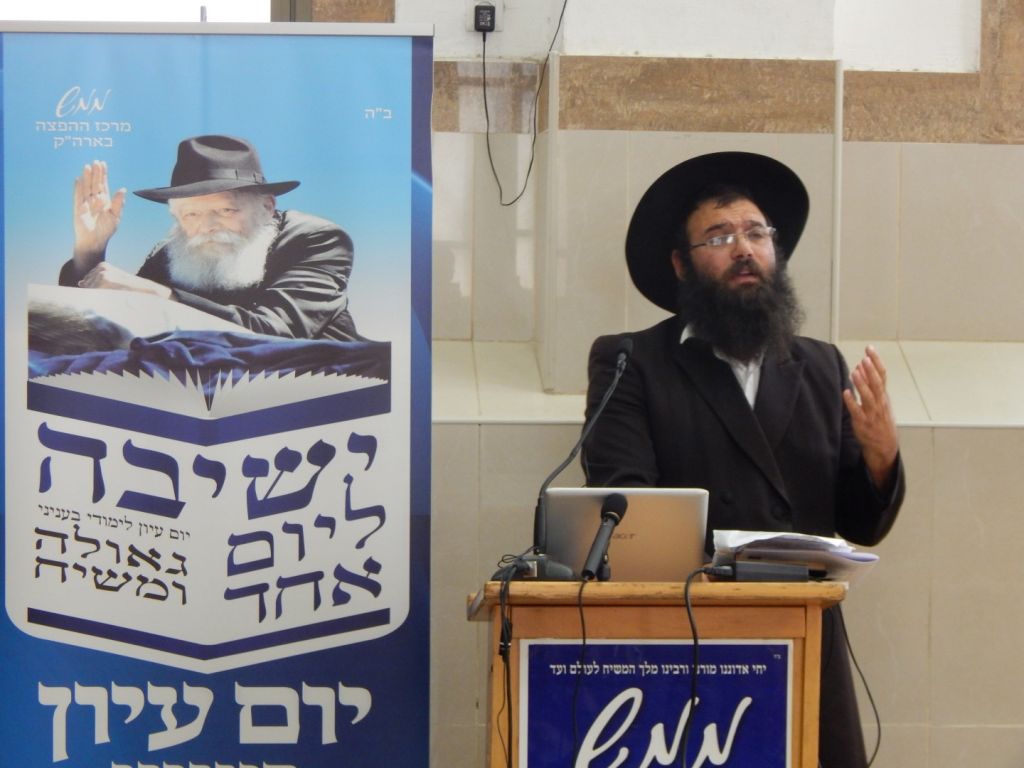 הפוגה לתפילת מנחה המונית, ארוחת צהריים קלה, וכבר מודיעים בחדר האוכל כי אורח היום כבר מגיע הלא הוא הרב החיד"א אברג'ל בנו של המקובל רבי יורם אברג'ל זצ"ל מנתיבות. הרב אברג'ל פותח על מעלתו של יום העיון והפעולה השמיימית שהדבר פועל בקירוב הגאולה. הוא מזכיר את חתימת אביו על פסק הדין שהרבי הוא משיח ועובר לביאור מעלת וקדושת ספר התניא ובעיקר הפצתו תוך ששוזר בדבריו עובדות מופלאות מהקשרים של אביו עם כ"ק אדמו"ר מלך המשיח שליט"א. הקהל המרותק שומע את הדברים המרוממים וללא שהות עובר לשיעור עיוני מעמיק מפי הרב יהושע נויהויזר ר"מ בישיבה גדולה חב"ד אור יהודה. הנושא: גדר היום טוב שיהיה בתשעה באב בימות המשיח. הוא מתפלפל ומצליח לשתף אתה קהל בחילוקים עיוניים בדברי החתם סופר והמנחת חינוך.