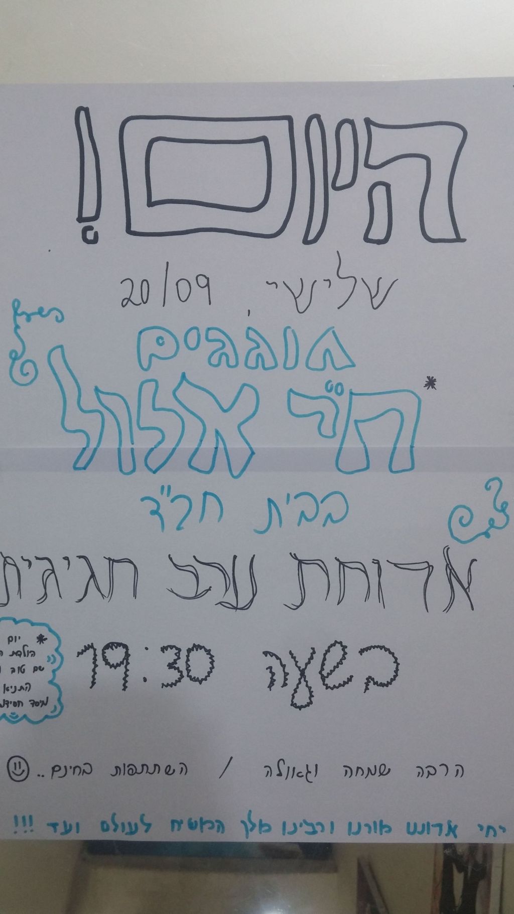אז ככה בכל ערב בבית חב"ד יש שיעור תורה בתוספת כיבוד עשיר של פירות העונה - מנגו, אננס, פאפיה, צ'ילי ועוד..לרגל ח"י אלול חשבנו שצריך לעשות שידרוג, הכנו תפריט בבוקר והגשנו לעובדים (תבינו בבית חב"ד אין ארוחות, יש תפריט קבוע של מסעדה וכל אחד יכול להזמין אבל ברגיל חוץ מסעודות שבת אין ארוחה מתוכננת מראש..) כבר בתחילת היום גיטי הכינה מודעה מדהימה בכתב יד על ההתוועדות, וכמה שעות לאחרי זה אחד הבחורים ש'ידיו רב לו' הכין משהו יפה במחשב ו...הדפסנו.
