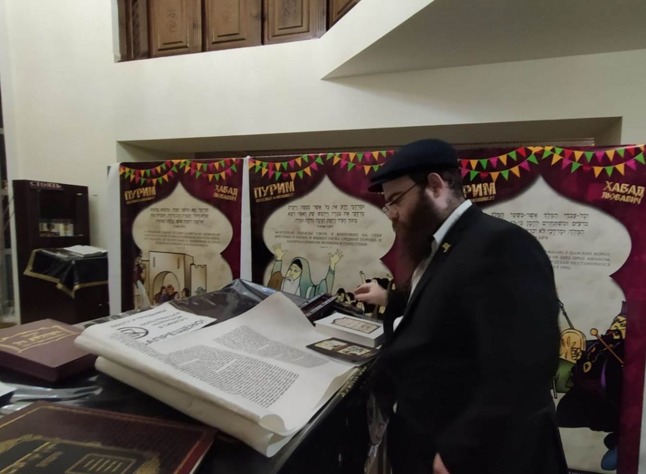 מיד לאחר מכן שמעו בהקשבה מלאה את קריאת המגילה מפי שליח הרבע שליט״א מלך המשיח הרב מנחם מענדל זלמנוב. במהלך הקריאה הוקרן למשתתפים סרט פנטומימה, עם כתוביות ברוסית על סיפור הנס של מרדכי הצדיק. מגילות מרתקות ורעשנים חולקו למשתתפים שהותירו את כולם קשובים ושקטים.