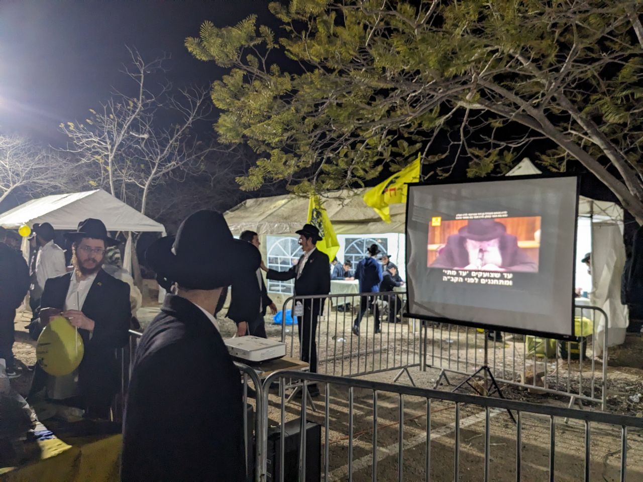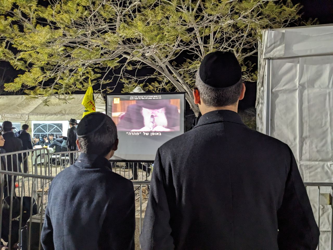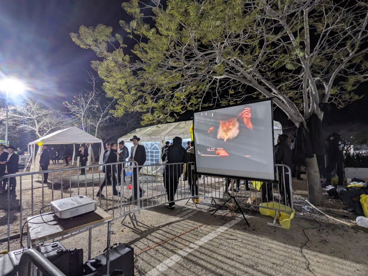 בחזית בשביל המוביל לציון הוצב מסך וידאו ענק ששידר ללא הפסקה קטעי וידאו מהרבי מלך המשיח שליט"א במשך השנים.