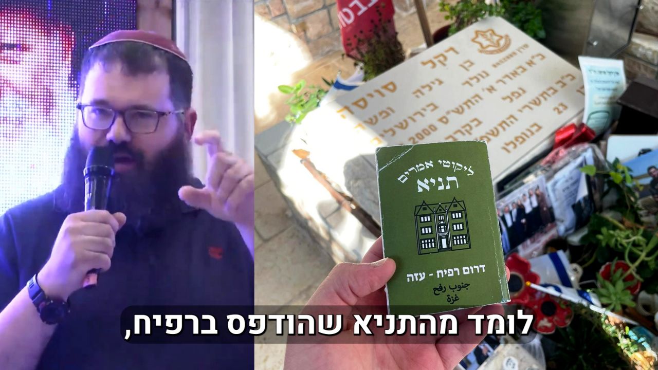 התקשרתי אליו. אמרתי לו, תקשיב, אמרת לי לעדכן אותך לגבי ההדפסות הבאות, אני מדפיס ביום ראשון בעזרת השם בפגה. הוא אומר לי, אתה לא תיכנס תאמין. רגע לוואטסאפ שלך. שלחתי לך הודעה. אני נכנס לוואטסאפ מה לי אני רואה? הוא שלח תמונה של אח של המפקד שנלחם בפגה לומד מהתניא שהודפס ברפיח, על הקבר בהר הרצל, של אח שלו.