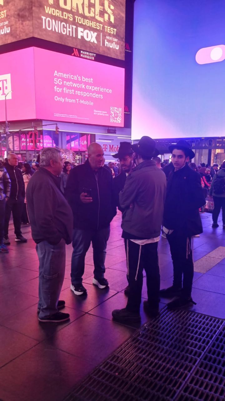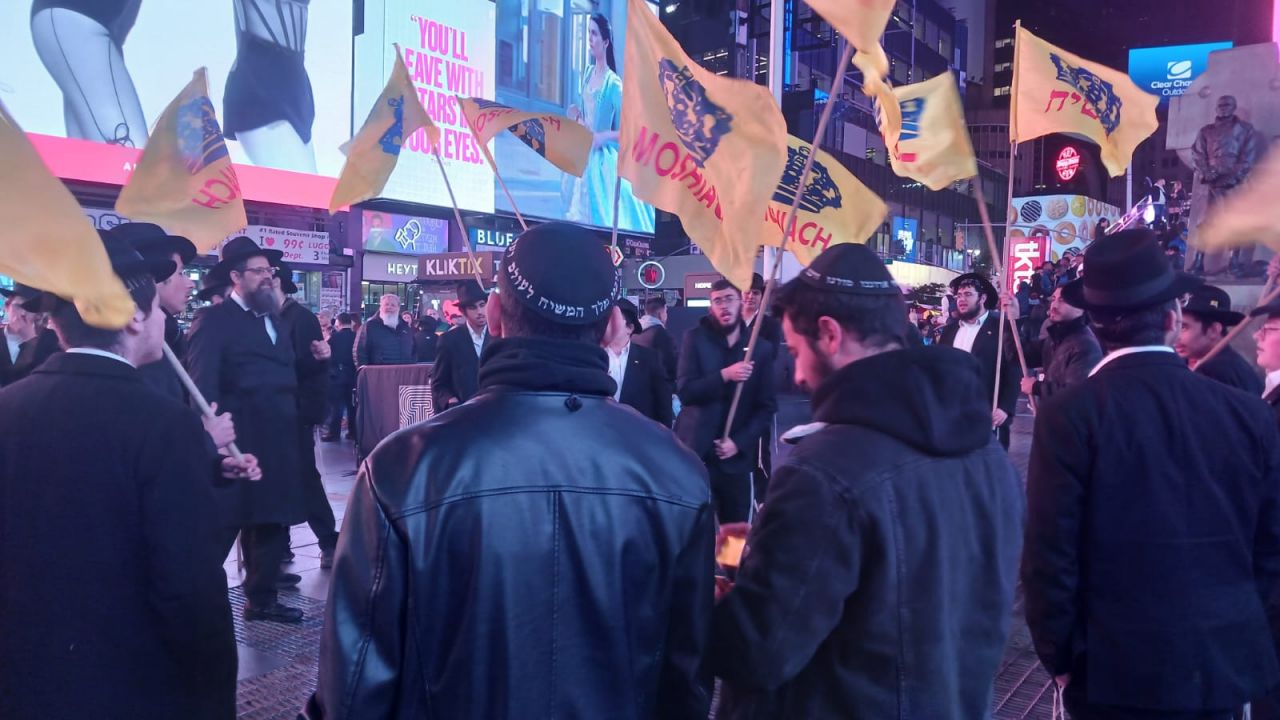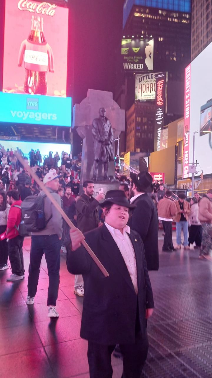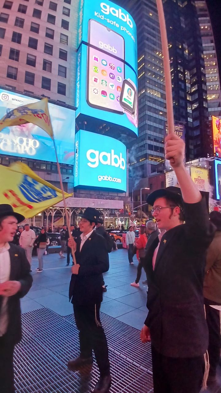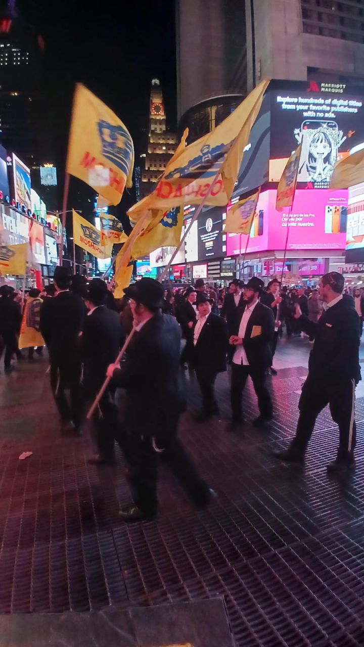 כיכר טיימס סקוויר, הינה אחד המקומות ההורים בעולם כולו. אלפי תיירים גודשים את המקום המואר כשהם מתעדים ומצטלמים למזכרת. כפי שנהוג בשנים האחרונות, יצאו מידי לילה תמימים מ-770 לעריכת שמחת בית השואבה במקום.