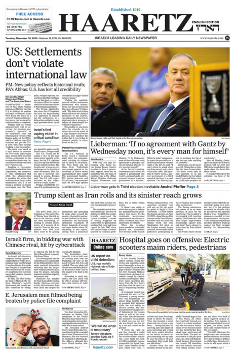 מייק פומפיאו שר החוץ האמריקני בהודעה הדרמטית לתקשורת: ההתנחלויות אינן נוגדות את החוק הבינ"ל ואינן מהוות מכשול לשלום. בהמשך הודעתו מפרט מייק פומפיאו את יחס משרד החוץ האמריקני להתנחלויות בעשרות השנים האחרונות, ואומר: משרד החוץ האמריני בחן מחדש את הסוגיה המשפטית, והגיע להחלטה שההתנחלויות אינן נוגדות את החוק הבינלאומי, ולא מהוות מכשול לשלום.