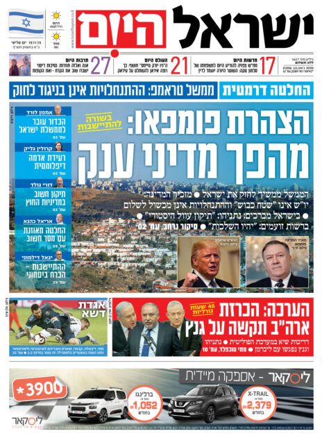 - הודעה זו של מייק פומפיאו, שר החוץ בממשל טרמפ, באה ימים ספורים אחרי ההודעה המבישה של האיחוד האירופי על סימון מוצרים מההתנחלויות. הפוך על הפוך.