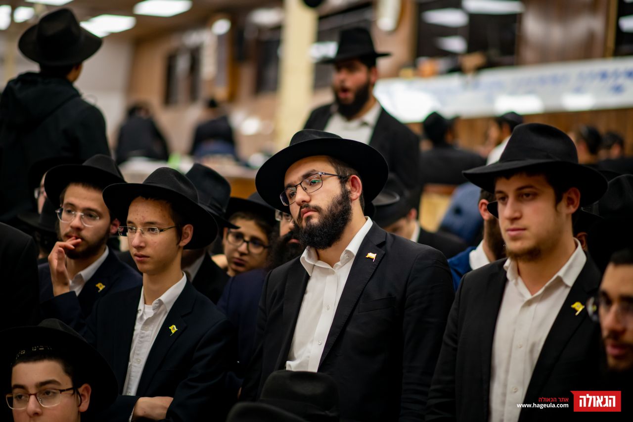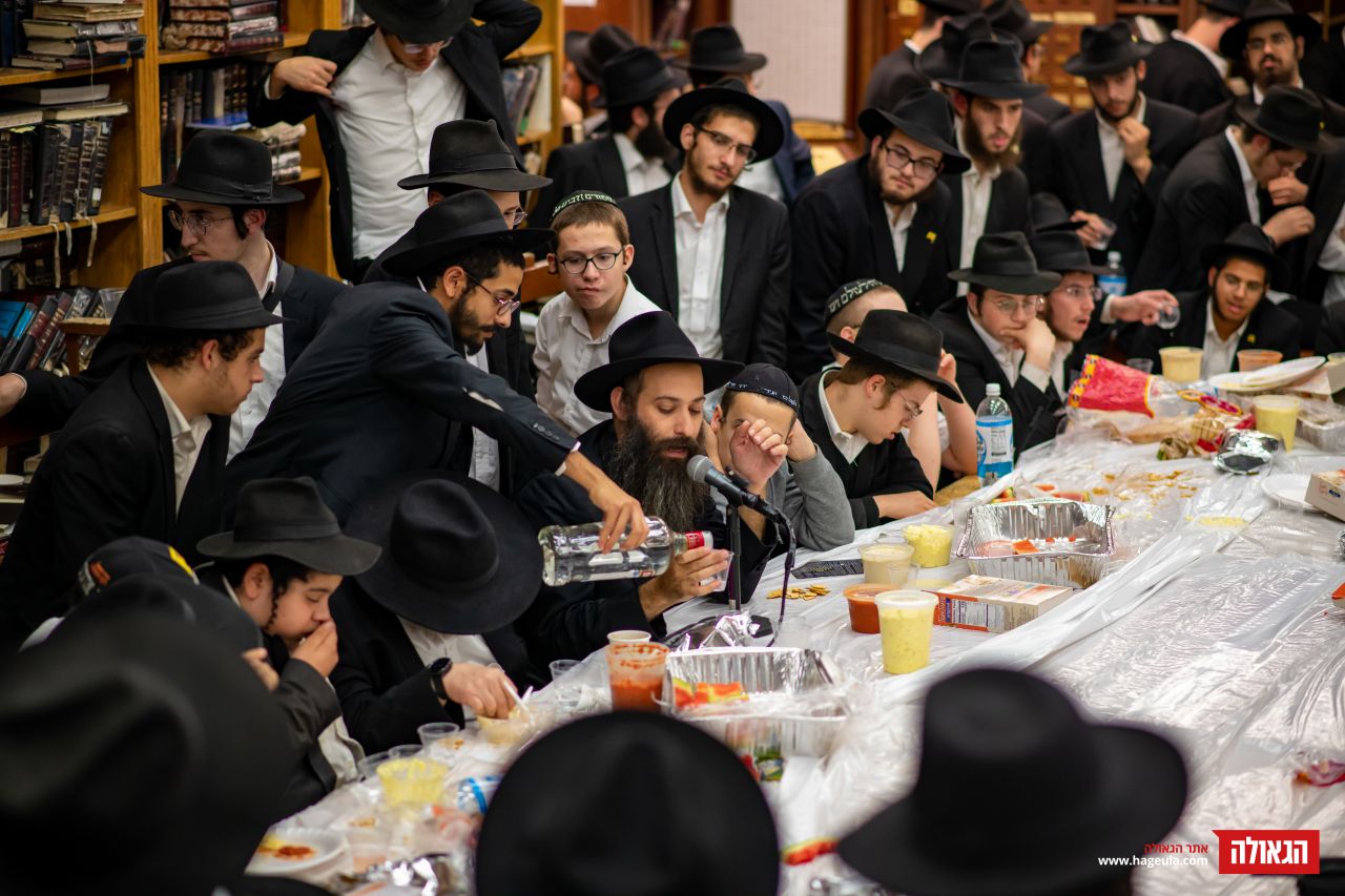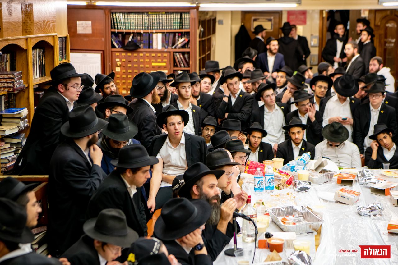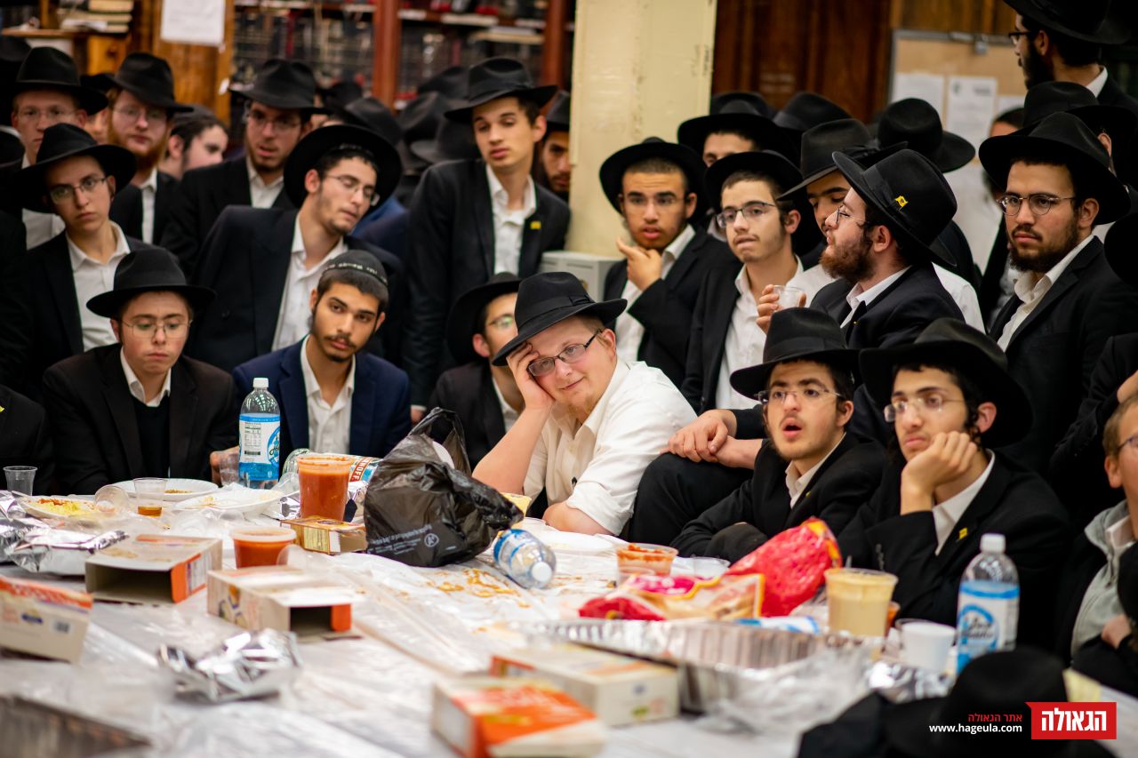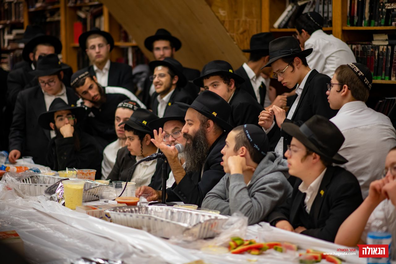 כ-200 בחורים ישבו סביב השולחן והספסלים הסמוכים והאזינו לרבנים בקשב.