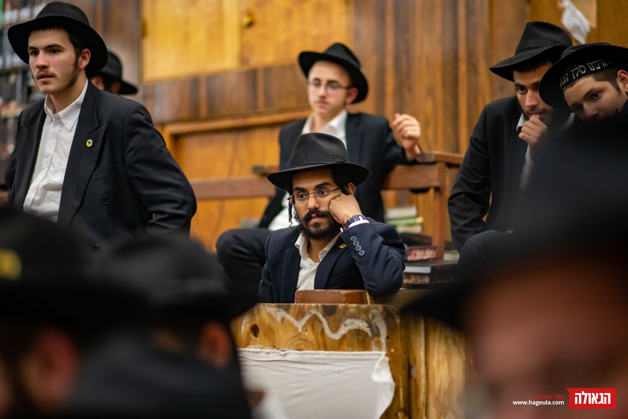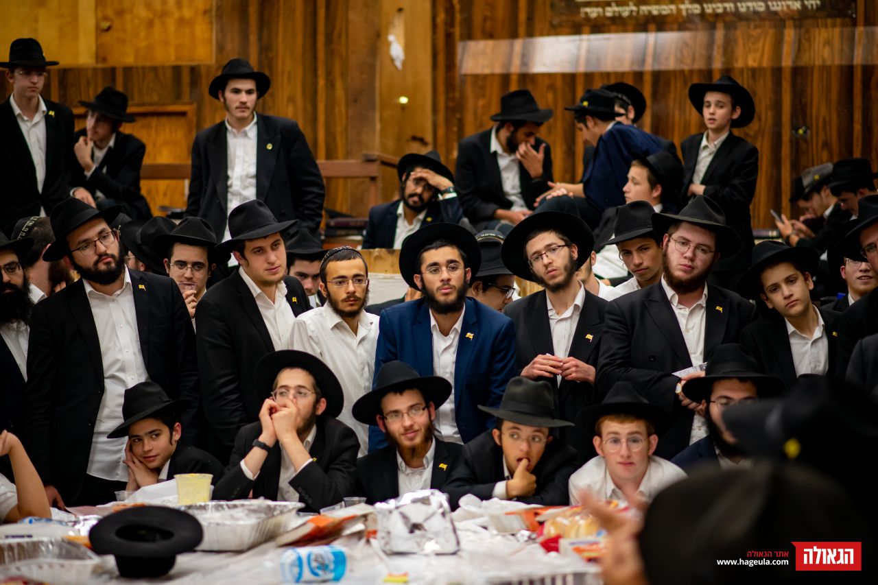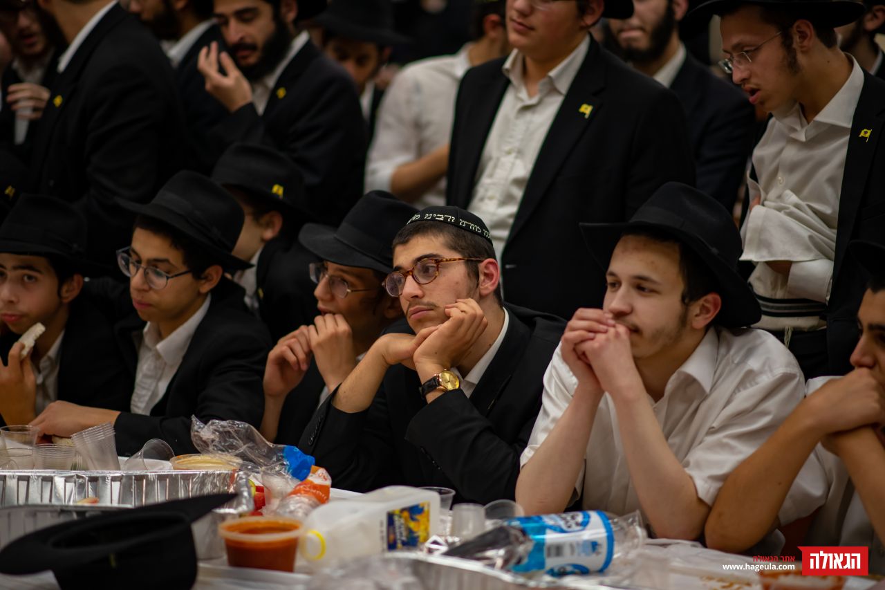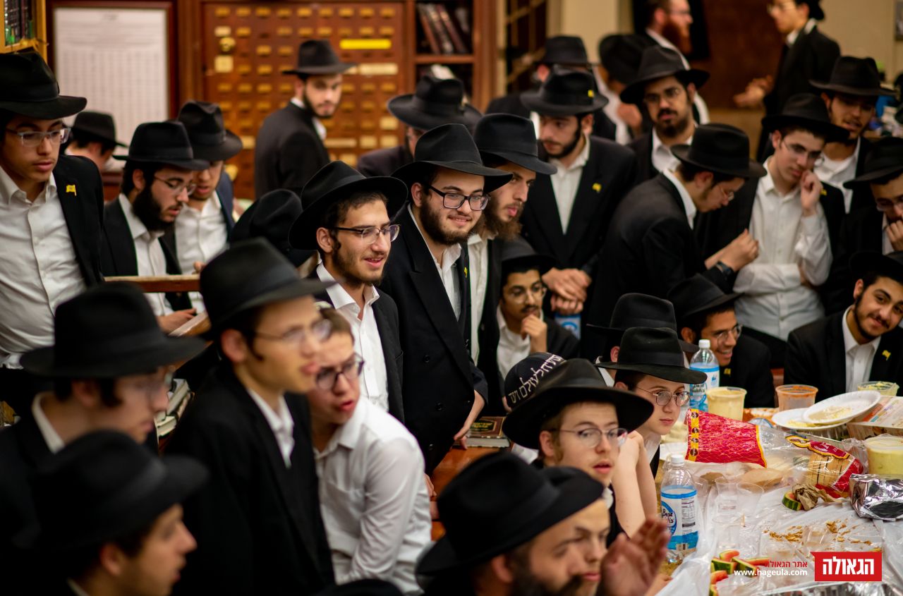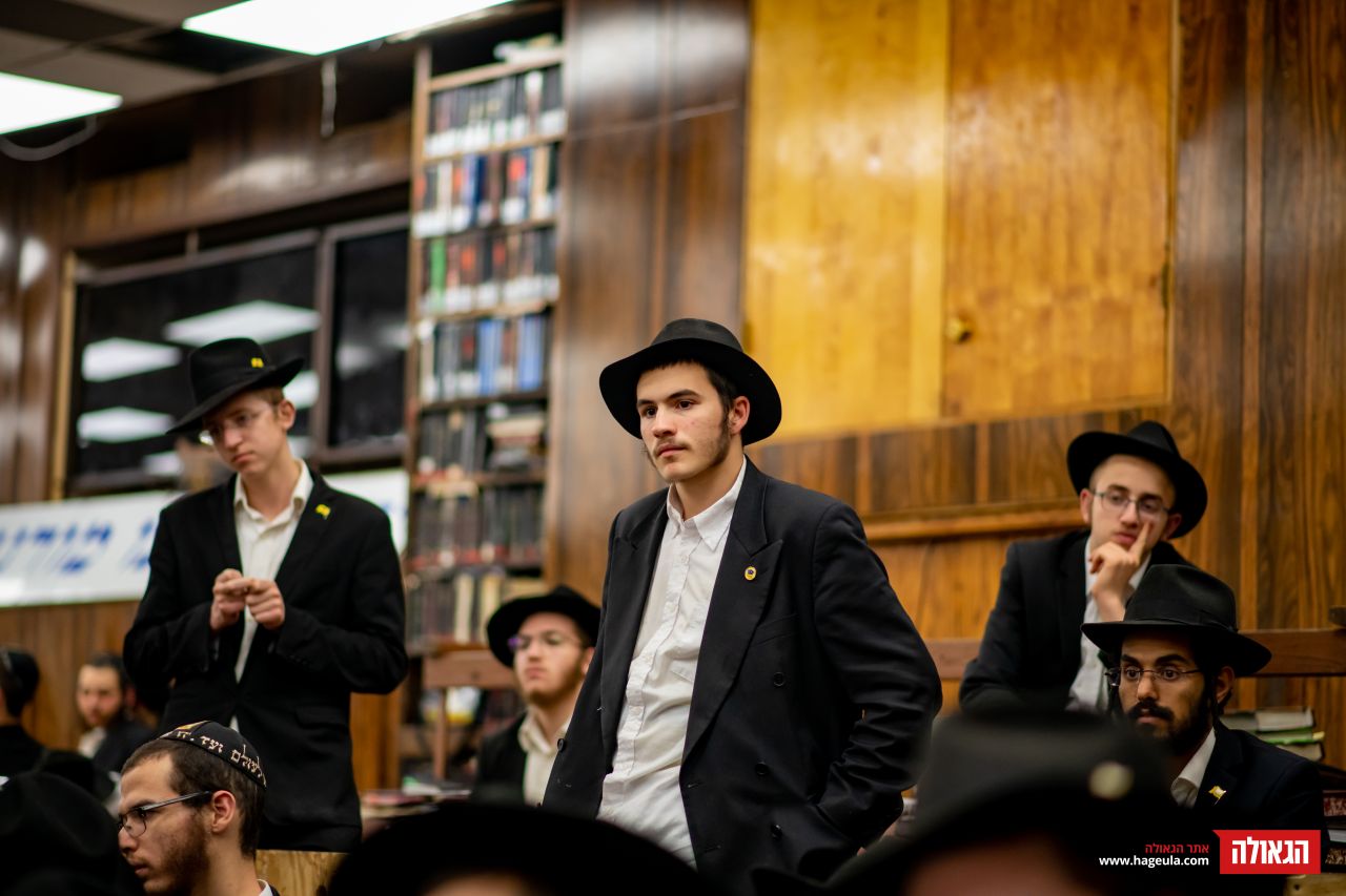 כ-200 בחורים ישבו סביב השולחן והספסלים הסמוכים והאזינו לרבנים בקשב.