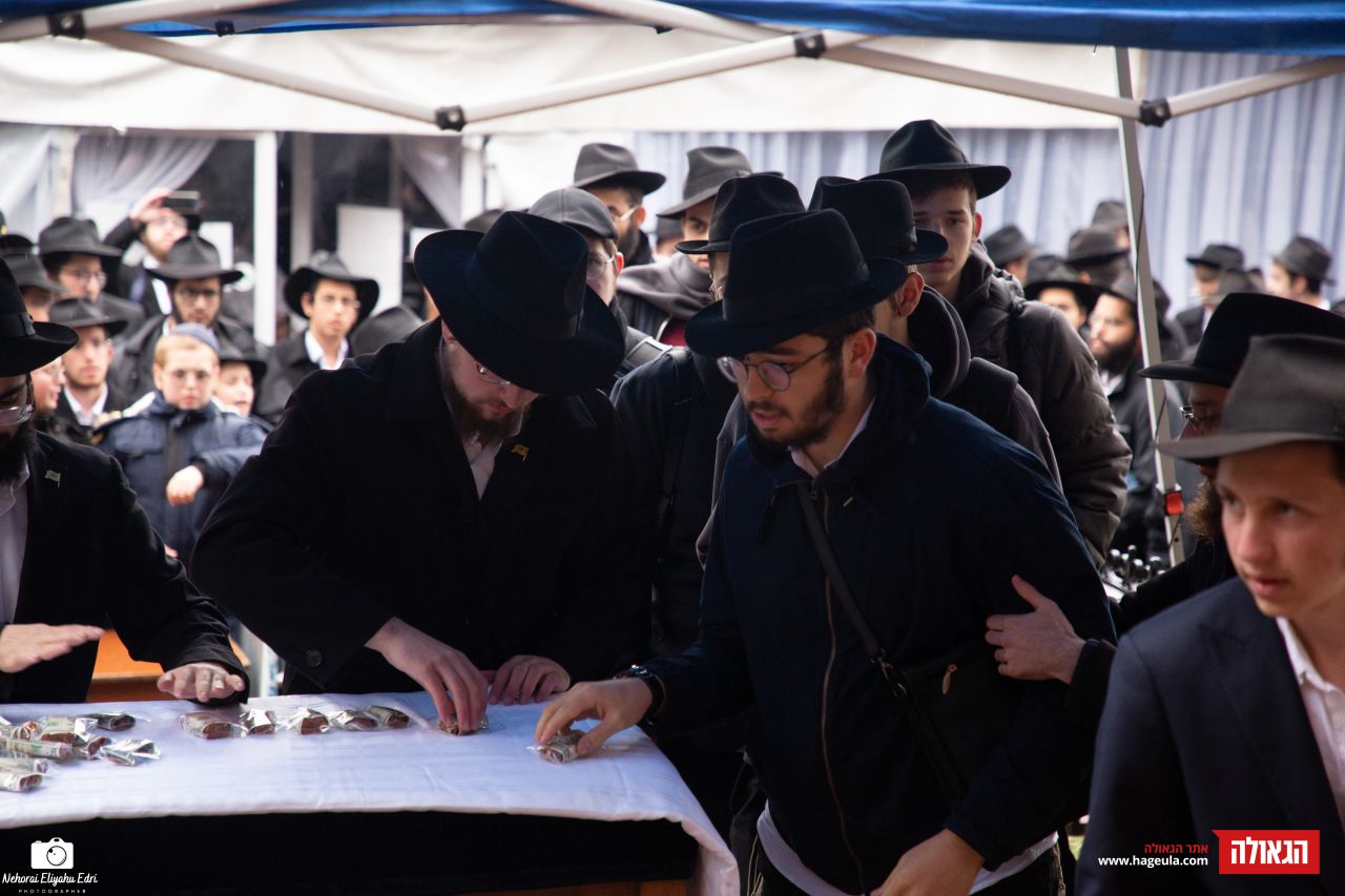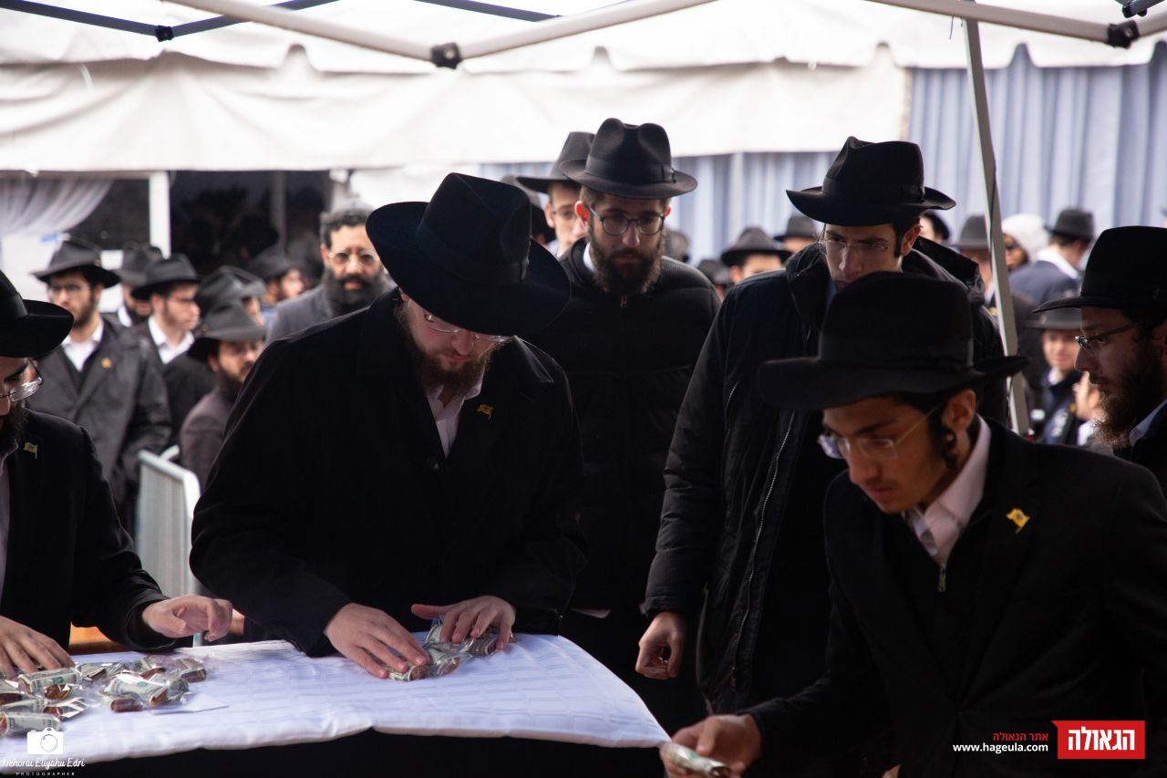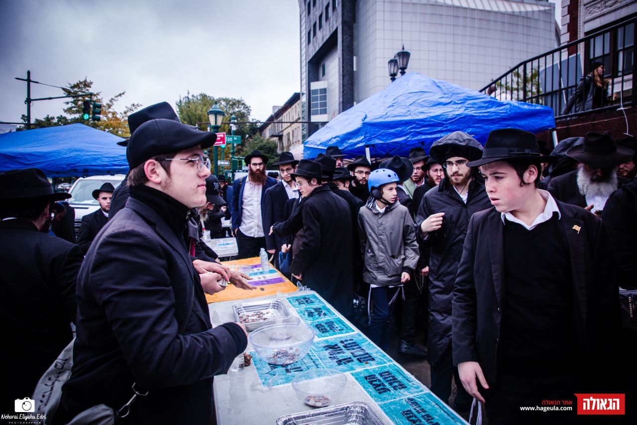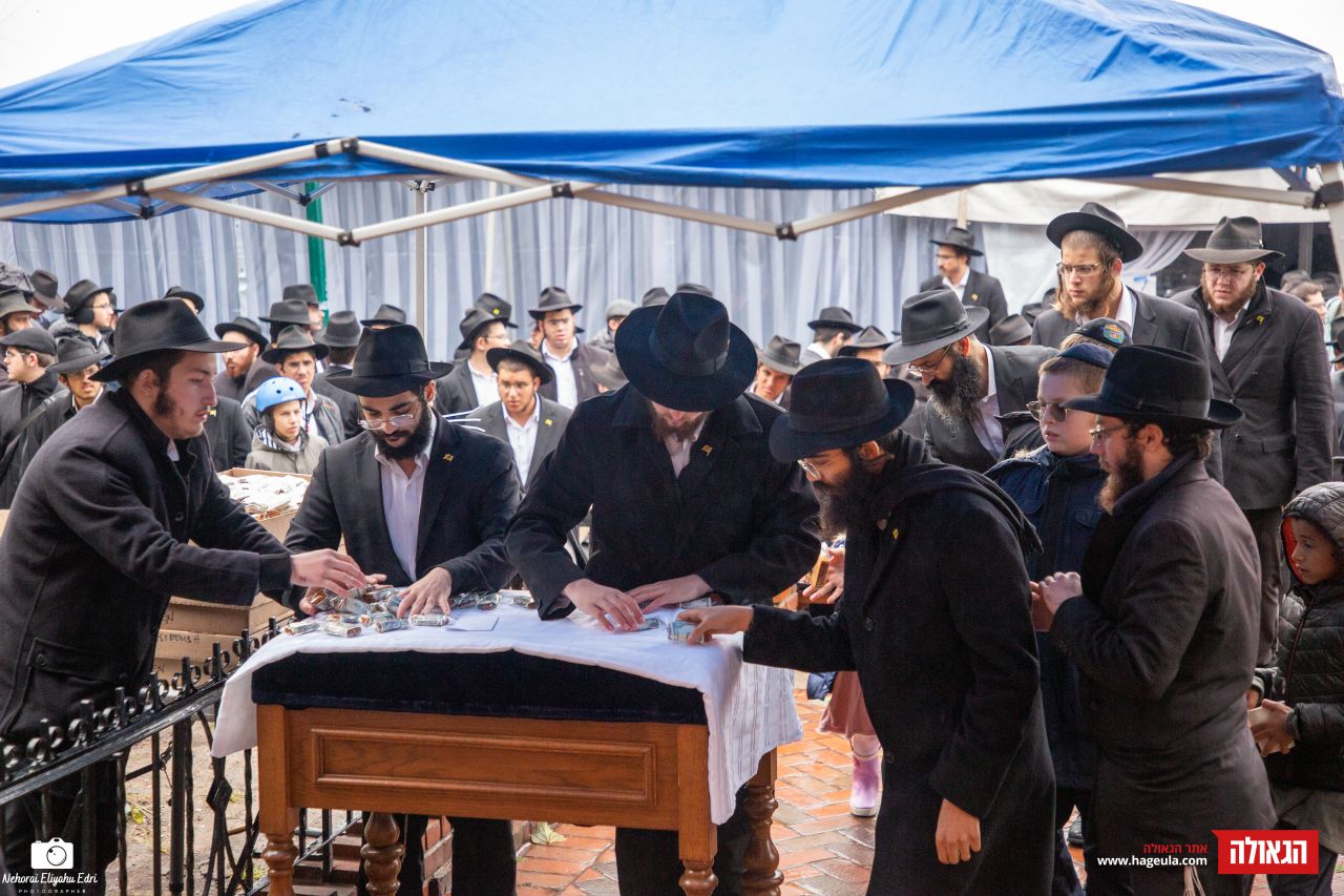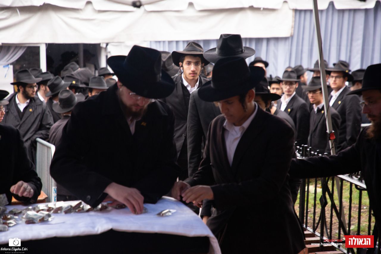 לאחר כעשרים דקות החל הרבי מלך המשיח שליט"א לחלק לקהל האלפים פרוסת 'לעקאח' - עוגת דבש בצירוף שטר של דולר, כפי מנהג חב"ד. לאחר תור הגברים, עברו גם מאות נשים לקבל 'לעקאח'.