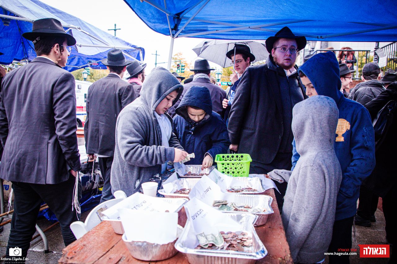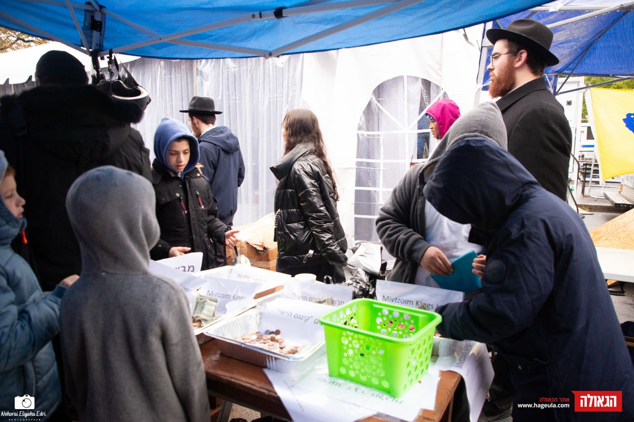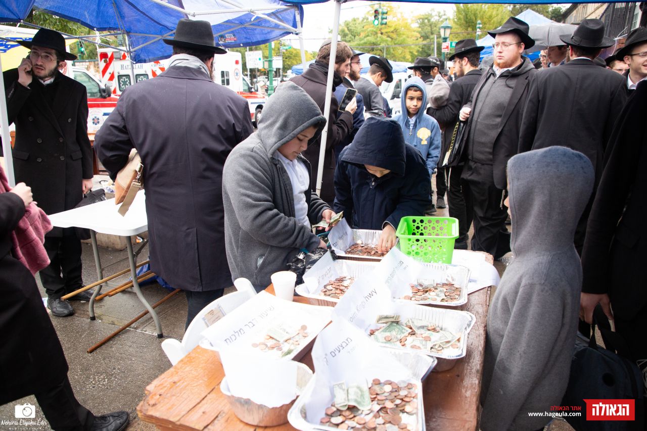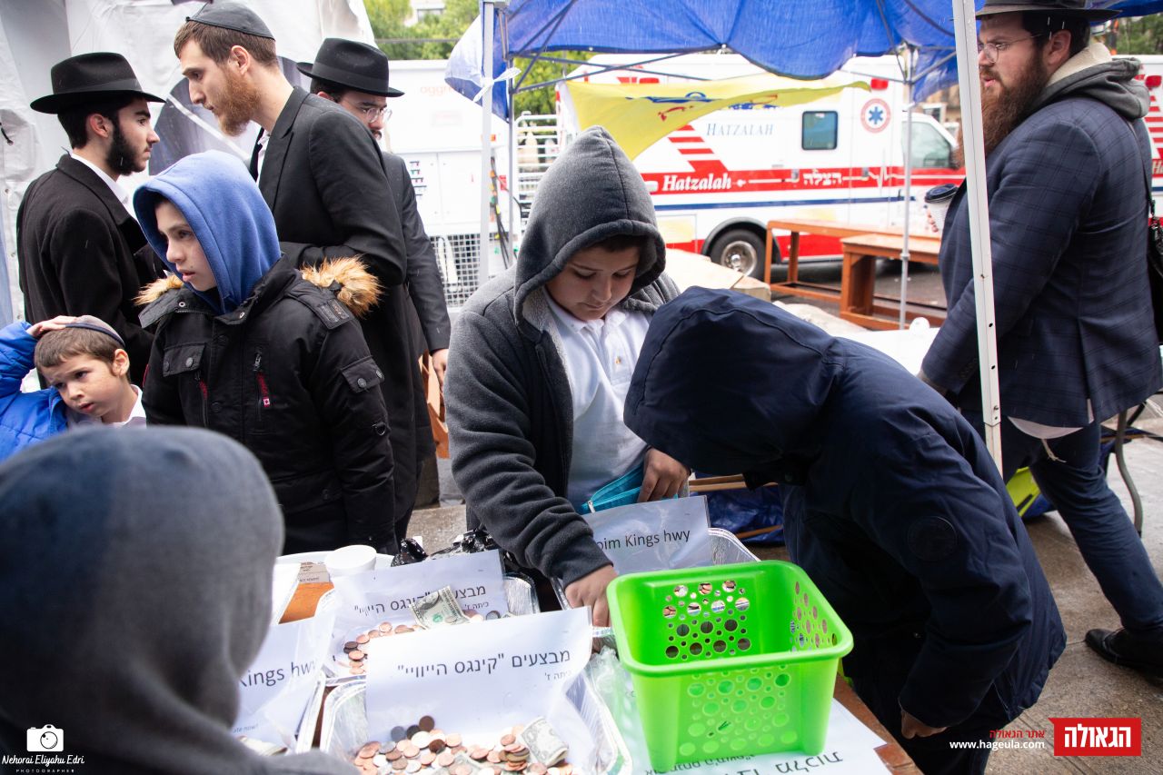 לאחר סיום התפילה החל הקהל לצאת החוצה, שם עמדו דוכנים רבים למתן צדקה עבור מוסדות חינוך והפצת משיח. כולם משלשלים מטבע או שטר לקופות הצדקה.