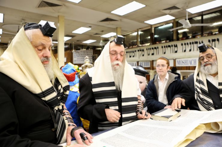 את המגילה קרא כרגיל הבעל-קורא ר' מיכאל שי' סלאַווין, והקריאה ארכה 48 דקות. (מהשעה 6:32 עד השעה 7:16). בסיום התפילה הכריזו החיילי צבאות ה' יחי כרגיל. ר' זלמן שי' ליפסקער הודיע על מועד תפילת שחרית, ונפתח השביל ליציאת כ"ק אדמו"ר מלך המשיח שליט"א מביהכ"נ.