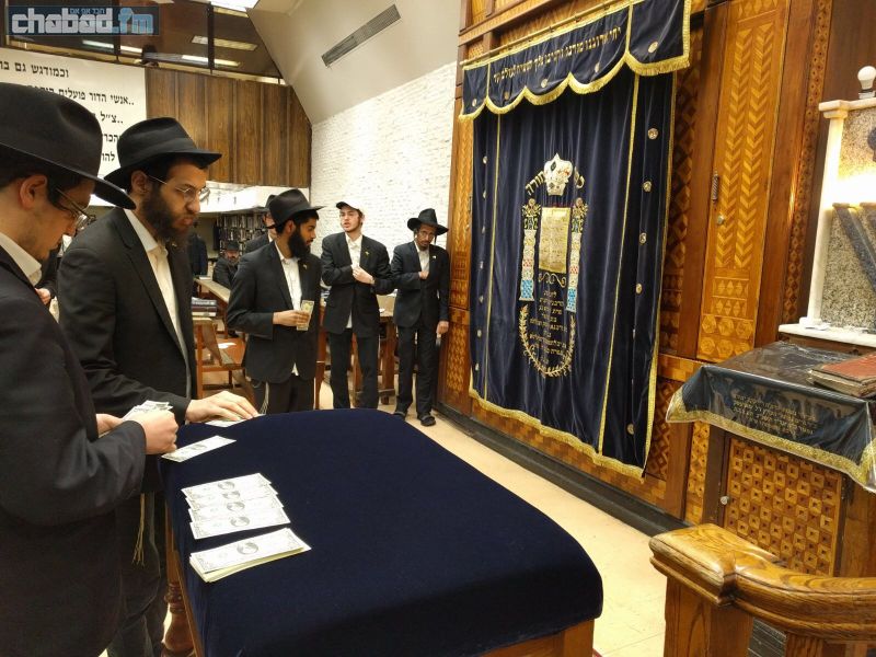 כמנהג ישראל מקדמא דנן, נעמדו מאות מאנ"ש ותלמידי התמימים לקיים את מנהג "מחצית השקל" לפני תפילת מנחה בבית משיח 770 על המטבעות שבהם השתמש כ"ק אדמו"ר מלך המשיח שליט"א. הגבאים העמידו את המטבעות ליד בימת הקריאה והקהל הגדול פדה אותם ונתנו את התמורה תרומה לבית משיח 770.