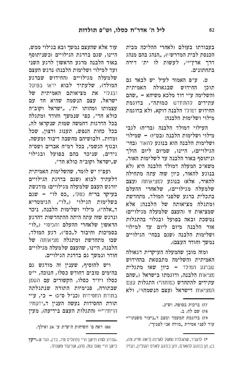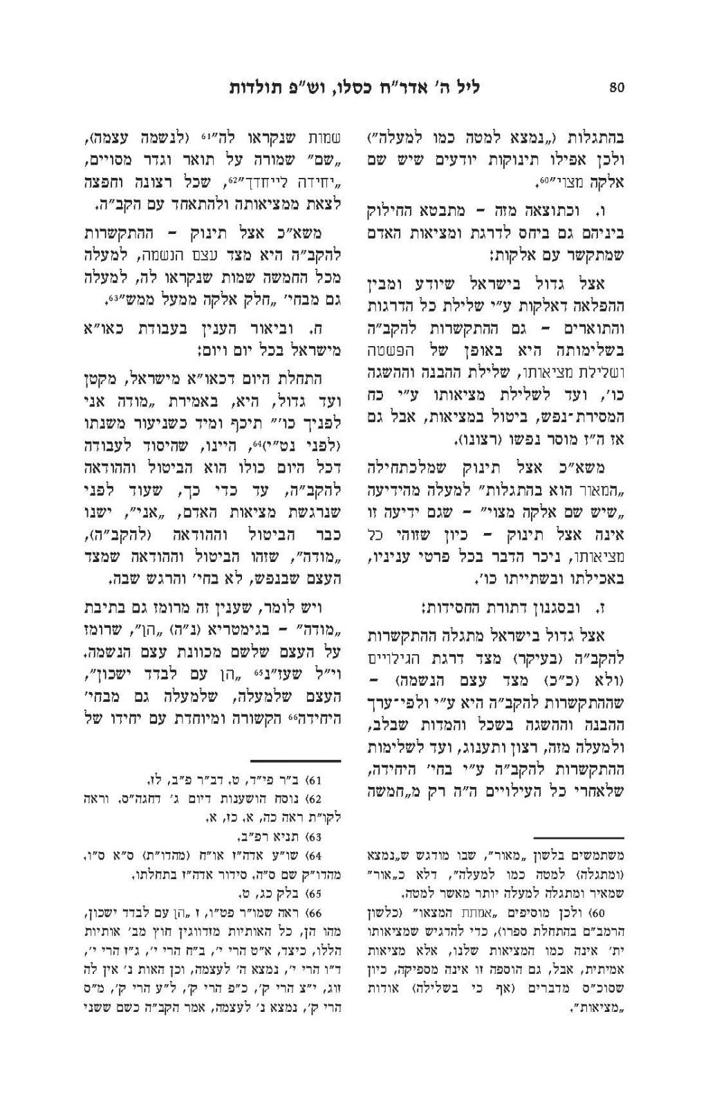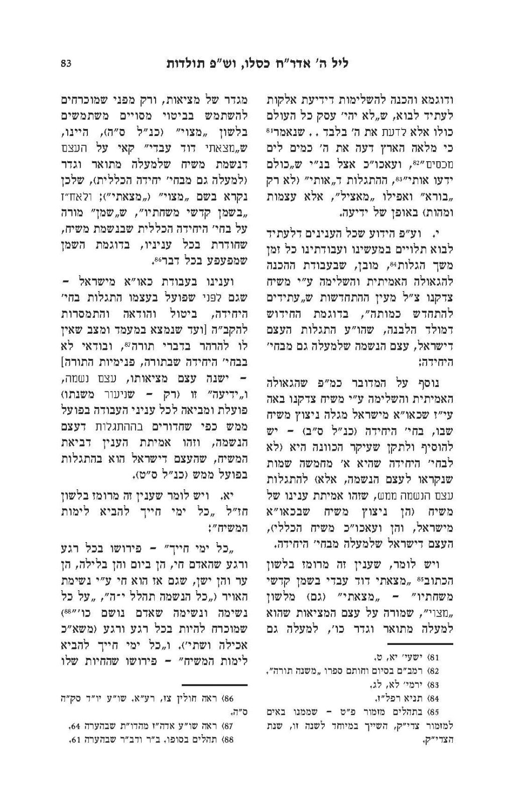 "וקודם לזה ולמעלה מזה - התגלות מציאותו כמו שהיא לעצמה לפני שמתחילה איזה תנועה של יציאה ממציאותו ברגע שניעור משנתו, שאין כאן שום דבר זולת התגלות (חידוש ולידת) מציאותו (לאחרי ההעלם בשעת השינה), אשר, להיותו מציאות אחת עם עצמות ומהות "ישראל וקוב"ה כולא חד", ניעור (מתגלה) עצמות ומהות שבו".