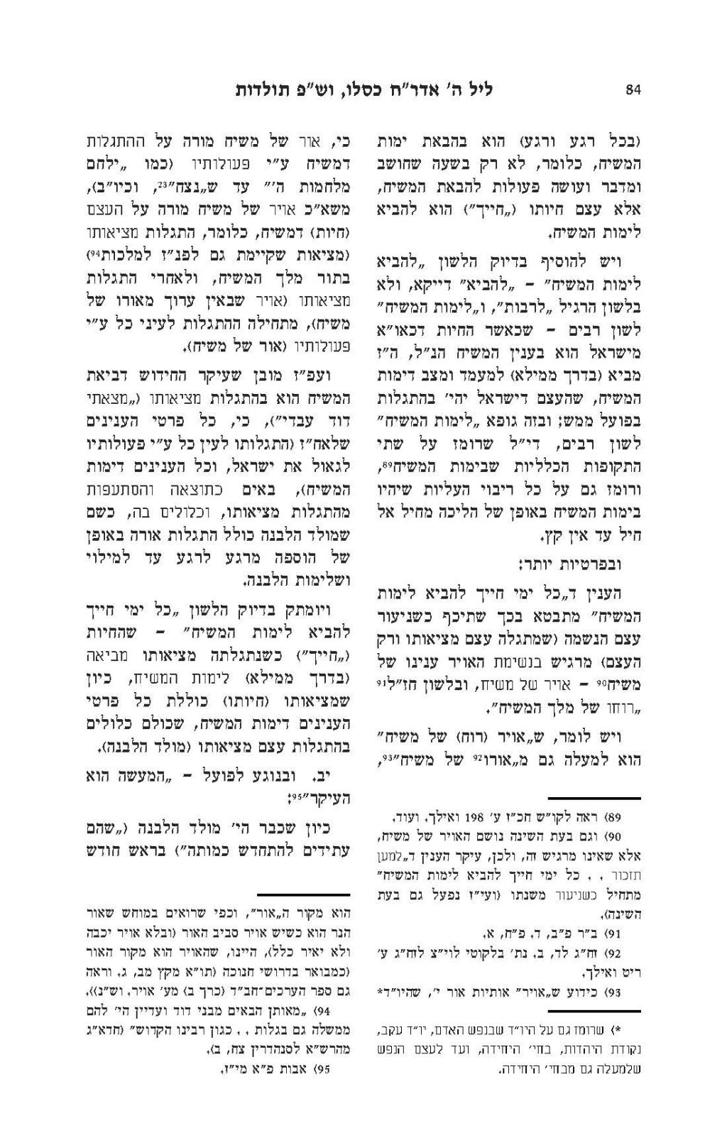 ובצורה יותר ברורה בש"פ תצוה ה'תשנ"ב "כבר באתי לגני אחותי כלה" ושם בהע' 81 "ובשהש"ר שם: "אמר ר' מנחם חתני' דר' אלעזר בר אבונה בשם ר' שמעון בן יוסנה" - דיש לומר, שרומז על שלימות הענין דהשראת השכינה למטה ע"י "גואל (ראשון הוא גואל) אחרון" ש"מנחם שמו" (סנהדרין צח, ב.)" ובקונטרס בית רבינו שבבבל (ס"ה) ". . רבינו, נשיא הדור, שהוא המשיח (גואלן של ישראל) שבדור (כנ"ל ס"ה), ועוד וג"ז עיקר, שהוא הנשיא דתורת החסידות" ובעוד כו"כ מקומות, נלקטו בספר 'תורתו של משיח'.