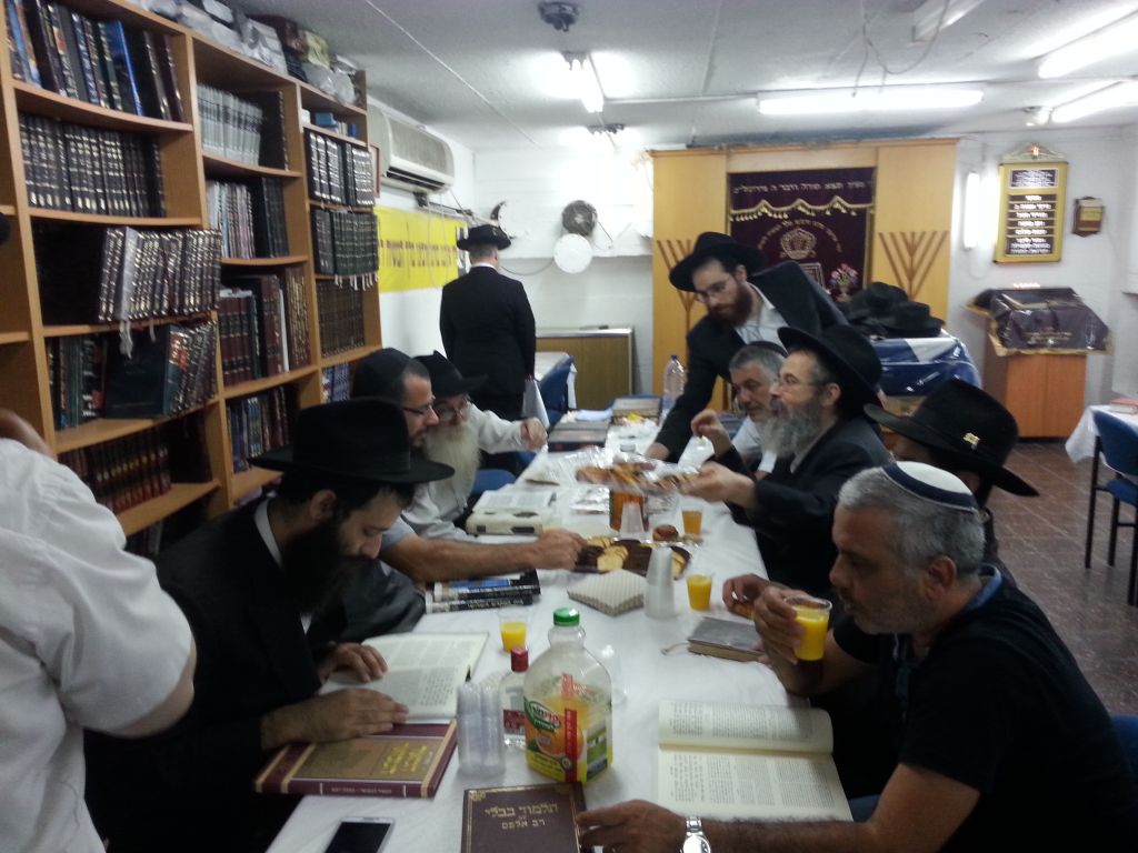 בבית כנסת חב"ד רמת הנשיא בת ים רח' מימון 26, נערכו ב"תשעת הימים" סיומי מסכת בתשעת הימים, אחרי הלימוד היומי בהלכות בית הבחירה ביחזקאל, מסכת מדות והרמב"ם. בתמונות, סיום מסכת קידושין ביום ה' שבוע שעבר, ע"י הרה"ח אמיר רחמן פור בהשתתפות המתפללים.