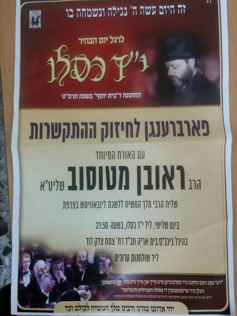 אתמול נערכה בשיכון חב"ד לוד התוועדות י"ד כסלו עם הרב ראובן מטוסוב מצרפת.