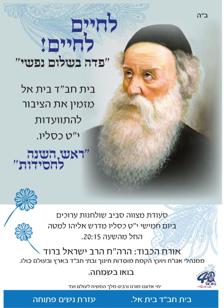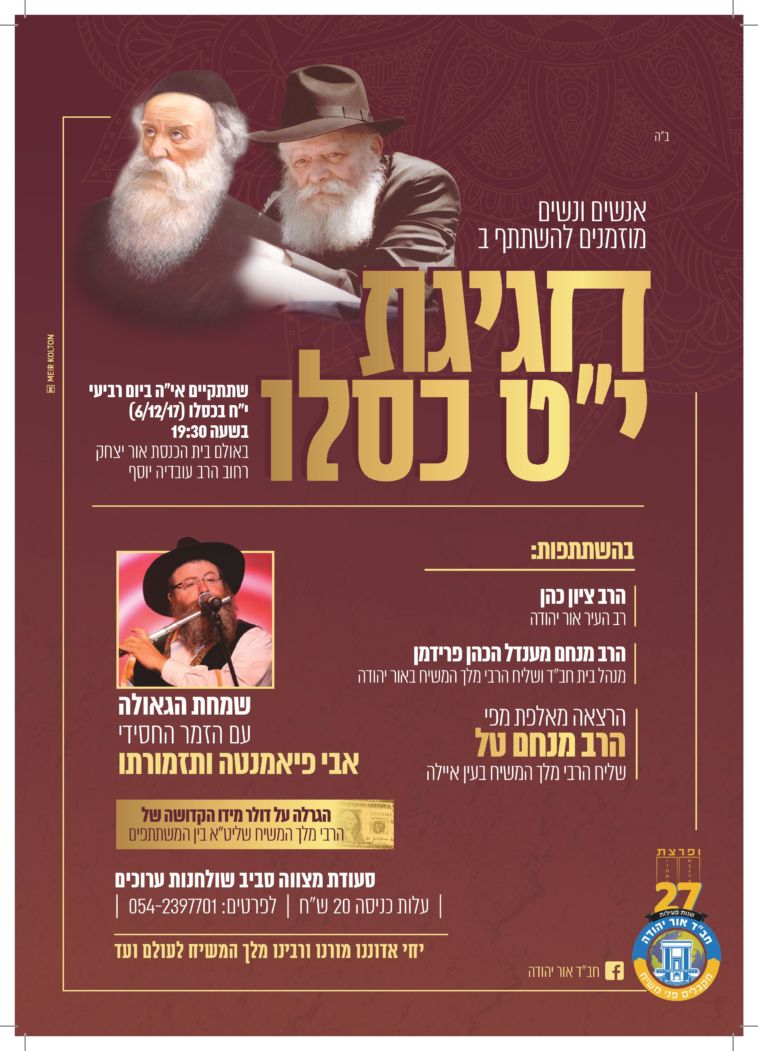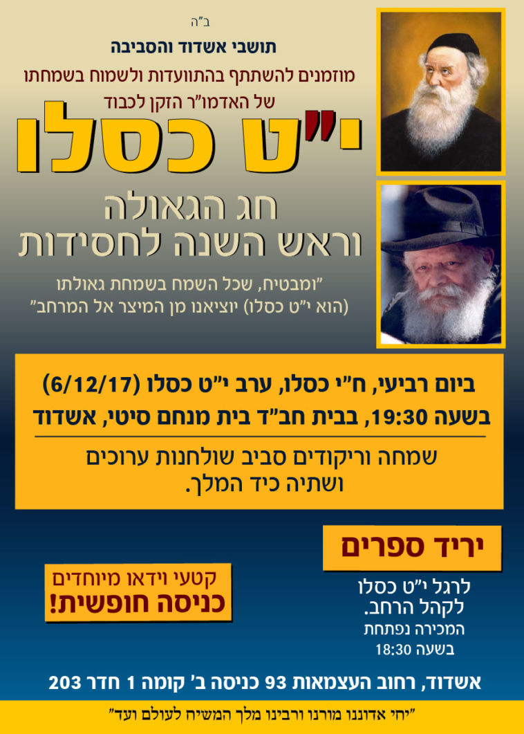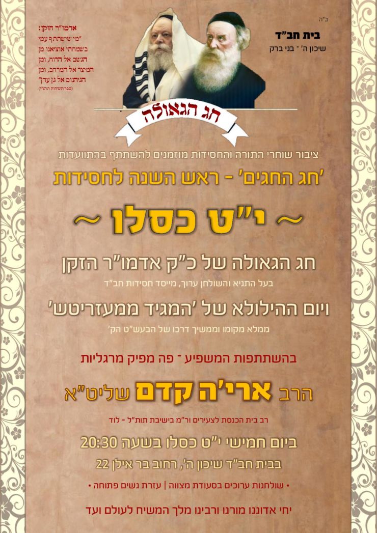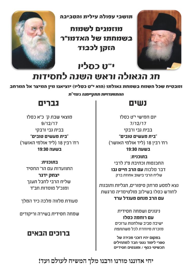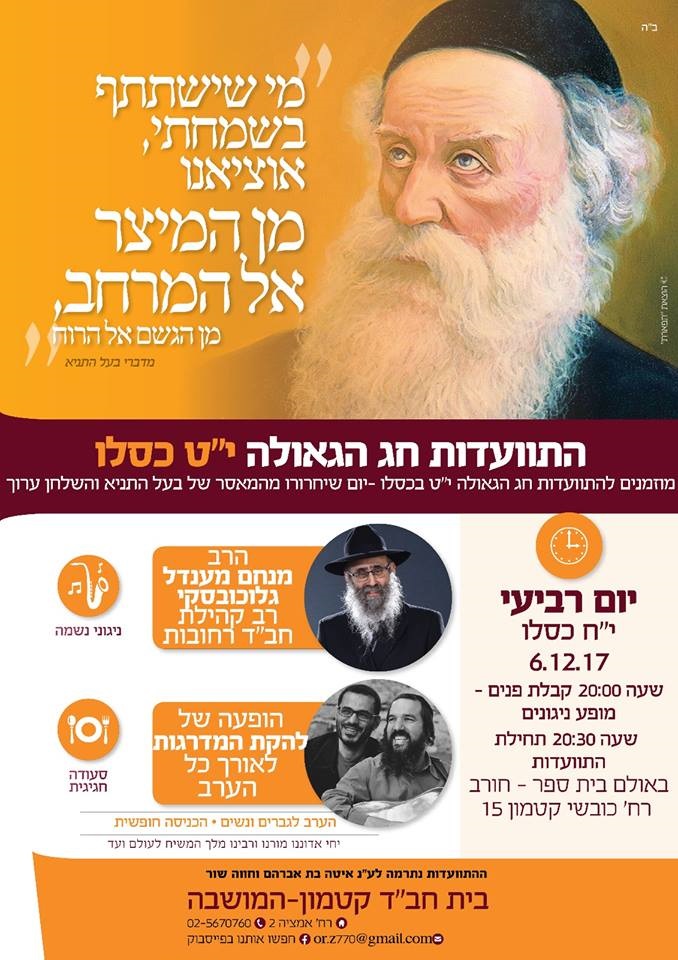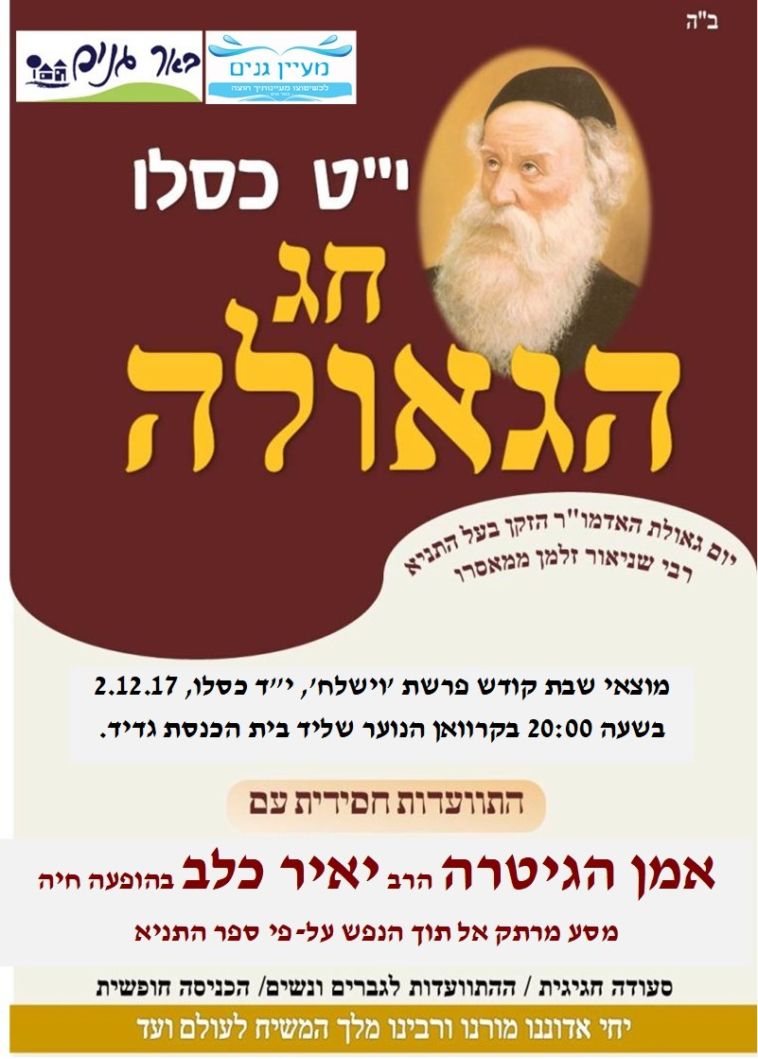 לקראת י"ט-כ' כסלו חג הגאולה של כ"ק אדמו"ר הזקן מליובאוויטש, ע"פ הוראת כ"ק אדמו"ר מלך המשיח שליט"א, חסידי חב"ד ליובאוויטש בפרט והעולם היהודי בכלל, נערכים לימים אלו ע"י עריכת התוועדויות וכד' • אתר הגאולה מגיש את המדריך המיוחד המפרסם במרוכז את כל האירועים • ניתן לשלוח לאימייל www.hageula.com@gmail.com • לצפייה