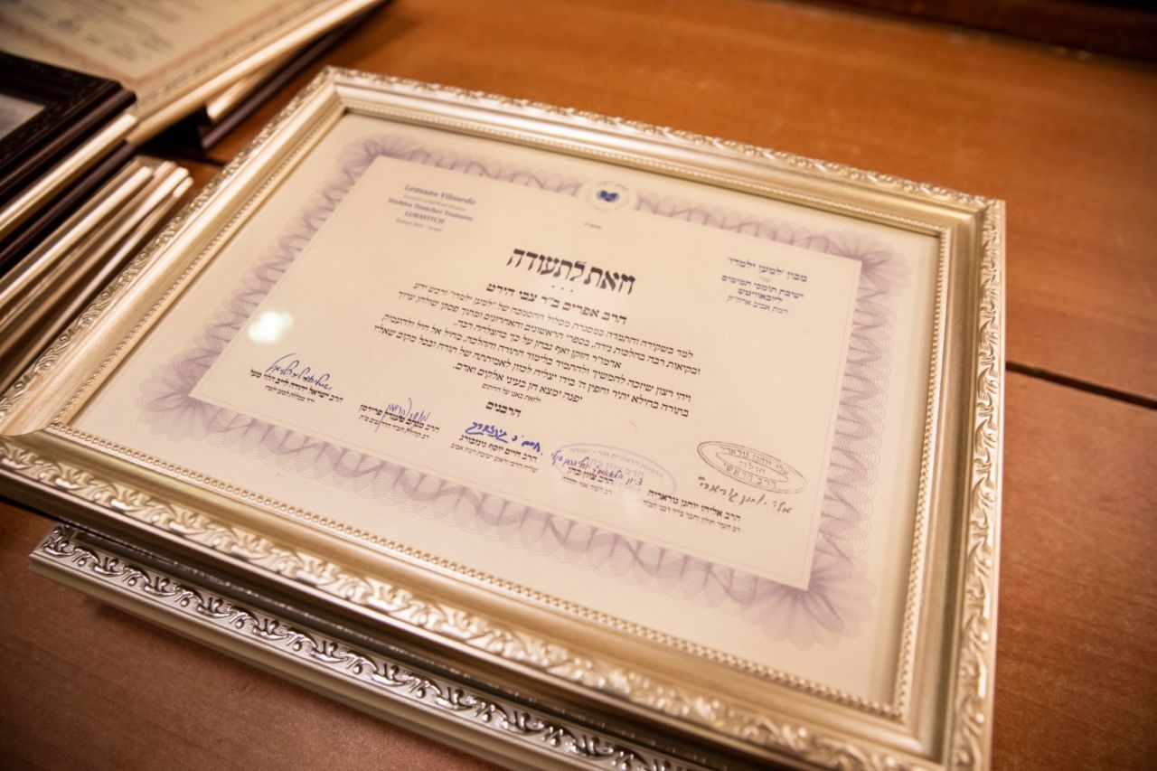 כעת מגיע החלק בתוכנית אליו כולם חיכו – חלוקת תעודות ההסמכה. בהנהלת המכון לא חסכו במאמץ והכינו תעודות מפוארות עליהם מתנוססות חתימות של גדולי הרבנים