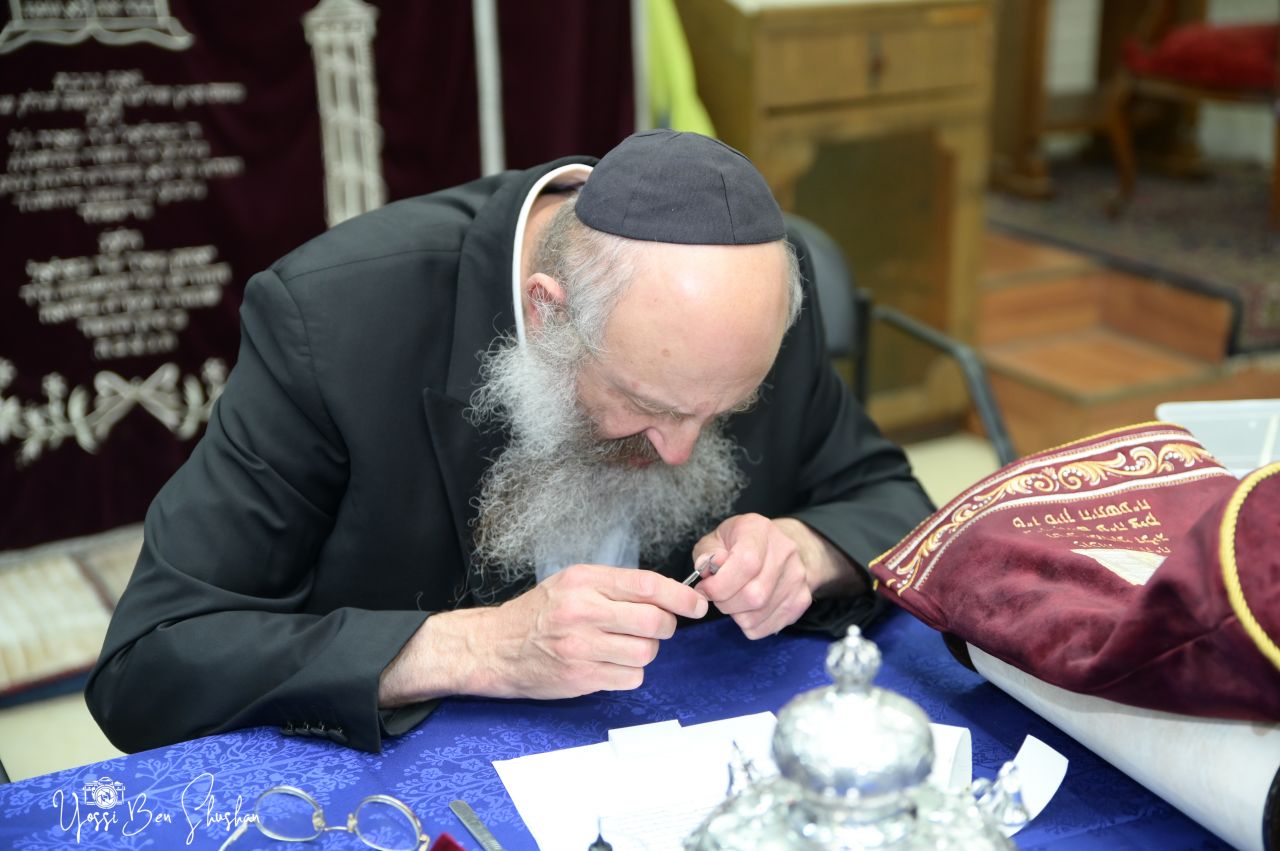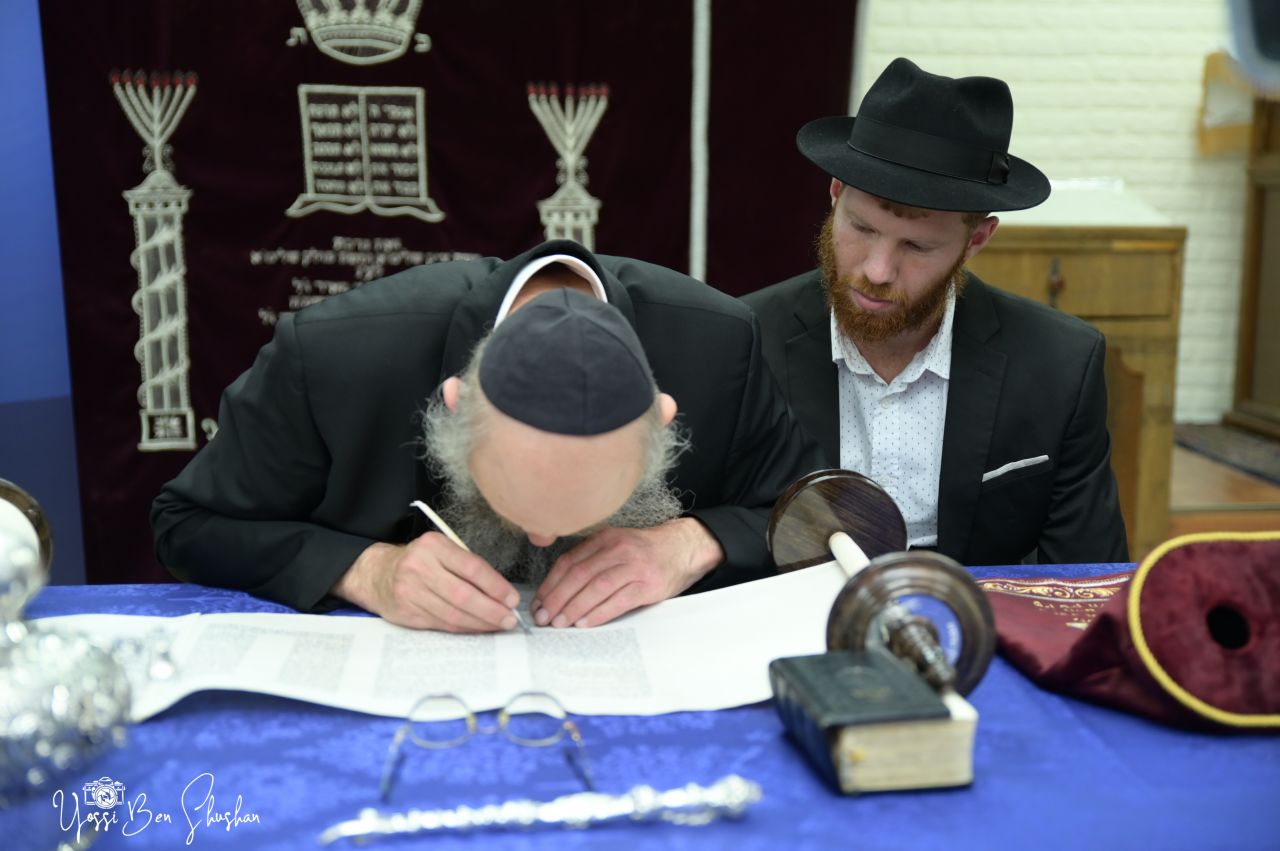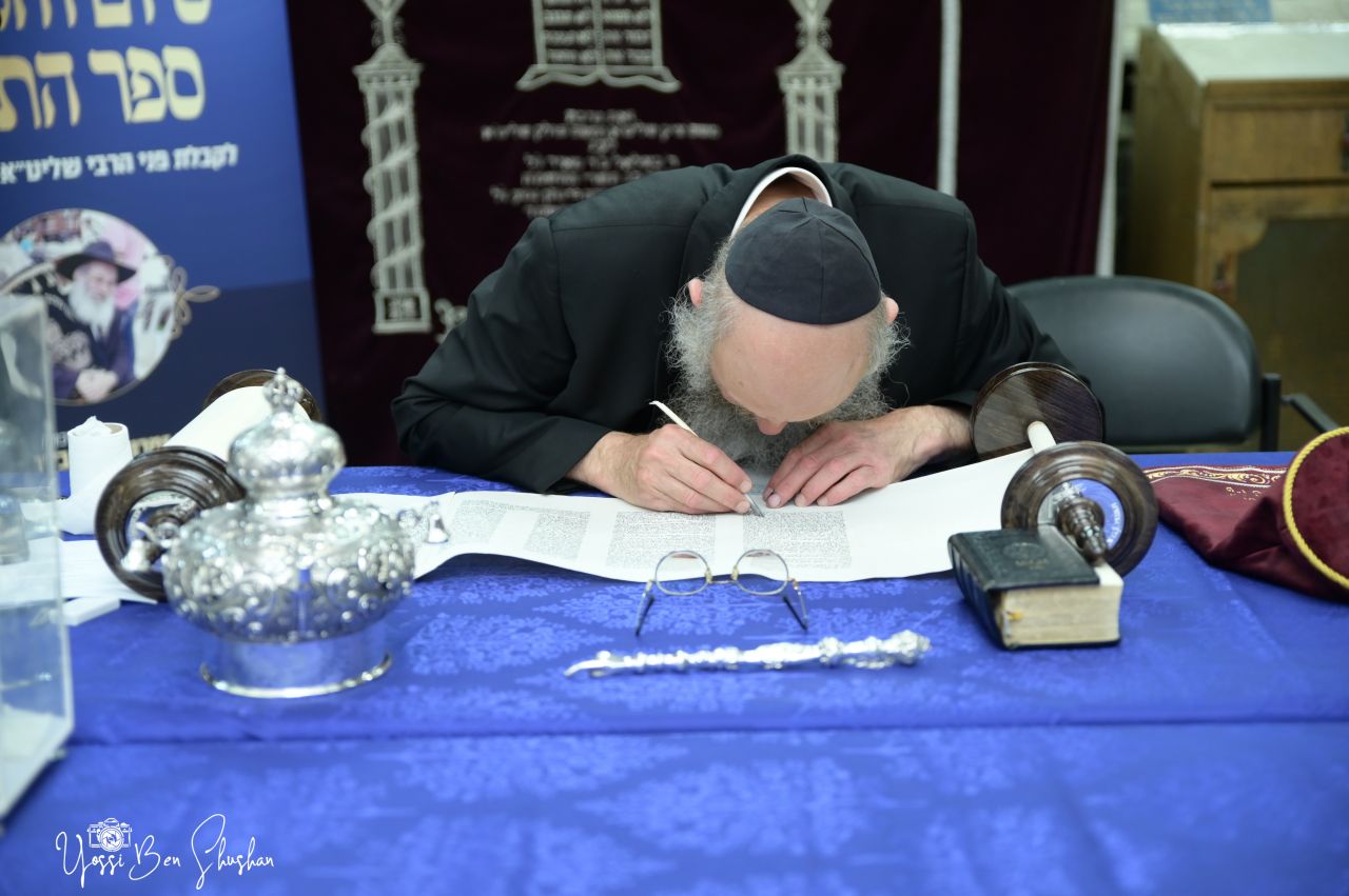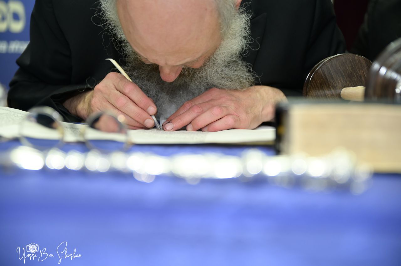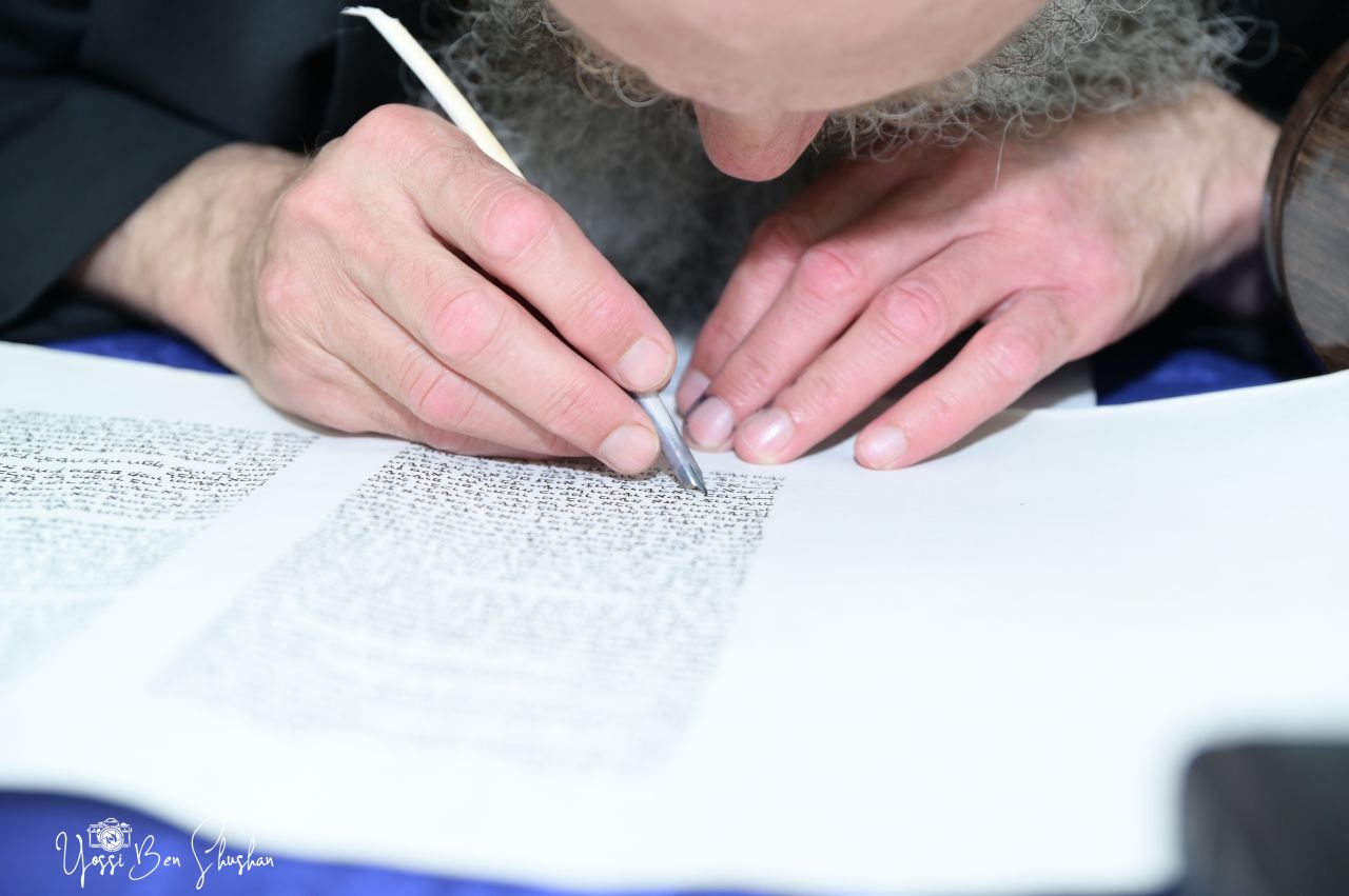 בשעה 16:00 החל מעמד כתיבת האותיות בתוך בית הכנסת של בית חב"ד בשדרות העצמאות. בכתיבת האותיות כובדו משפחת ציק, תורמים וידידי הבית חב"ד. את האירוע הנחה הרב אלעד קנטור, והמשתתפים לא חסכו באמירת 'לחיים' איש לרעהו. בסיום כתיבת האותיות נעמד הקהל להגבהת וגלילת ספר התורה, ומשם יצאו כולם לתהלוכה ססגונית לכבודה של תורה.