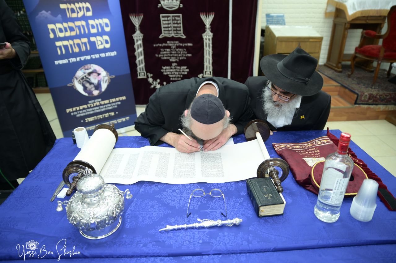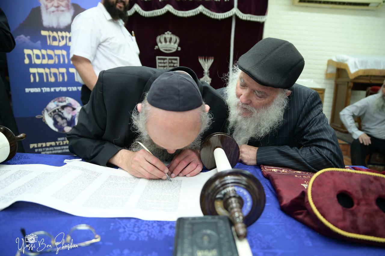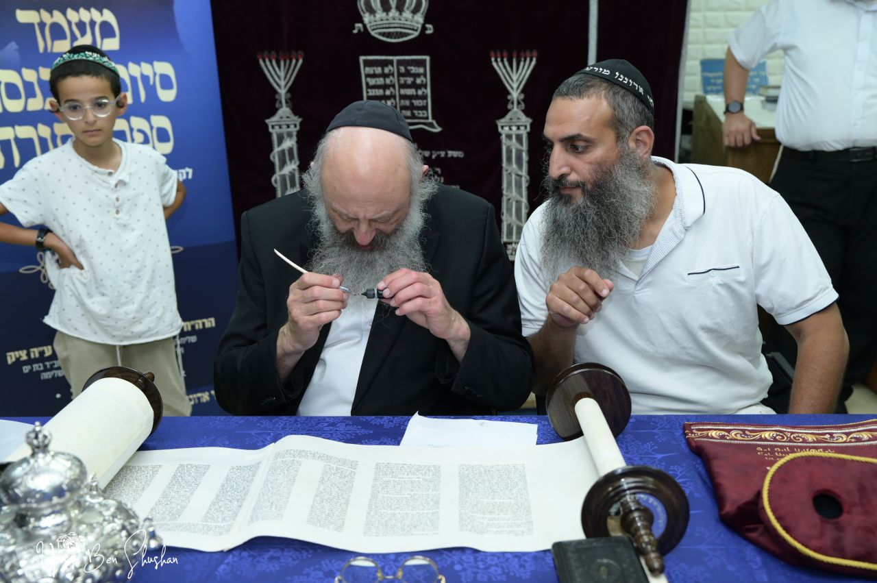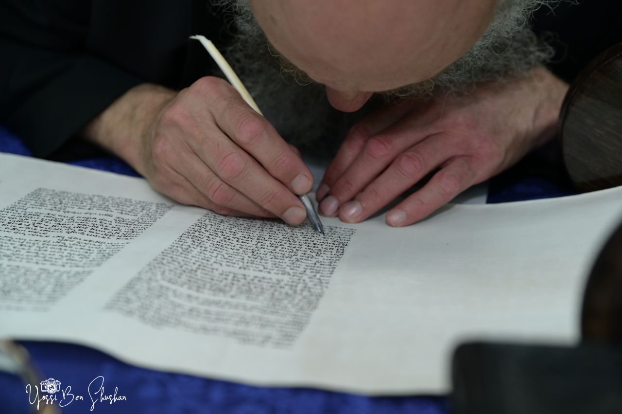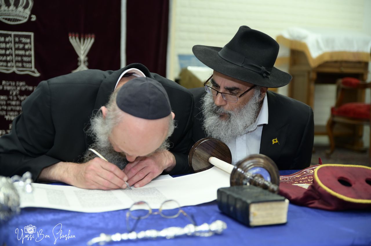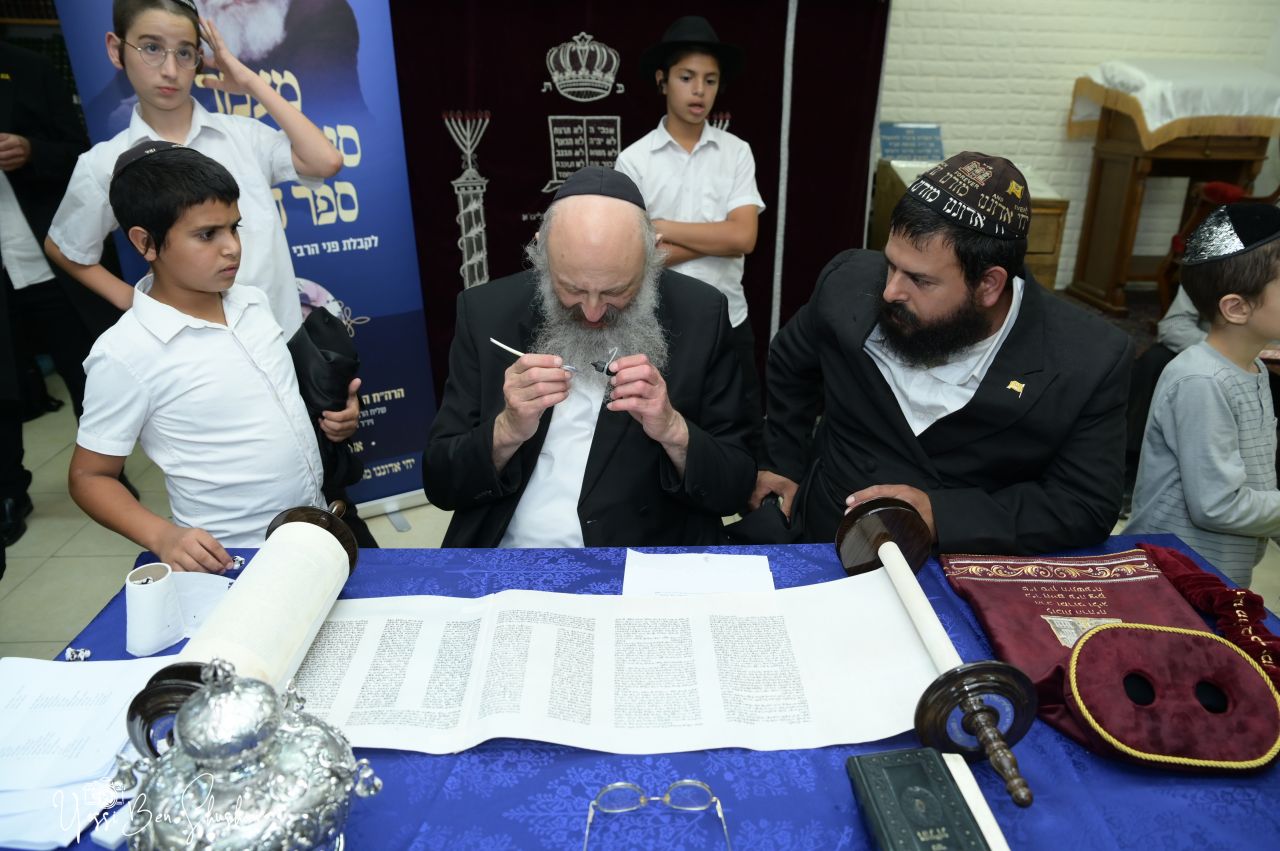 בשעה 16:00 החל מעמד כתיבת האותיות בתוך בית הכנסת של בית חב"ד בשדרות העצמאות. בכתיבת האותיות כובדו משפחת ציק, תורמים וידידי הבית חב"ד. את האירוע הנחה הרב אלעד קנטור, והמשתתפים לא חסכו באמירת 'לחיים' איש לרעהו. בסיום כתיבת האותיות נעמד הקהל להגבהת וגלילת ספר התורה, ומשם יצאו כולם לתהלוכה ססגונית לכבודה של תורה.