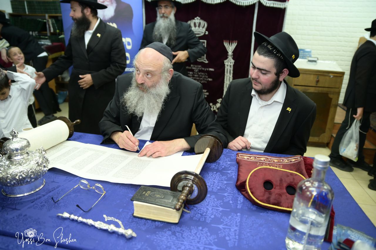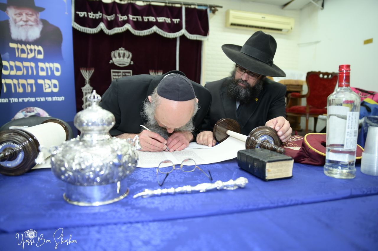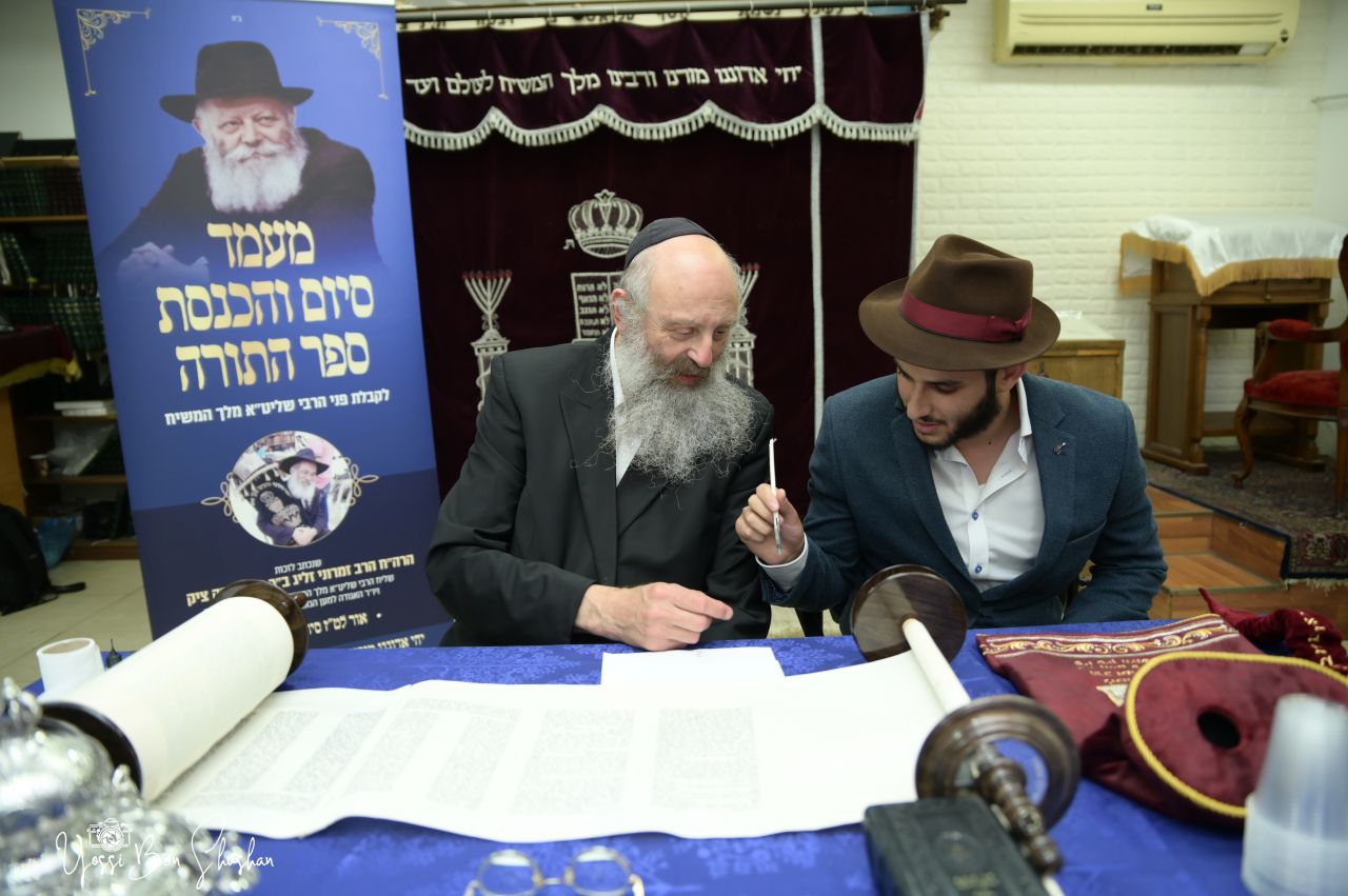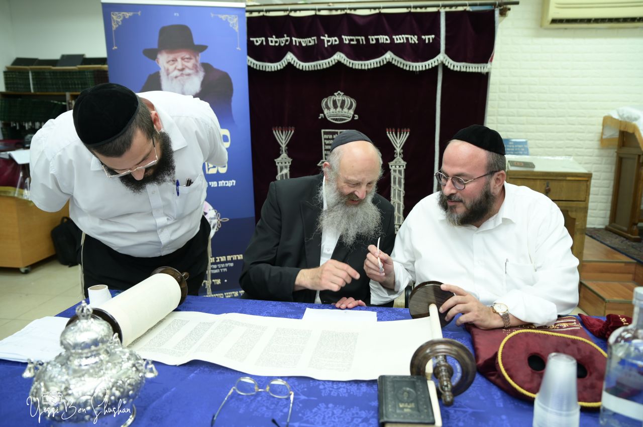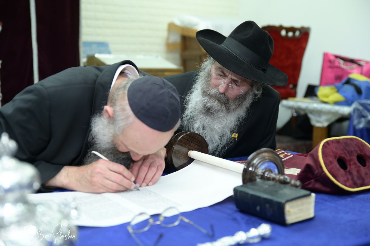בשעה 16:00 החל מעמד כתיבת האותיות בתוך בית הכנסת של בית חב"ד בשדרות העצמאות. בכתיבת האותיות כובדו משפחת ציק, תורמים וידידי הבית חב"ד. את האירוע הנחה הרב אלעד קנטור, והמשתתפים לא חסכו באמירת 'לחיים' איש לרעהו. בסיום כתיבת האותיות נעמד הקהל להגבהת וגלילת ספר התורה, ומשם יצאו כולם לתהלוכה ססגונית לכבודה של תורה.