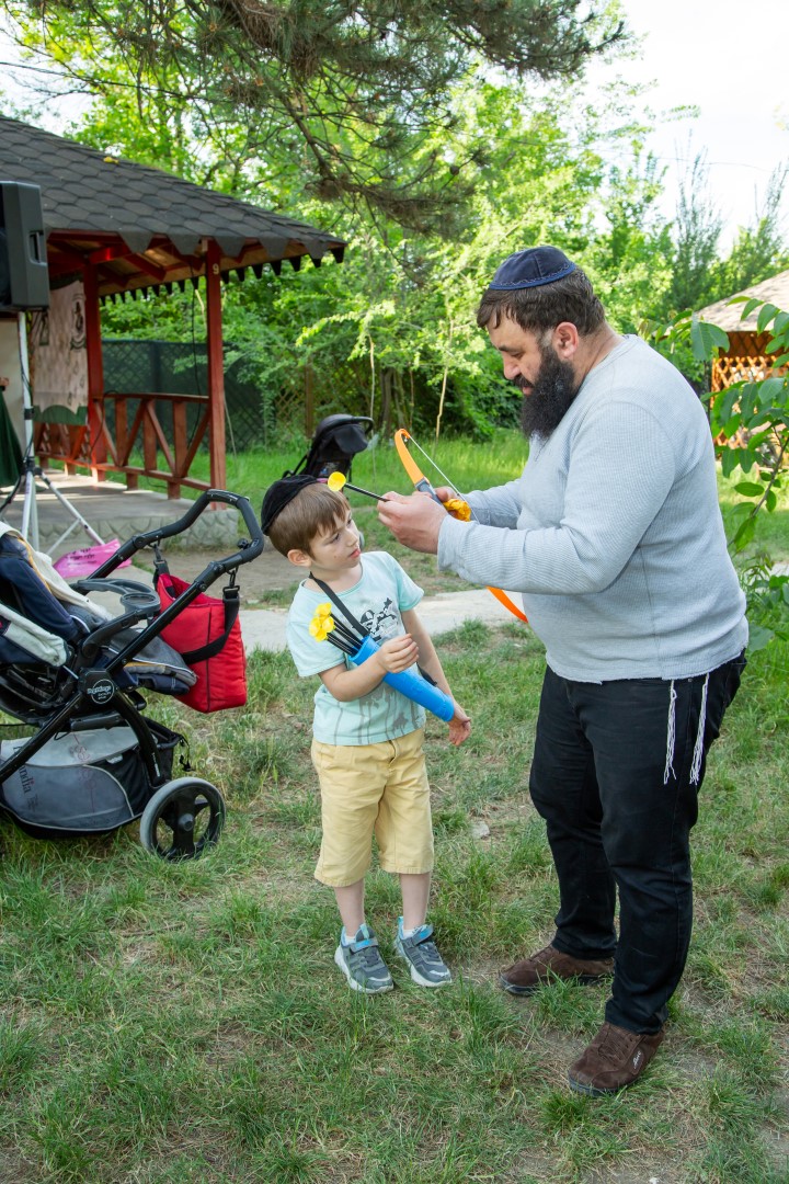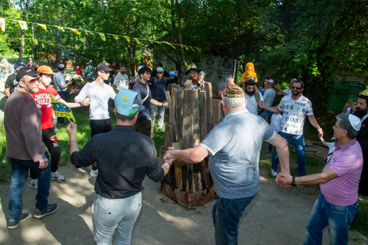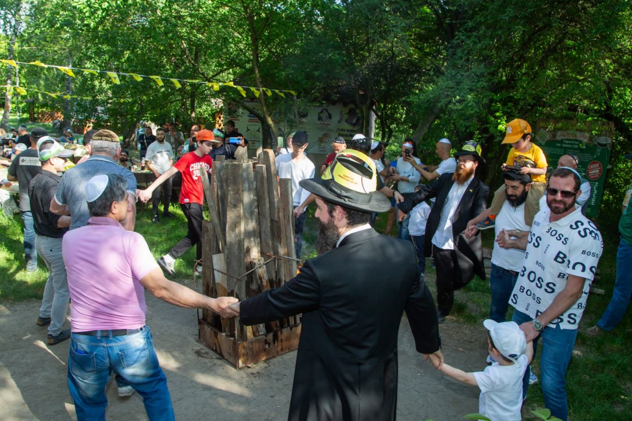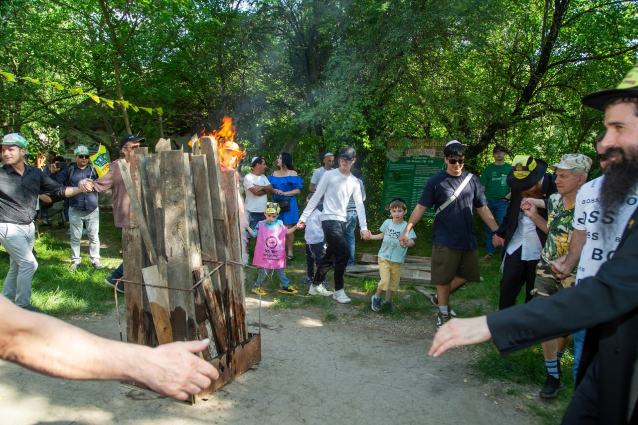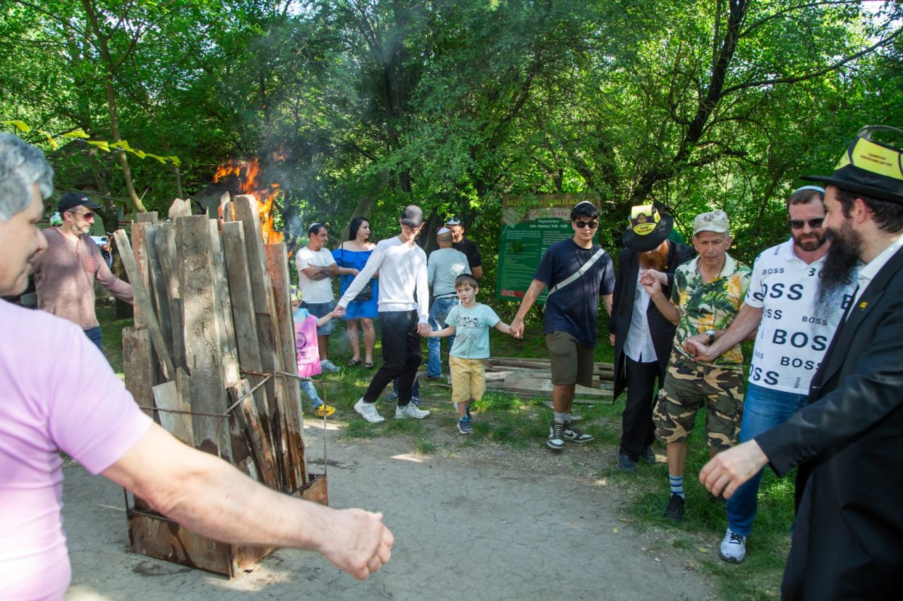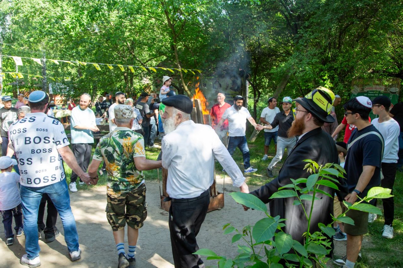בפארק - יושבים ליד שולחנות ערוכים, אוכלים "על האש" כמנהג היום, מדליקים מדורה, רוקדים, והילדים אומרים פסוקים, ולבסוף - הגרלת פרסים.