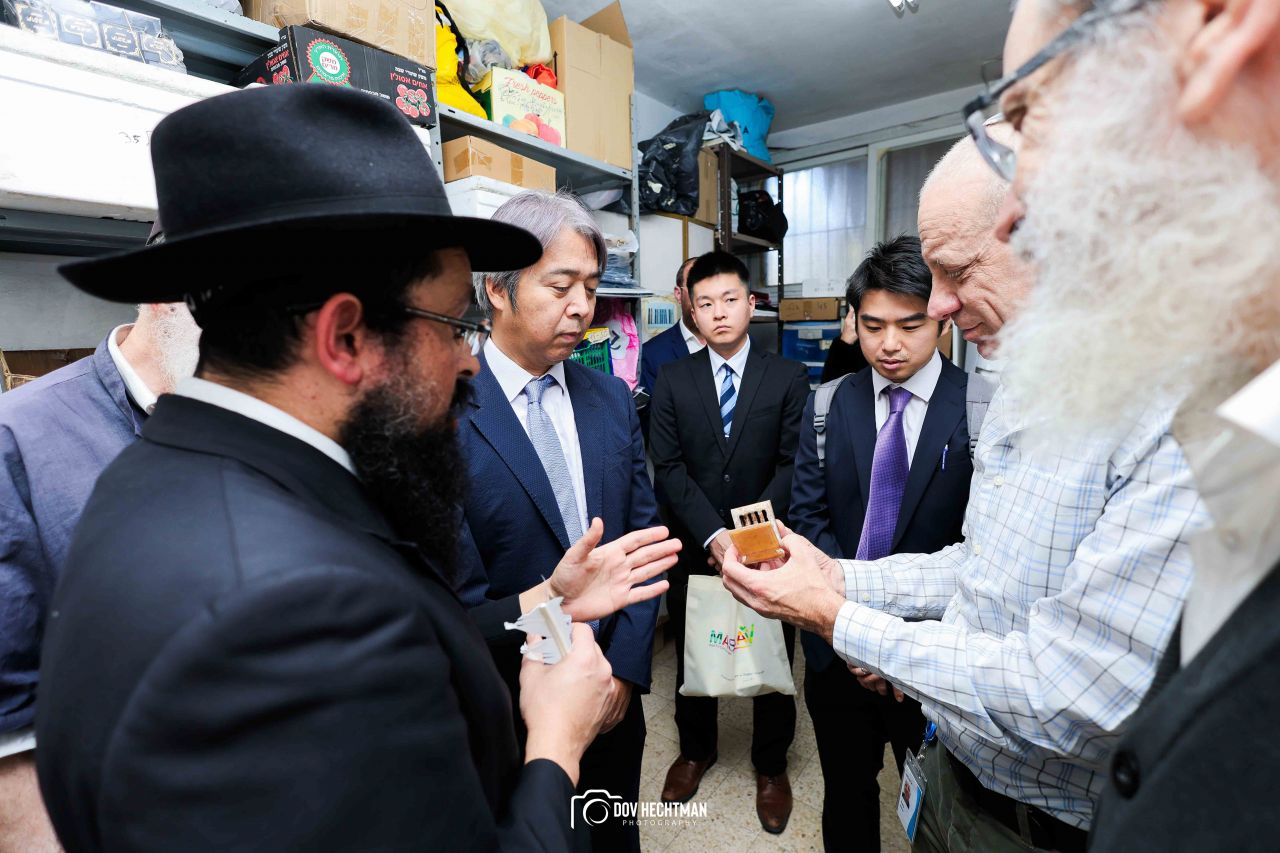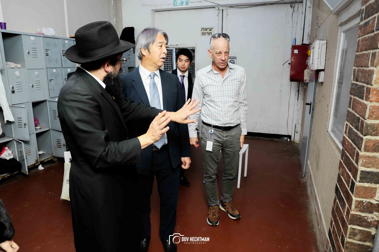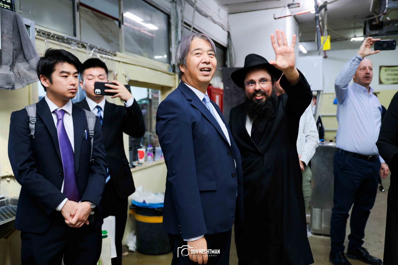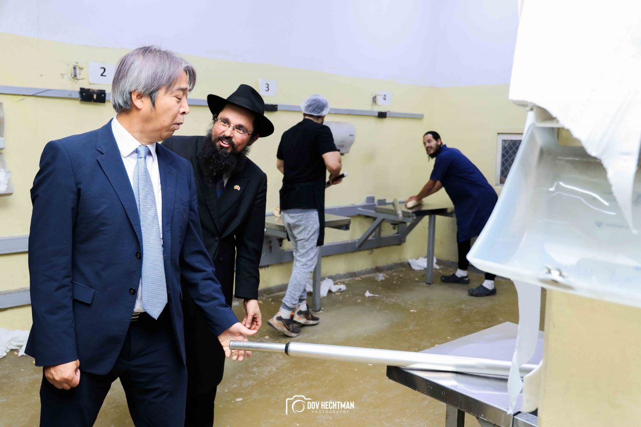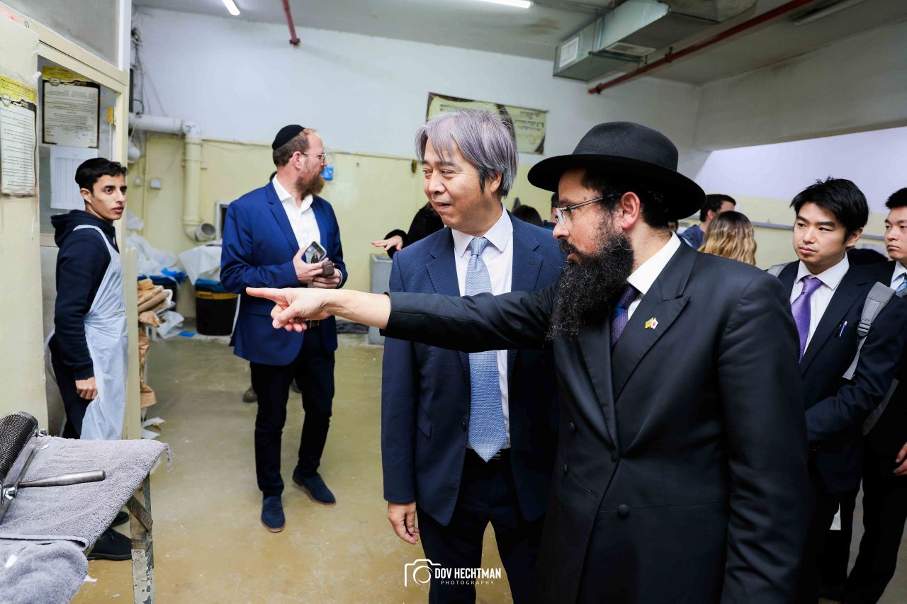 שליח הרבי שליט"א מלך המשיח והרב הראשי ליפן הרב בנימין אדרעי הביא את שגריר יפן בישראל מר אראי יוסוקה לביקור מיוחד בבית אגודת חסידי חב״ד – 770 ובמאפיית מצות בכפר חב"ד.