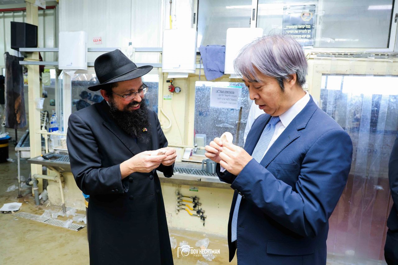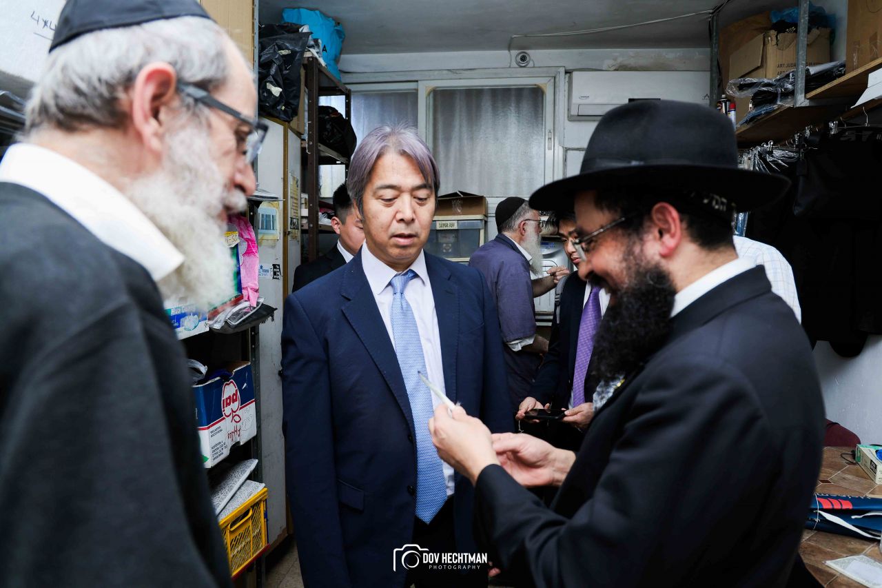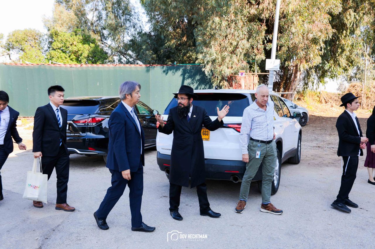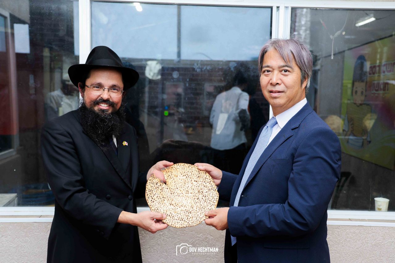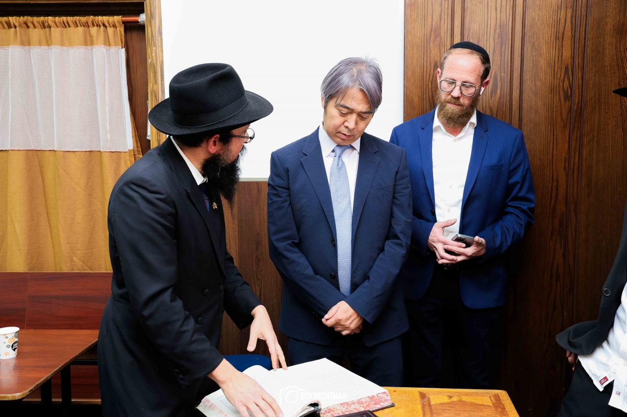 שליח הרבי שליט"א מלך המשיח והרב הראשי ליפן הרב בנימין אדרעי הביא את שגריר יפן בישראל מר אראי יוסוקה לביקור מיוחד בבית אגודת חסידי חב״ד – 770 ובמאפיית מצות בכפר חב"ד.