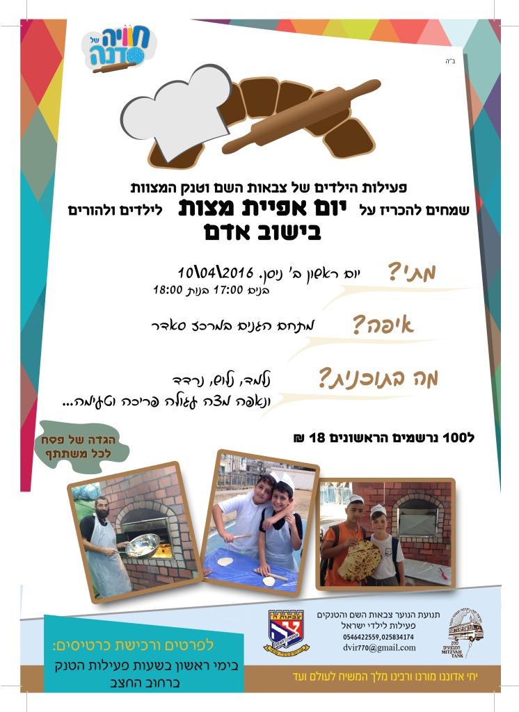 שבוע הבא יפתח לראשונה רשת פעילות באדם-תל ציון לקראת חג הפסח בנושא "סדנא מאפיית מצות", ליומיים בלבד.