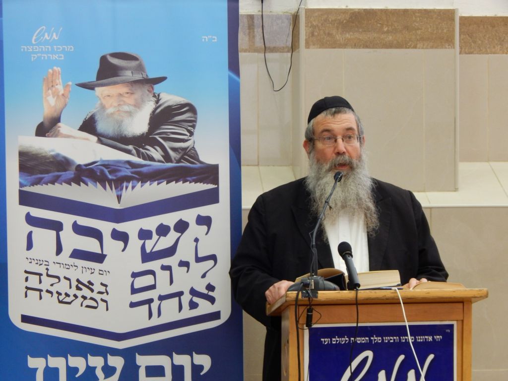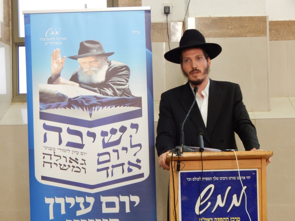 הפוגה לתפילת מנחה המונית, ארוחת צהריים קלה, וכבר מודיעים בחדר האוכל כי אורח היום כבר מגיע הלא הוא הרב החיד"א אברג'ל בנו של המקובל רבי יורם אברג'ל זצ"ל מנתיבות. הרב אברג'ל פותח על מעלתו של יום העיון והפעולה השמיימית שהדבר פועל בקירוב הגאולה. הוא מזכיר את חתימת אביו על פסק הדין שהרבי הוא משיח ועובר לביאור מעלת וקדושת ספר התניא ובעיקר הפצתו תוך ששוזר בדבריו עובדות מופלאות מהקשרים של אביו עם כ"ק אדמו"ר מלך המשיח שליט"א. הקהל המרותק שומע את הדברים המרוממים וללא שהות עובר לשיעור עיוני מעמיק מפי הרב יהושע נויהויזר ר"מ בישיבה גדולה חב"ד אור יהודה. הנושא: גדר היום טוב שיהיה בתשעה באב בימות המשיח. הוא מתפלפל ומצליח לשתף אתה קהל בחילוקים עיוניים בדברי החתם סופר והמנחת חינוך.