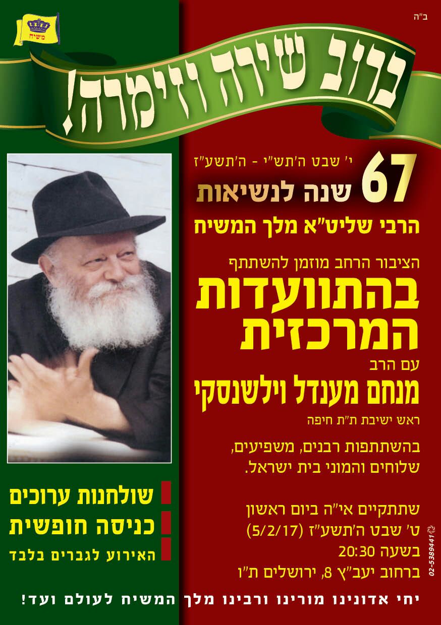 הציבור החרב מוזמן להשתתף בהתוועדות המרכזית לכבוד י' שבט בירושלים, עם הרב מנחם מענדל וילשנסקי ראש ישיבת חב"ד חיפה, רבנים ומשפיעים, ביום א', ט' שבט שעה 20:30, רח' יעבץ 8 ירושלים ת"ו מסביב לשולחנות ערוכים. הכניסה חופשית, הציבור מוזמן. (הארוע לגברים בלבד).