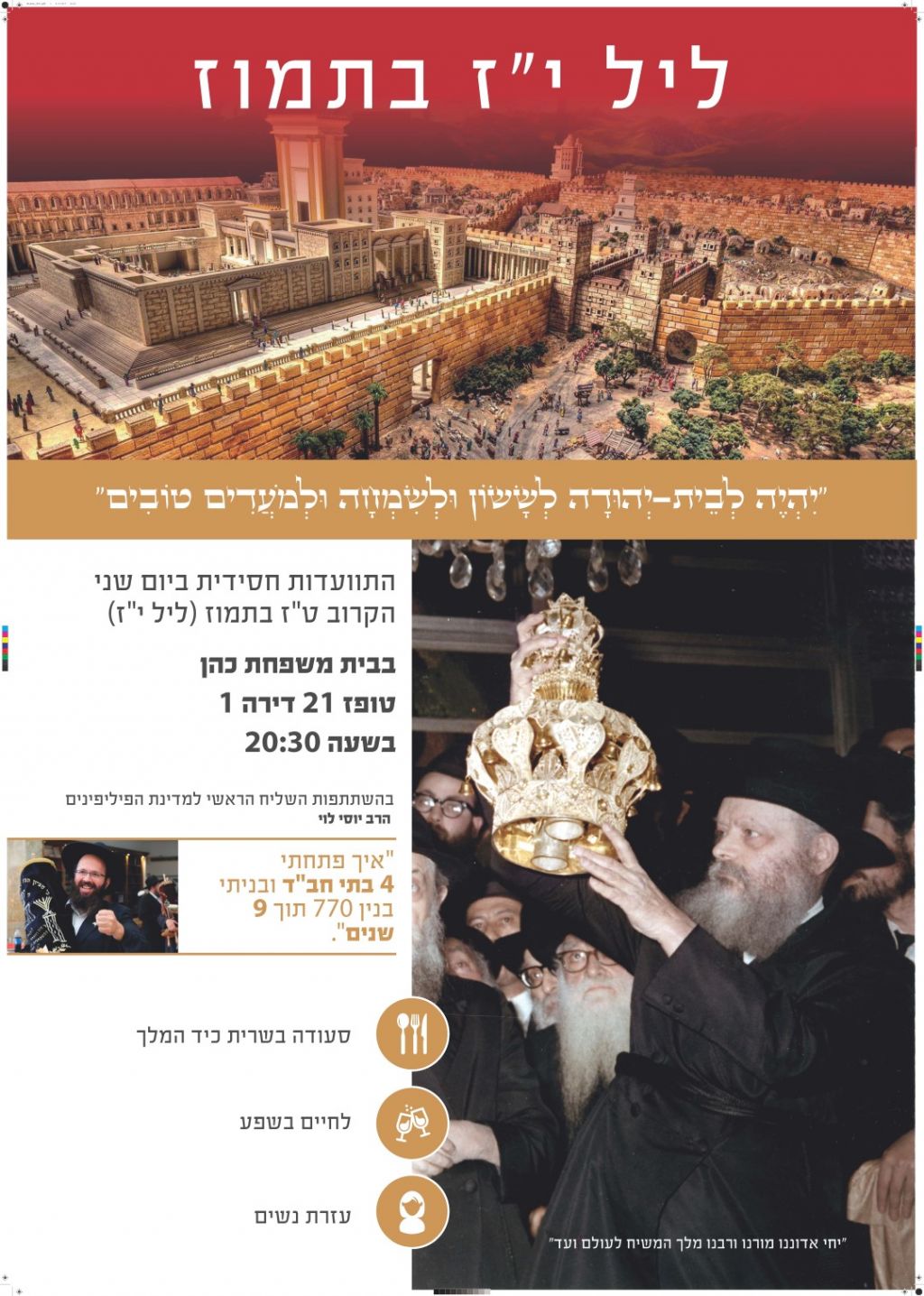 בליל י"ז תמוז ערב תחילת "שלושת השבועות" נערכה התוועדות חסידית מיוחדת בעיר חריש שבצפון. בהשתתפות הרב יוסף יצחק לוי שליח ראשי ורבה הראשי של מדינת הפיליפינים, והרב יוסף קורנט שליח ראשי בפרדס חנה - כרכור, שהתוועדו וסיפורו על הנסים בשליחות • דיווח וגלריה