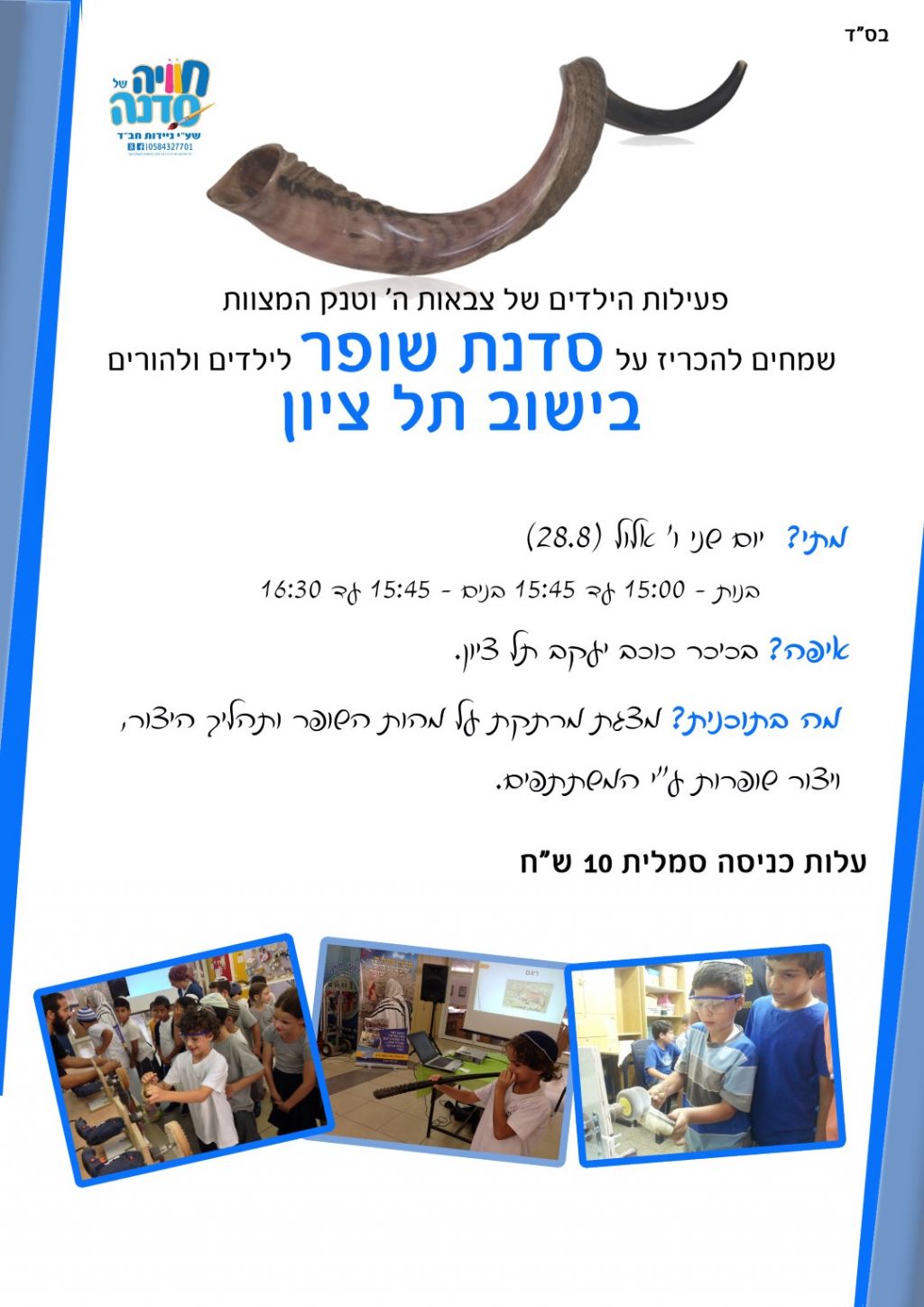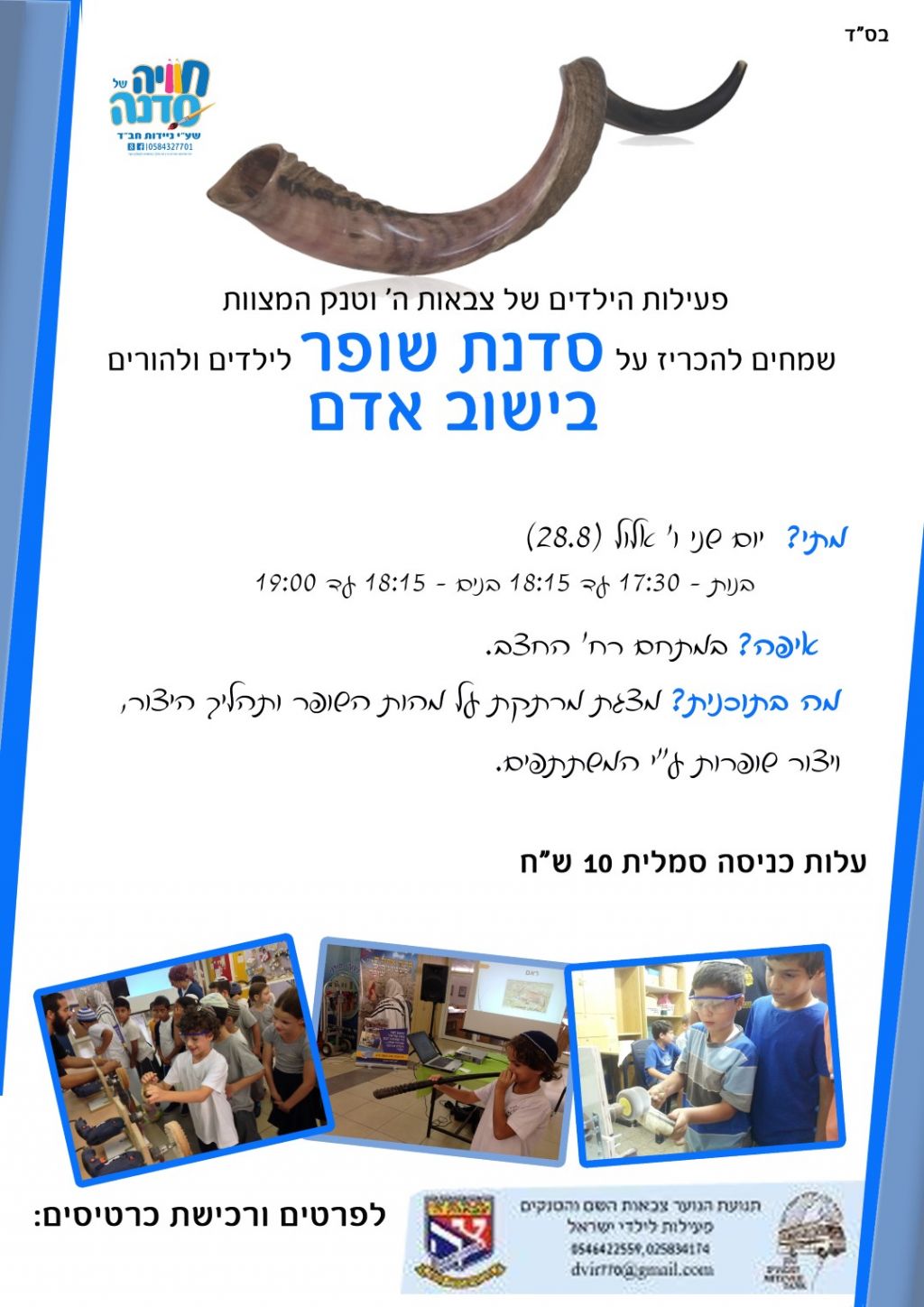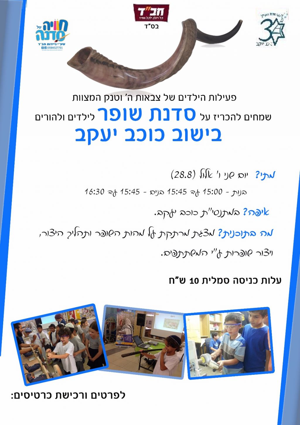 התנסו ב לנסר ולשייף וללמוד מלאכת הכנת השופר וכמובן התנסות בלימוד ותקיעת השופר לראש השנה הבא עלינו לטובה. בהמשך היום נערך יריד עם כינוס ענק ומשולב ל180 ילדים וילדות סניף צבאות השם וטנק המצוות: אדם-כוכב יעקב-תל ציון:
