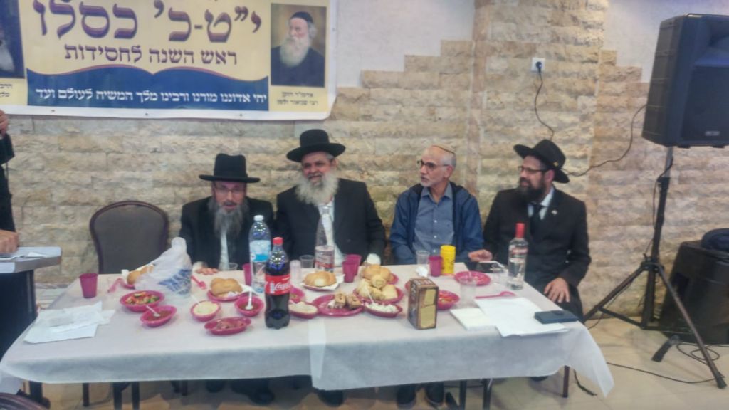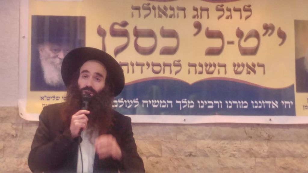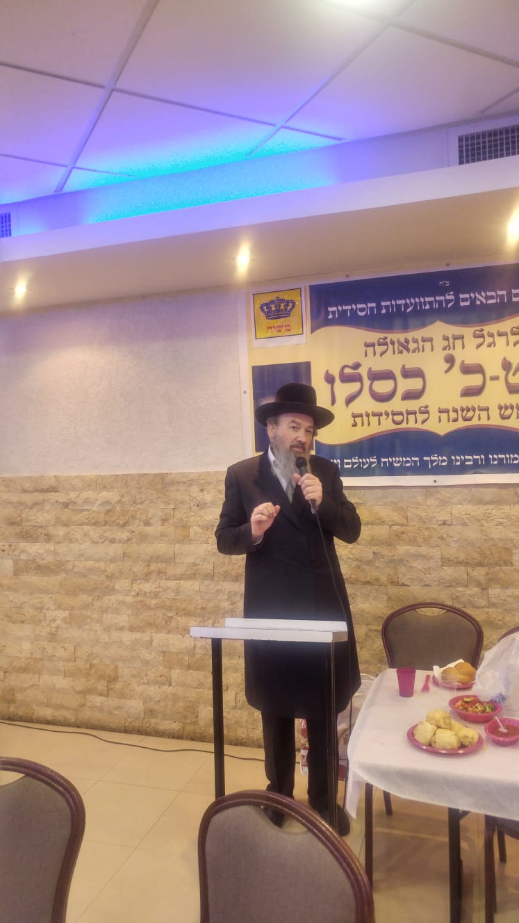 הרב ישראל מלכה, חבר מועצת הרבנות המקומית ורב השכונות מדבר בפני הקהל כשהוא מעלה זיכרונות מלימוד החסידות והתוועדויות חג הגאולה במרוקו.