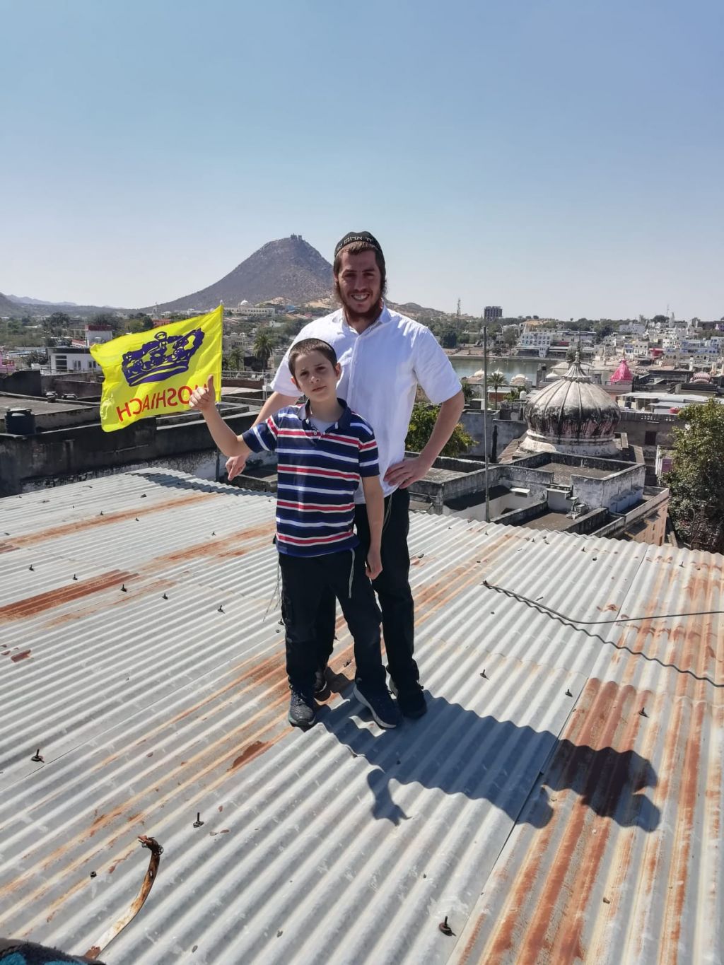 התמימים חיילי בית דוד שבאו לסייע לפעילות לרב בצללאל קופצ'יק שליח הרבי שליט"א מלך המשיח לפונה (הודו), קישטו את העיר בדגלי משיח לקראת הגאולה.
