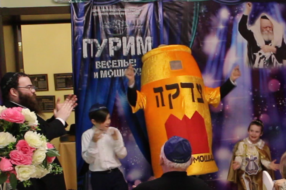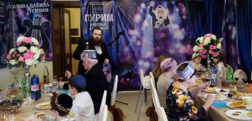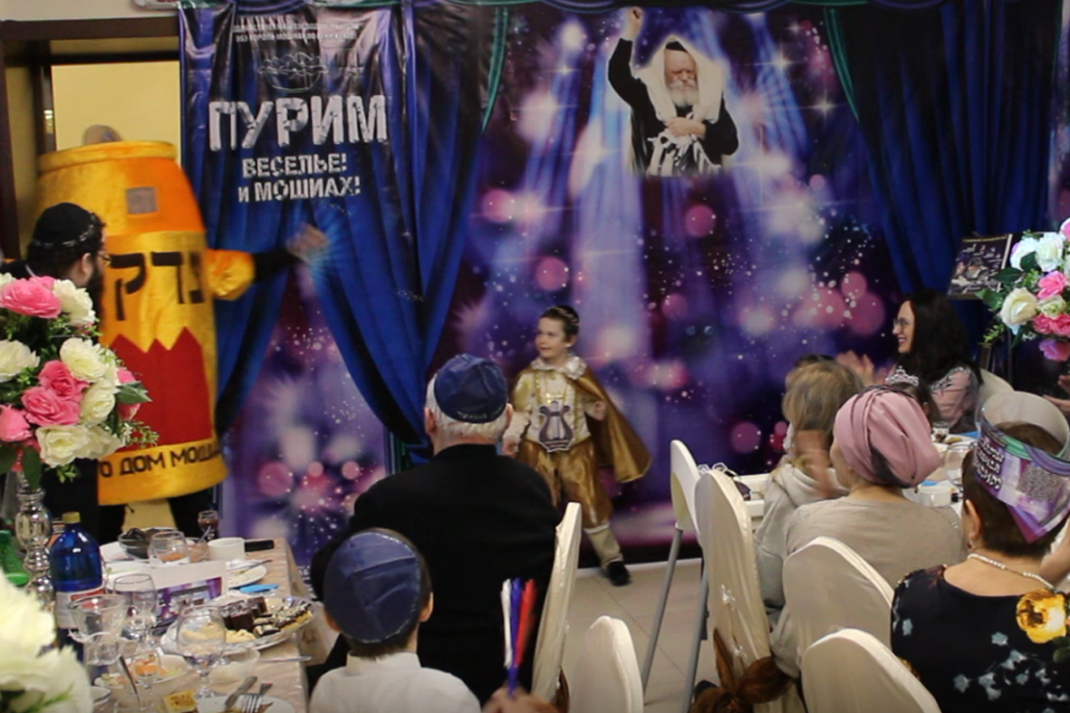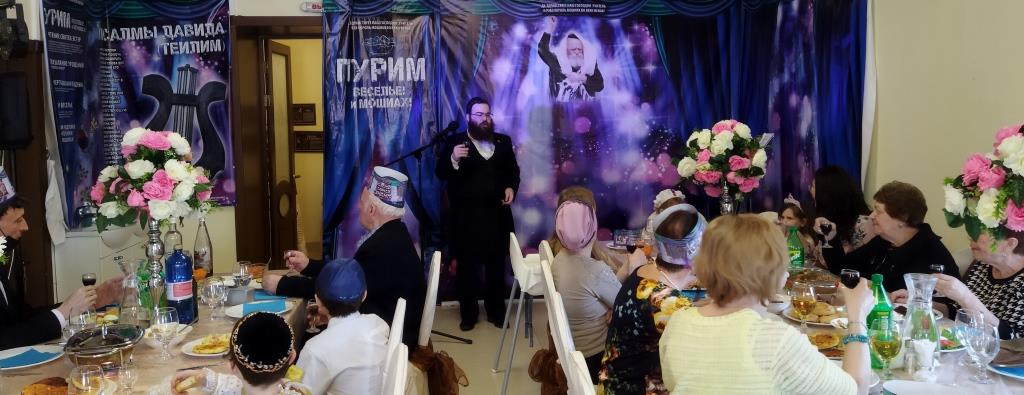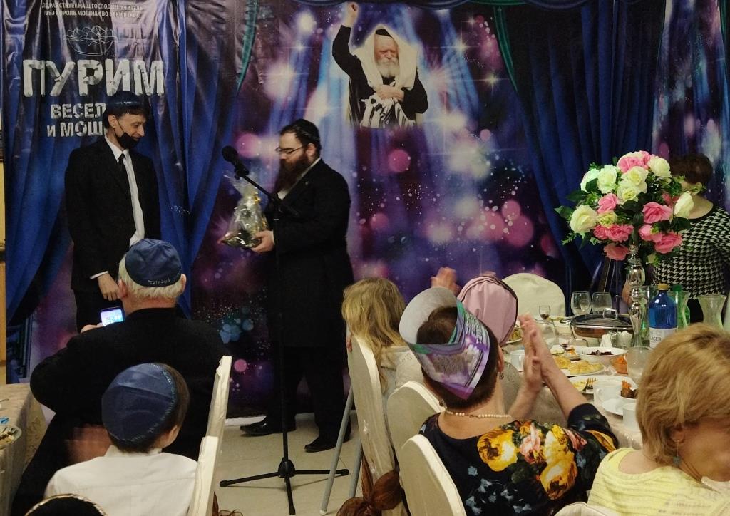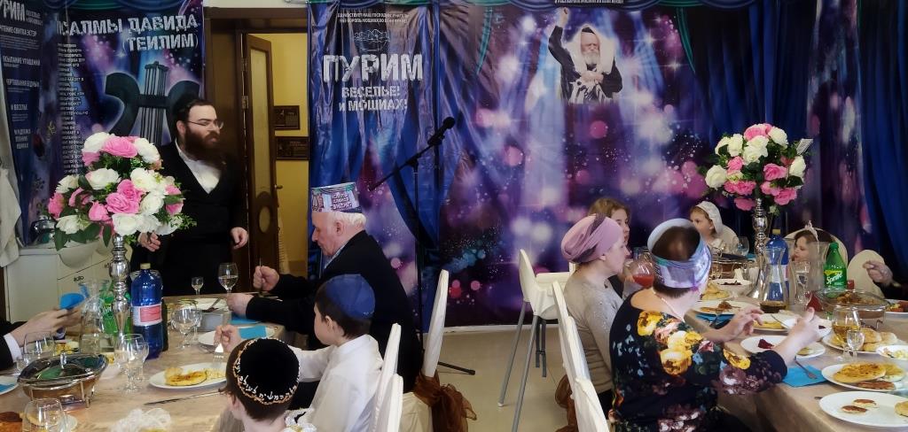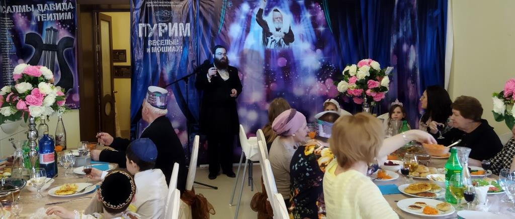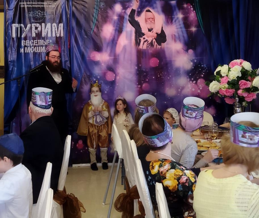 בכניסה קיבלו בידידות מהשליח ורעייתו "דמי פורים", צפו בווידיאו מקדים ברוסית שהוקרן על גבי מסך ענק המסביר בטוב טעם את ארבעת מצוות החג כשהכל חדור במ"ם החמישית משיח צדקנו יבוא ויגאלנו במהרה בימינו.