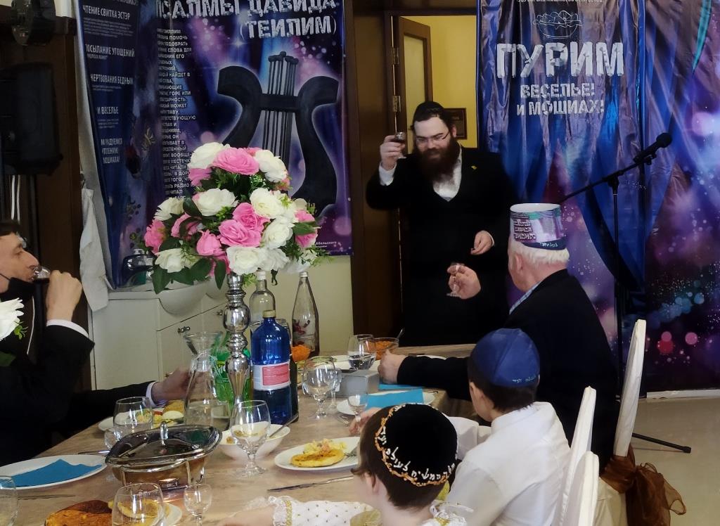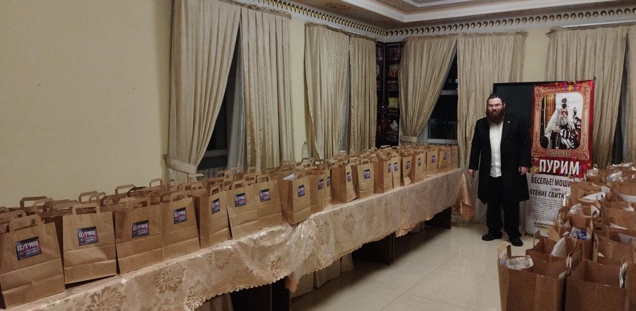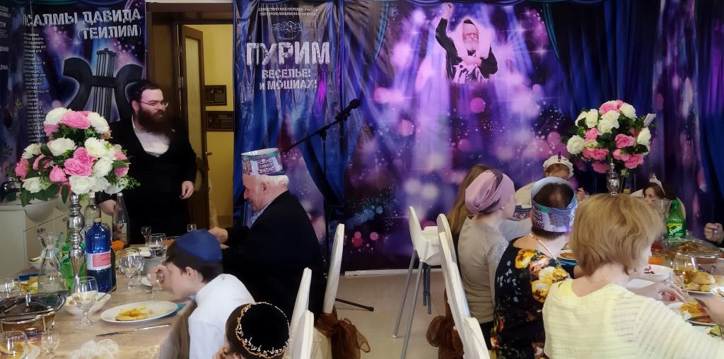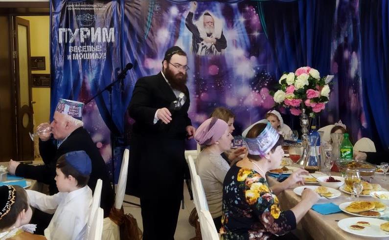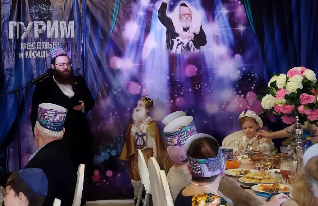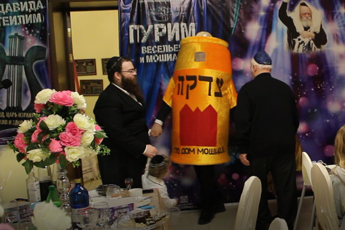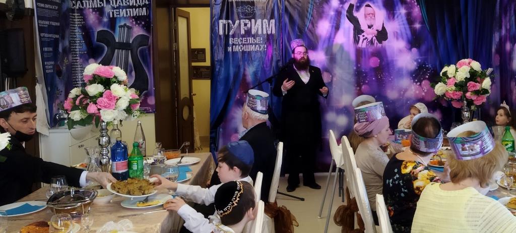 בכניסה קיבלו בידידות מהשליח ורעייתו "דמי פורים", צפו בווידיאו מקדים ברוסית שהוקרן על גבי מסך ענק המסביר בטוב טעם את ארבעת מצוות החג כשהכל חדור במ"ם החמישית משיח צדקנו יבוא ויגאלנו במהרה בימינו.