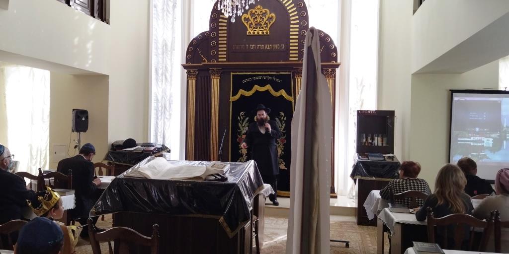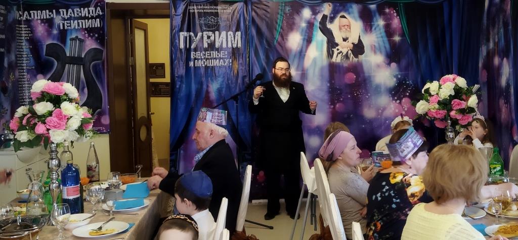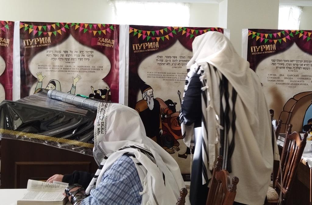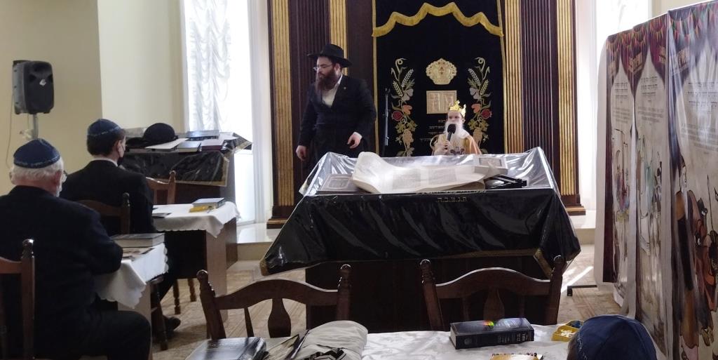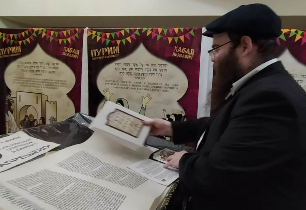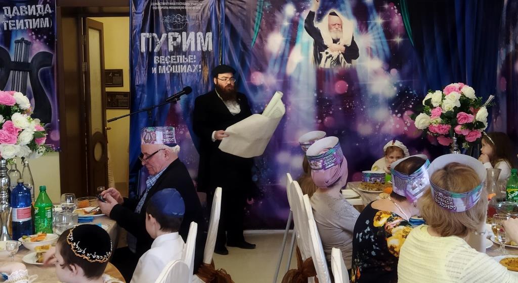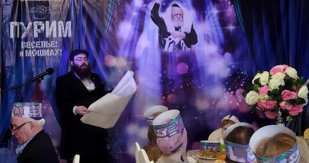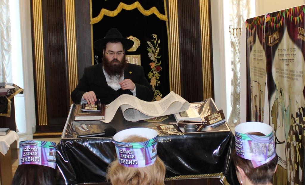 מיד לאחר מכן שמעו בהקשבה מלאה את קריאת המגילה מפי שליח הרבע שליט״א מלך המשיח הרב מנחם מענדל זלמנוב. במהלך הקריאה הוקרן למשתתפים סרט פנטומימה, עם כתוביות ברוסית על סיפור הנס של מרדכי הצדיק. מגילות מרתקות ורעשנים חולקו למשתתפים שהותירו את כולם קשובים ושקטים.