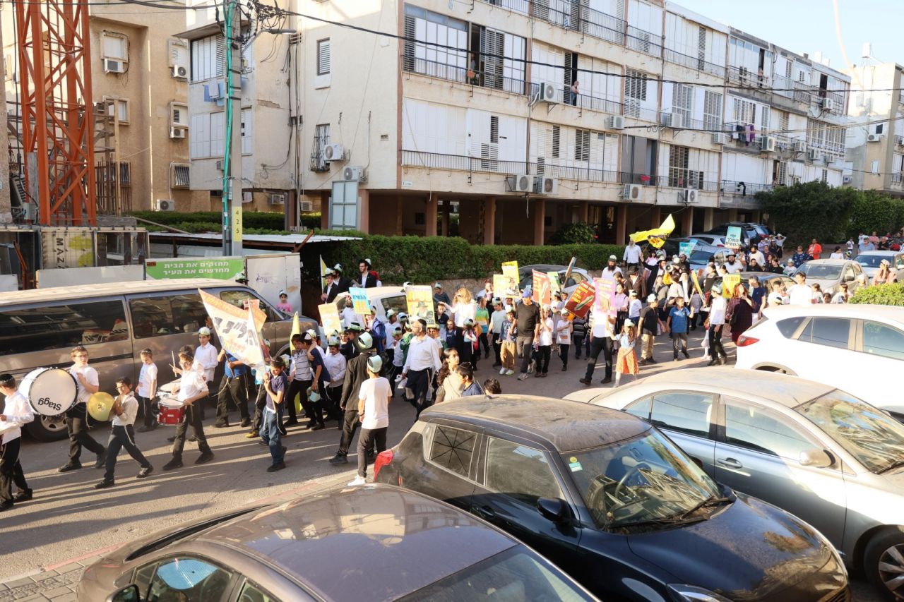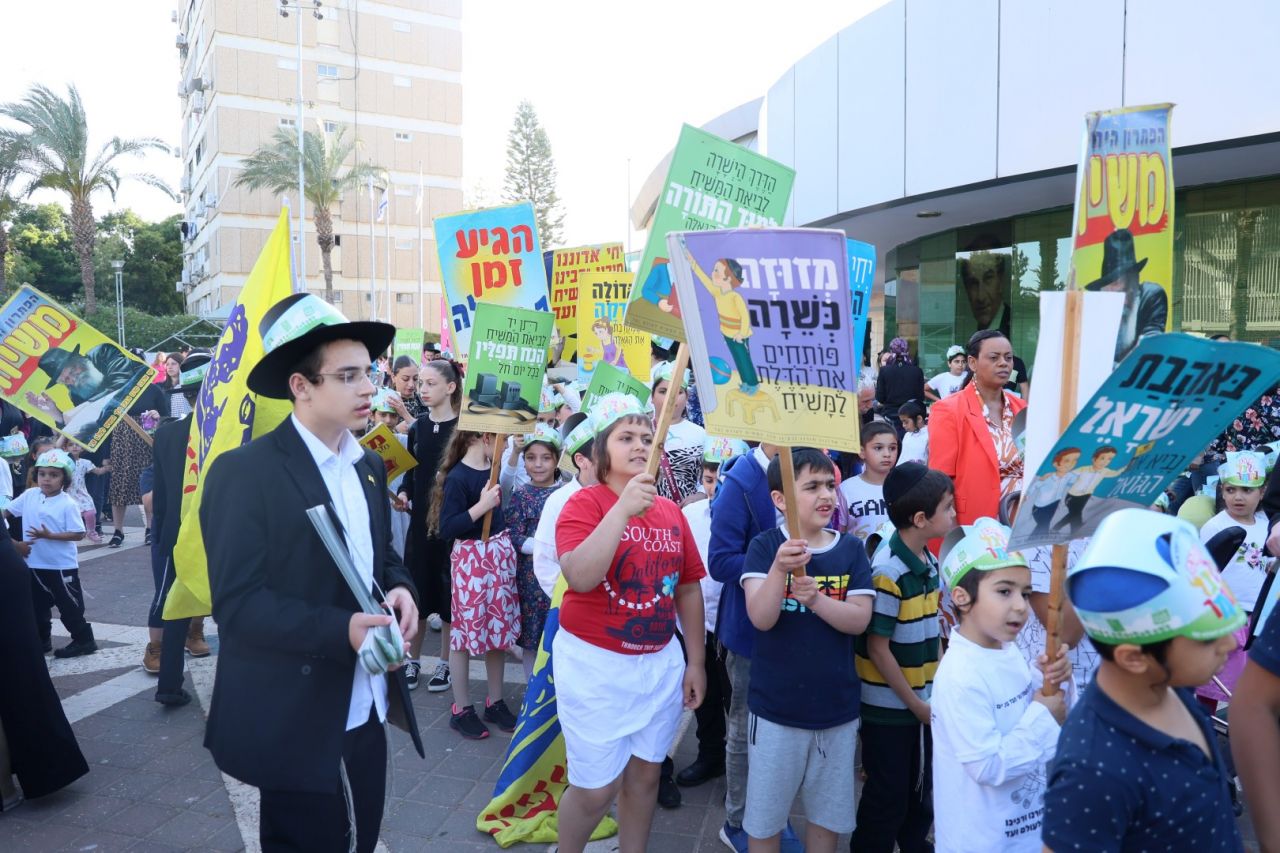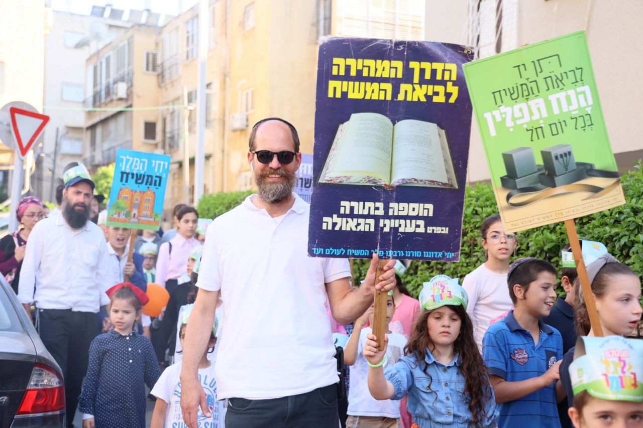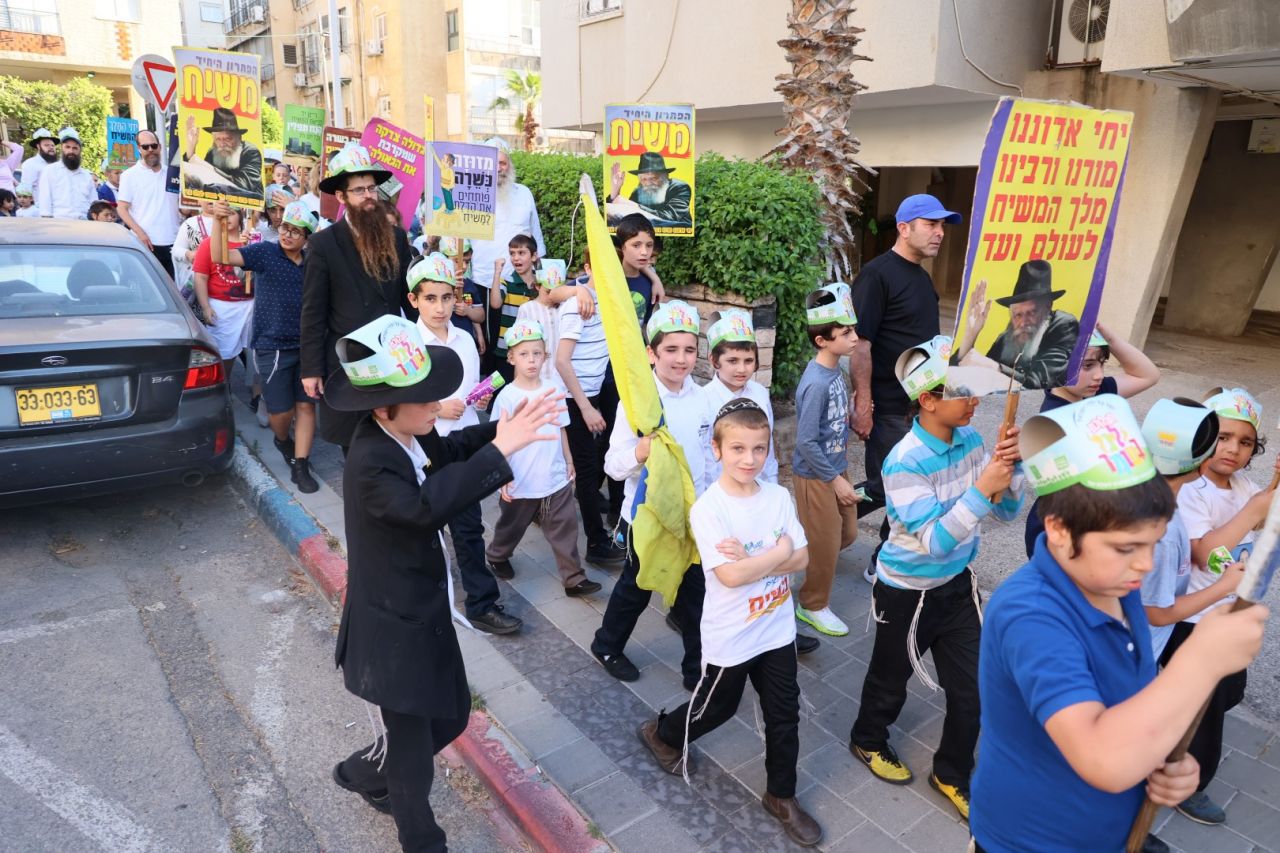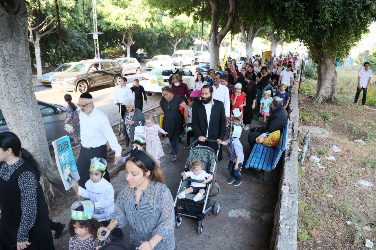 עם סיום נערכו הילדים לצעוד בתהלוכה המסורתית ברחבי העיר, כאשר שלטי המצוות בידיהם לצד דגלי משיח. בראש התהלוכה צעדו להקת מתופפים שהעירו את העיר בקדושה, ולאחריהם בסדר מופתי צעדו המאות הרבות כשאליהם מצטרפים כל העת עוד ועוד תושבים שנפעמו מהמראה.