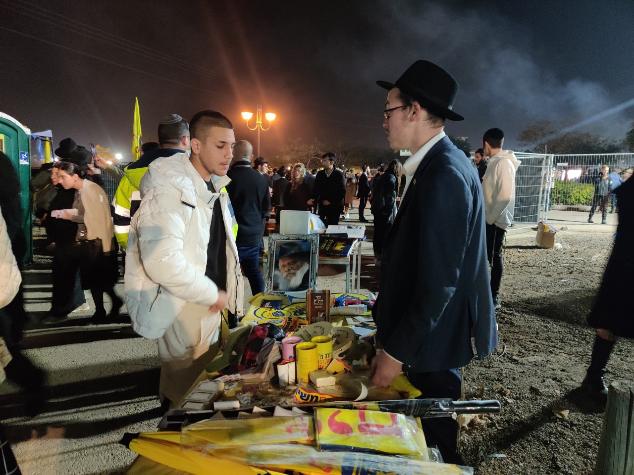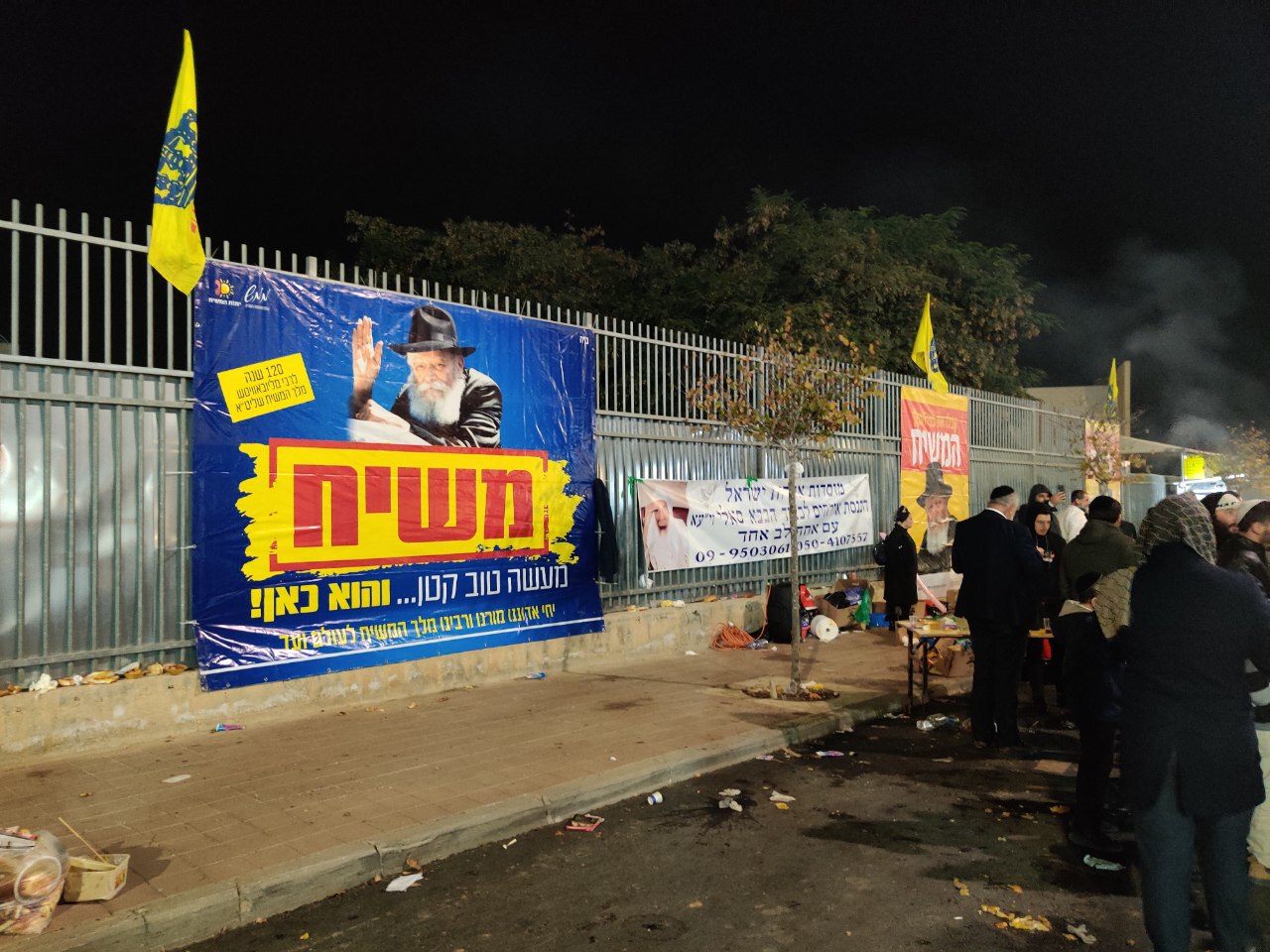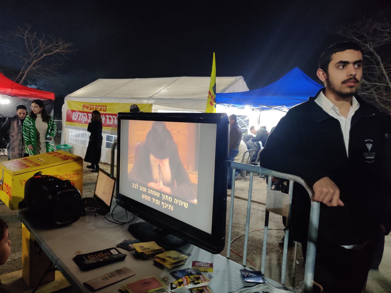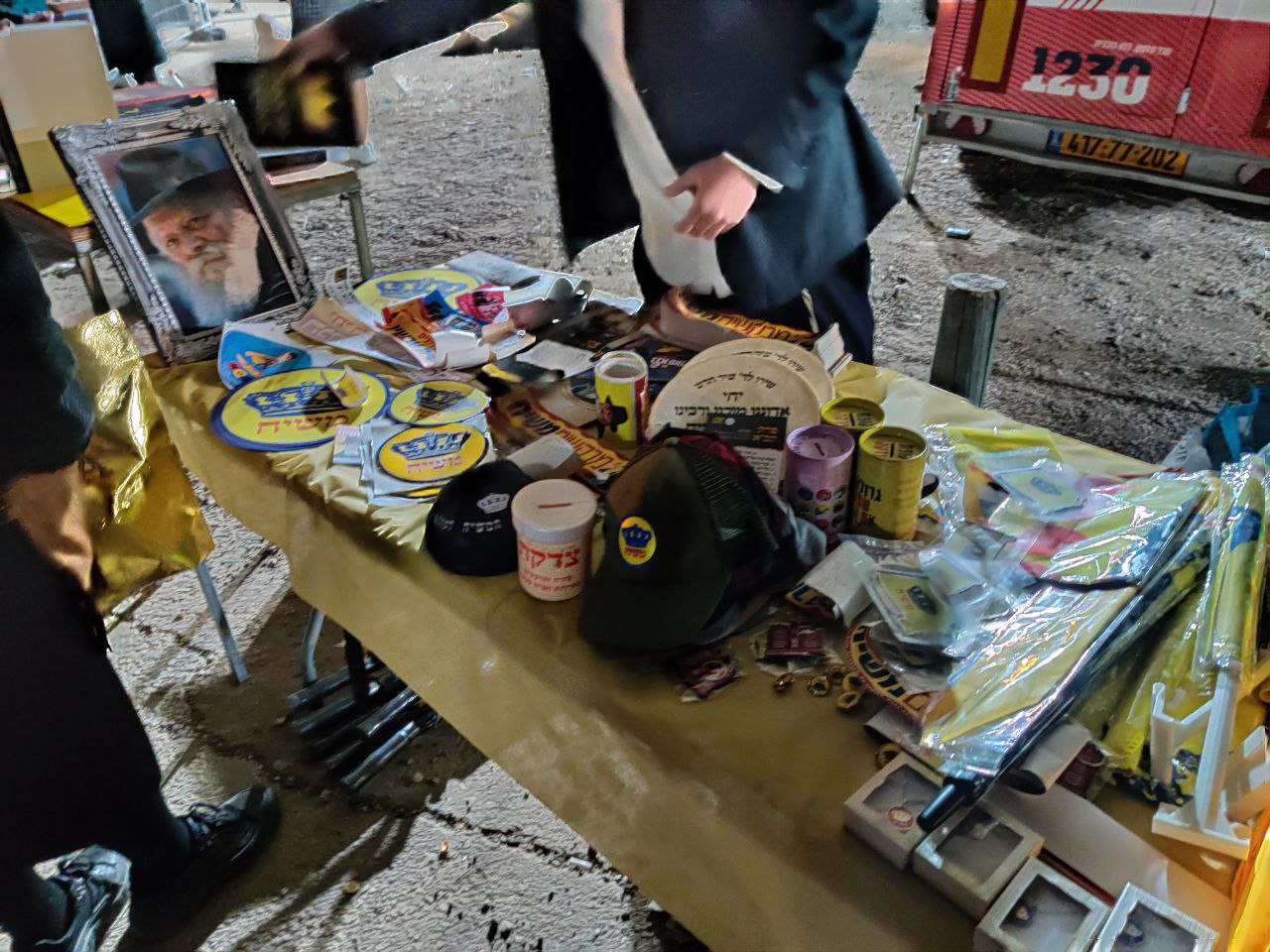 בצד האוהל הוקם דוכן למכירת מוצרי משיח, תמונות של הרבי מלך המשיח שליט"א, כיפות יחי, קופות צדקה ועוד.