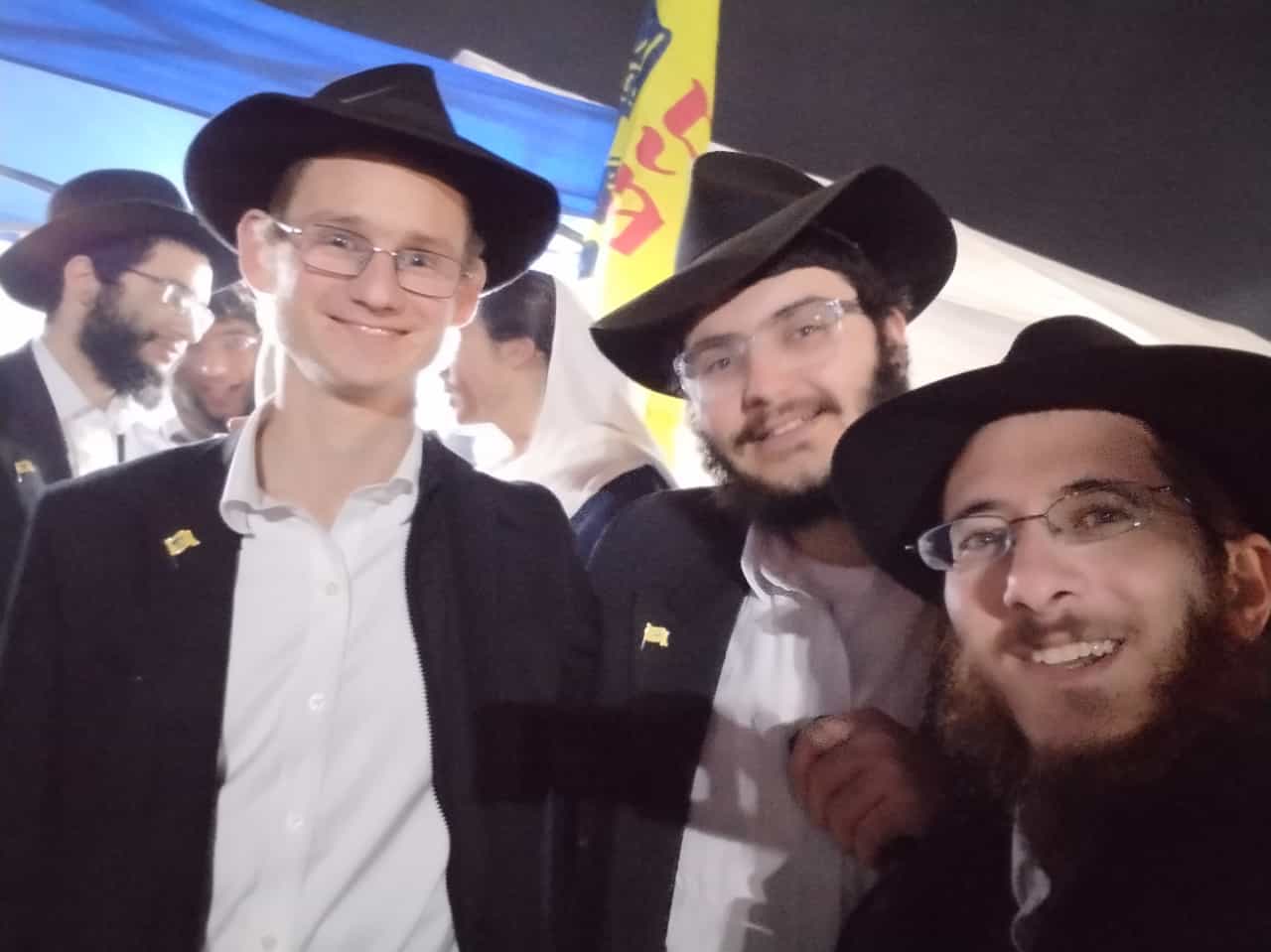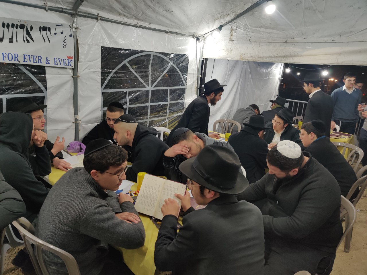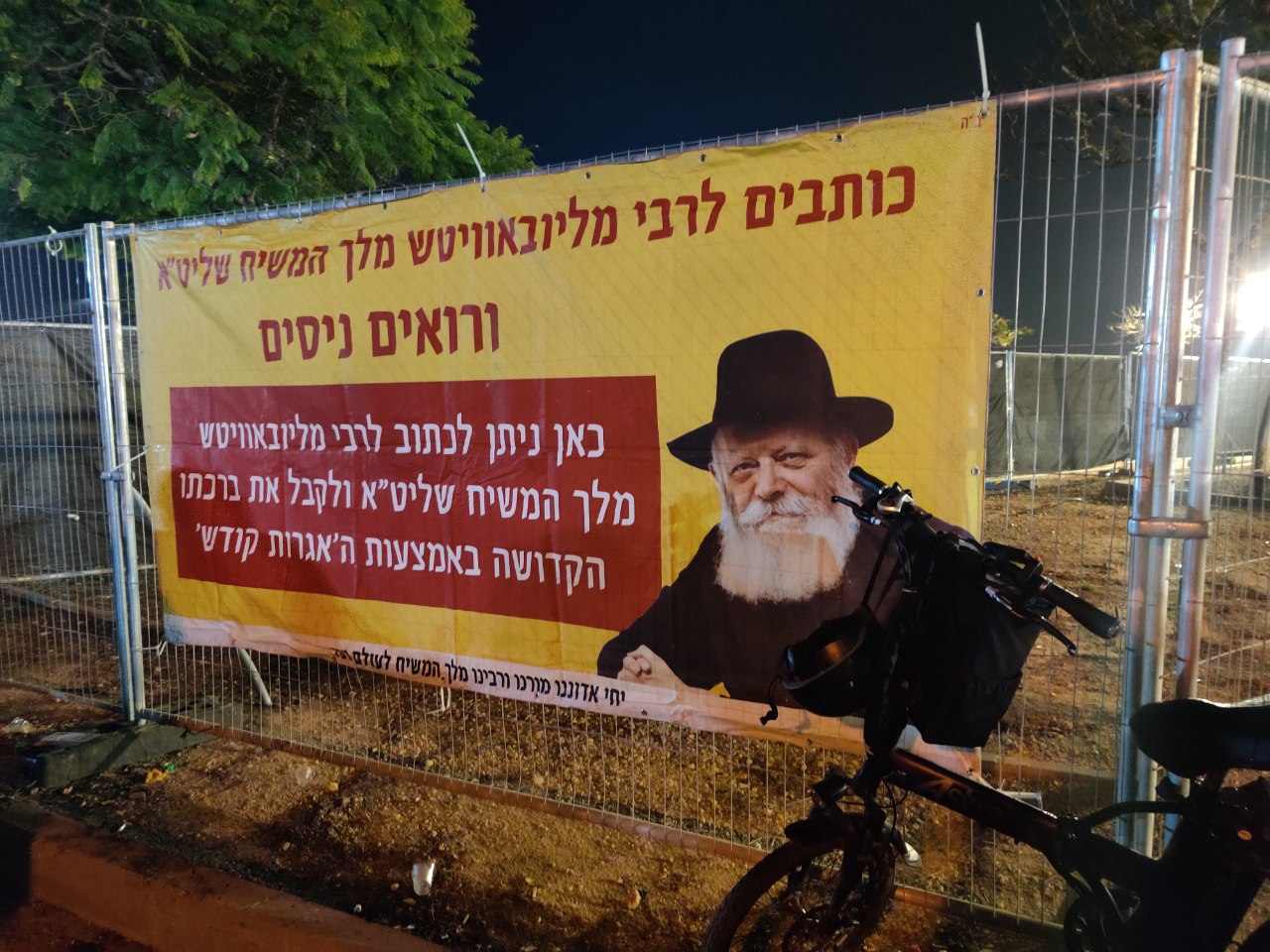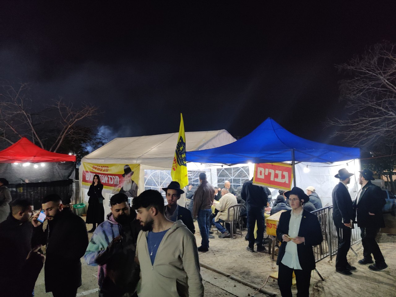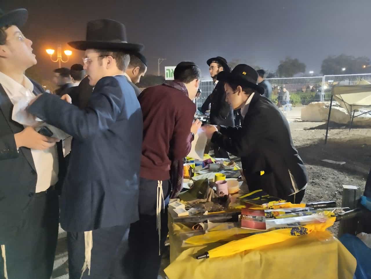 בצד האוהל הוקם דוכן למכירת מוצרי משיח, תמונות של הרבי מלך המשיח שליט"א, כיפות יחי, קופות צדקה ועוד.