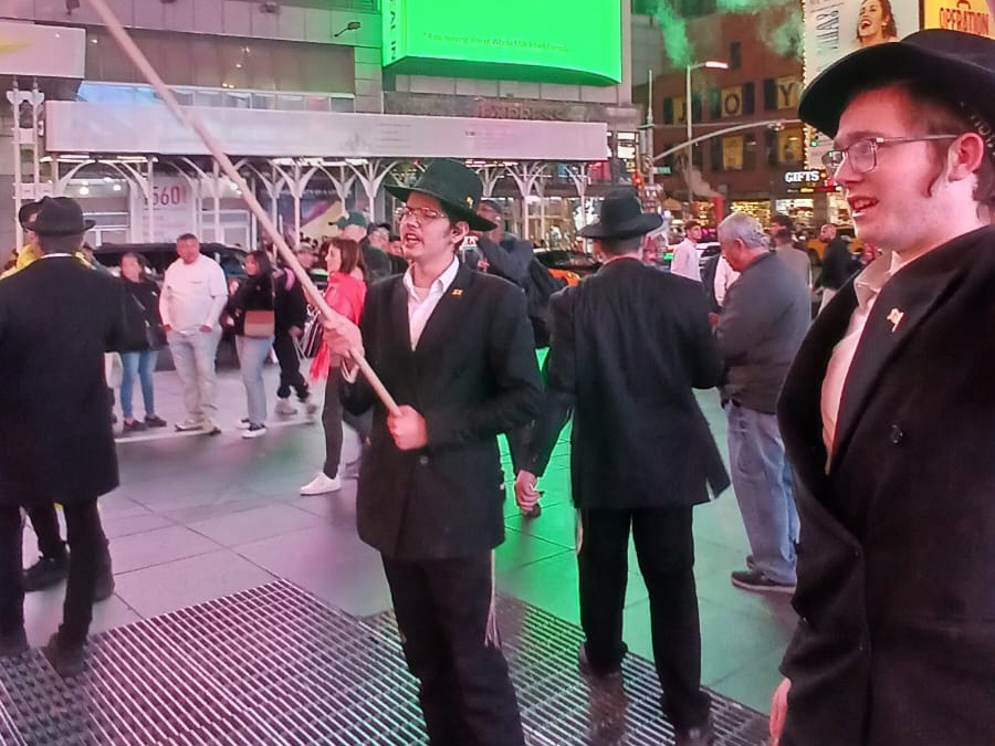 כיכר טיימס סקוויר, הינה אחד המקומות ההורים בעולם כולו. אלפי תיירים גודשים את המקום המואר כשהם מתעדים ומצטלמים למזכרת. כפי שנהוג בשנים האחרונות, יצאו מידי לילה תמימים מ-770 לעריכת שמחת בית השואבה במקום.