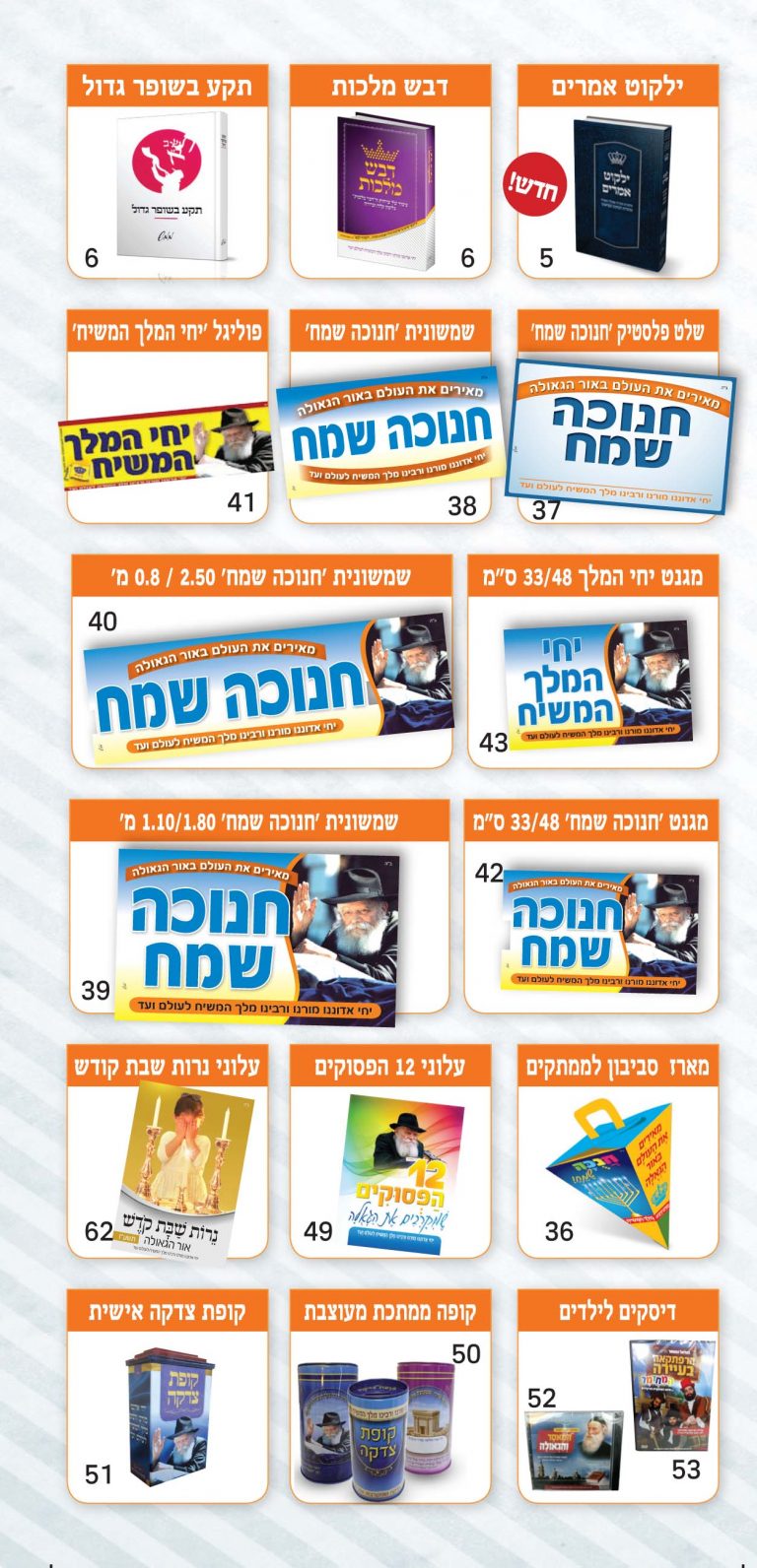 עלוני הסברה חדשים ומרהיבים יצאו לאור השנה, במהדורה מיוחדת לילדים ולמבוגרים. בעלונים כל המידע הנצרך לחנוכה, ביחד עם לוח החג והסבר כיצד מדליקים נרות חנוכה ואת שאר מצוות החג. בנוסף פוסטרים צבעוניים לקישוט הרכבים, מגנטים גדולים לרכבים ושלטים מסוגים שונים. ערכות החנוכיה למבצעים של ממש כבר עשו להם שם דבר, כאשר גב החנוכיה מודפס בטכנולוגיה ייחודית ללא החריטות המיושנות, בנוסף קיימת גם הערכת מהדרין בה דולקים הנרות כשעה ללא חשש הקיים עם הנרות הקטנים. כפי הוראתו של הרבי מלך המשיח שליט"א, גם החנוכיות הגדולות של ממש הם הבלעדיות בצורה אלכסונית משולשת, בכדי להזכיר את מנורת המקדש הטהורה. בנוסף לכך ניתן להשיג סביבונים, אמצעי הדלקה ועזרי הפצה נוספים ומגוונים שיסייעו לכם להגביר את האור ולהדביר את חושך הגלות בגאולה האמיתית והשלימה תיכף ומיד ממש. יש לציין כי שלוחים ופעילים רבים, הגיעו לבקר ביריד המיוחד – 'שוק חנוכה' – המתקיים במחסני ממש בבני ברק בין השעות 10 בבוקר ועד ל5 אחר-הצהרים. לפרטים נוספים והזמנות: 077.5123.770